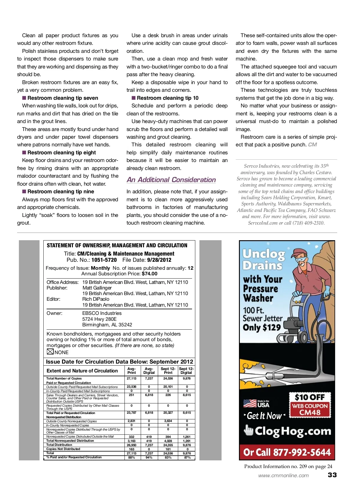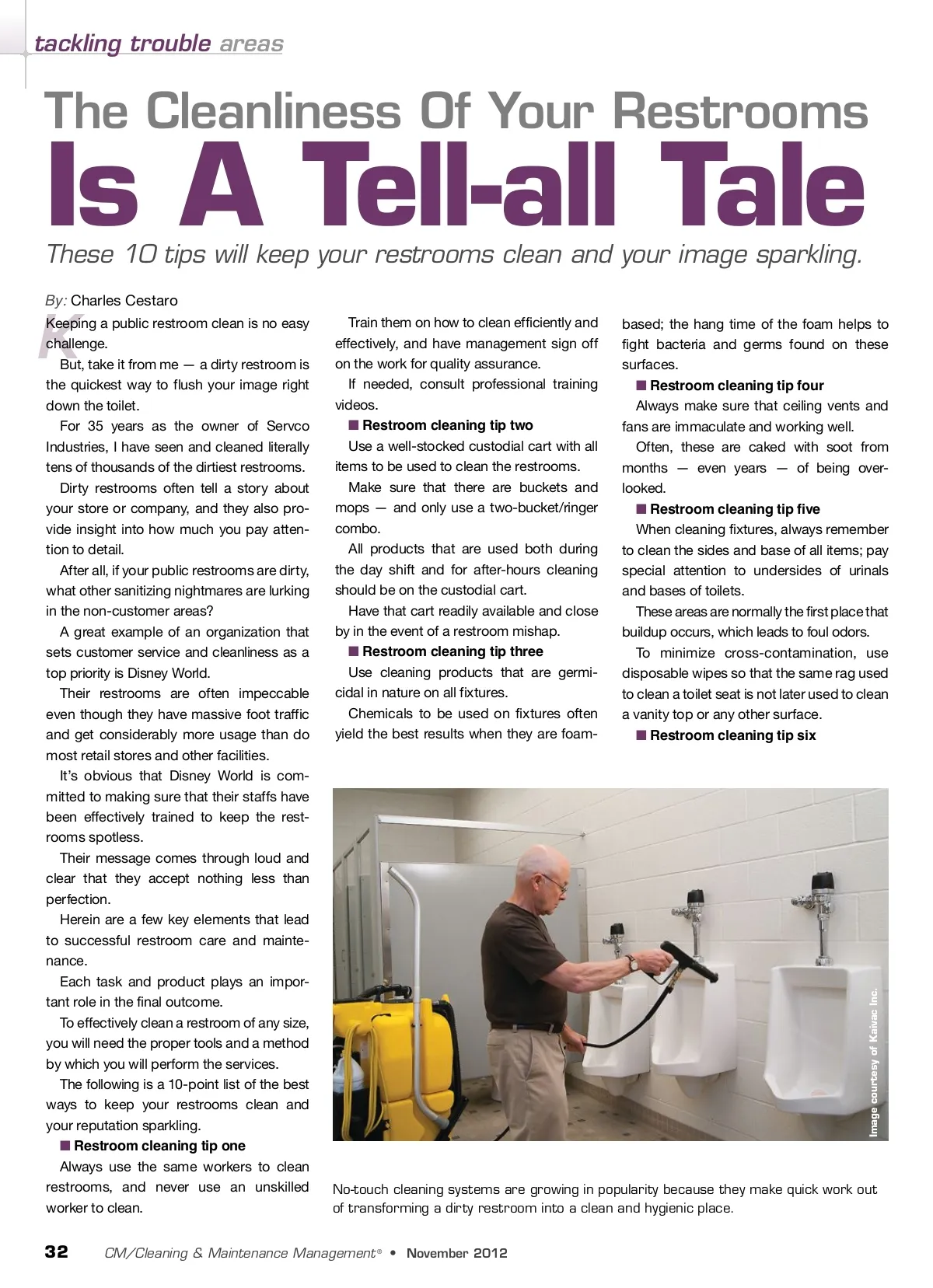 tackling trouble areas The Cleanliness Of Your Restrooms These 10 tips will keep your restrooms clean and your image sparkling. By: Charles Cestaro Is A Tell-all Tale Keeping a public restroom clean is no easy challenge. But, take it from me — a dirty restroom is the quickest way to flush your image right down the toilet. For 35 years as the owner of Servco Industries, I have seen and cleaned literally tens of thousands of the dirtiest restrooms. Dirty restrooms often tell a story about your store or company, and they also pro-vide insight into how much you pay atten-tion to detail. After all, if your public restrooms are dirty, what other sanitizing nightmares are lurking in the non-customer areas? A great example of an organization that sets customer service and cleanliness as a top priority is Disney World. Their restrooms are often impeccable even though they have massive foot traffic and get considerably more usage than do most retail stores and other facilities. It’s obvious that Disney World is com-mitted to making sure that their staffs have been effectively trained to keep the rest-rooms spotless. Their message comes through loud and clear that they accept nothing less than perfection. Herein are a few key elements that lead to successful restroom care and mainte-nance. Each task and product plays an impor-tant role in the final outcome. To effectively clean a restroom of any size, you will need the proper tools and a method by which you will perform the services. The following is a 10-point list of the best ways to keep your restrooms clean and your reputation sparkling. ■ Restroom cleaning tip one Always use the same workers to clean restrooms, and never use an unskilled worker to clean. Train them on how to clean efficiently and effectively, and have management sign off on the work for quality assurance. If needed, consult professional training videos. ■ Restroom cleaning tip two Use a well-stocked custodial cart with all items to be used to clean the restrooms. Make sure that there are buckets and mops — and only use a two-bucket/ringer combo. All products that are used both during the day shift and for after-hours cleaning should be on the custodial cart. Have that cart readily available and close by in the event of a restroom mishap. ■ Restroom cleaning tip three Use cleaning products that are germi-cidal in nature on all fixtures. Chemicals to be used on fixtures often yield the best results when they are foam-based; the hang time of the foam helps to fight bacteria and germs found on these surfaces. ■ Restroom cleaning tip four Always make sure that ceiling vents and fans are immaculate and working well. Often, these are caked with soot from months — even years — of being over-looked. ■ Restroom cleaning tip five When cleaning fixtures, always remember to clean the sides and base of all items; pay special attention to undersides of urinals and bases of toilets. These areas are normally the first place that buildup occurs, which leads to foul odors. To minimize cross-contamination, use disposable wipes so that the same rag used to clean a toilet seat is not later used to clean a vanity top or any other surface. ■ Restroom cleaning tip six K No-touch cleaning systems are growing in popularity because they make quick work out of transforming a dirty restroom into a clean and hygienic place. 32 CM/Cleaning & Maintenance Management ® • November 2012 Image courtesy of Kaivac Inc.