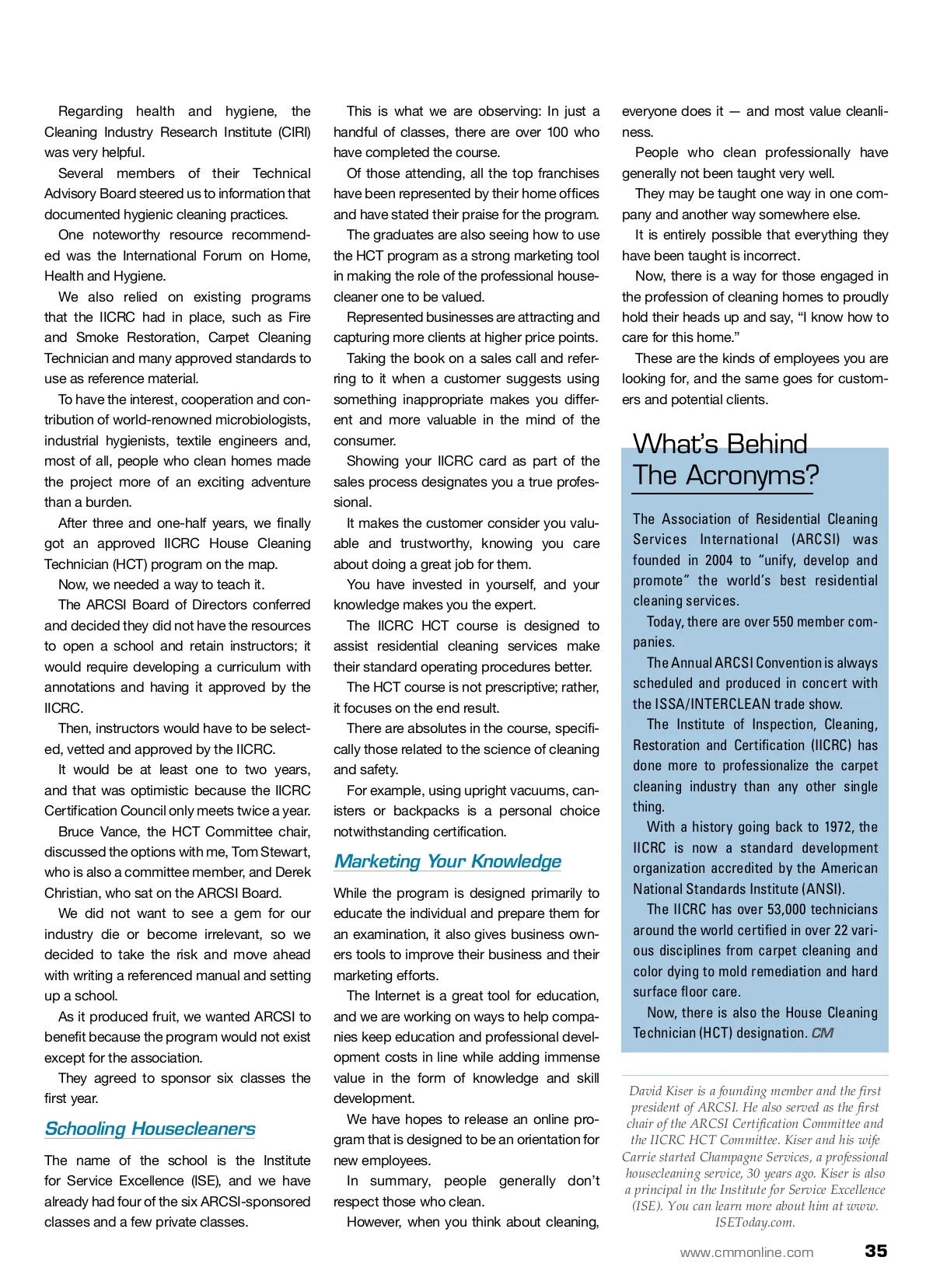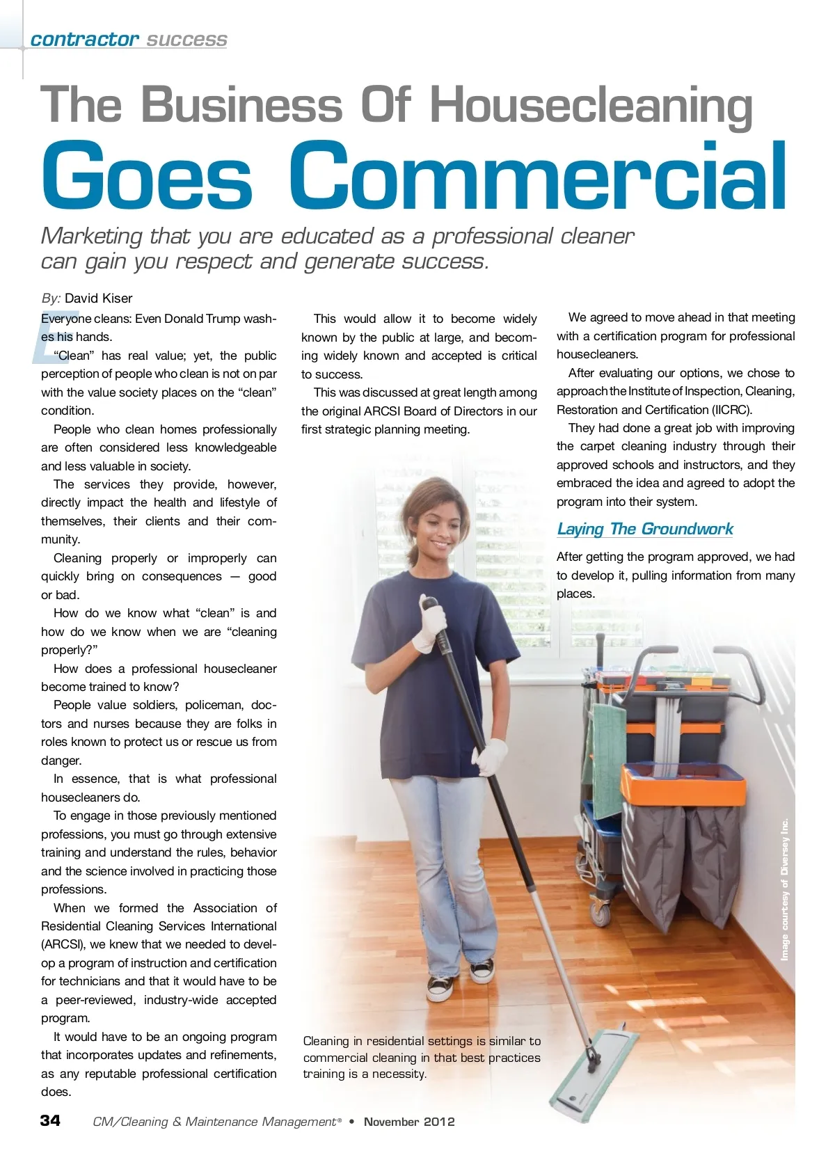 contractor success The Business Of Housecleaning Marketing that you are educated as a professional cleaner can gain you respect and generate success. By: David Kiser Goes Commercial Everyone cleans: Even Donald Trump wash-es his hands. “Clean” has real value; yet, the public perception of people who clean is not on par with the value society places on the “clean” condition. People who clean homes professionally are often considered less knowledgeable and less valuable in society. The services they provide, however, directly impact the health and lifestyle of themselves, their clients and their com-munity. Cleaning properly or improperly can quickly bring on consequences — good or bad. How do we know what “clean” is and how do we know when we are “cleaning properly?” How does a professional housecleaner become trained to know? People value soldiers, policeman, doc-tors and nurses because they are folks in roles known to protect us or rescue us from danger. In essence, that is what professional housecleaners do. To engage in those previously mentioned professions, you must go through extensive training and understand the rules, behavior and the science involved in practicing those professions. When we formed the Association of Residential Cleaning Services International (ARCSI), we knew that we needed to devel-op a program of instruction and certification for technicians and that it would have to be a peer-reviewed, industry-wide accepted program. It would have to be an ongoing program that incorporates updates and refinements, as any reputable professional certification does. This would allow it to become widely known by the public at large, and becom-ing widely known and accepted is critical to success. This was discussed at great length among the original ARCSI Board of Directors in our first strategic planning meeting. We agreed to move ahead in that meeting with a certification program for professional housecleaners. After evaluating our options, we chose to approach the Institute of Inspection, Cleaning, Restoration and Certification (IICRC). They had done a great job with improving the carpet cleaning industry through their approved schools and instructors, and they embraced the idea and agreed to adopt the program into their system. E Laying The Groundwork After getting the program approved, we had to develop it, pulling information from many places. Cleaning in residential settings is similar to commercial cleaning in that best practices training is a necessity. 34 CM/Cleaning & Maintenance Management ® • November 2012 Image courtesy of Diversey Inc.