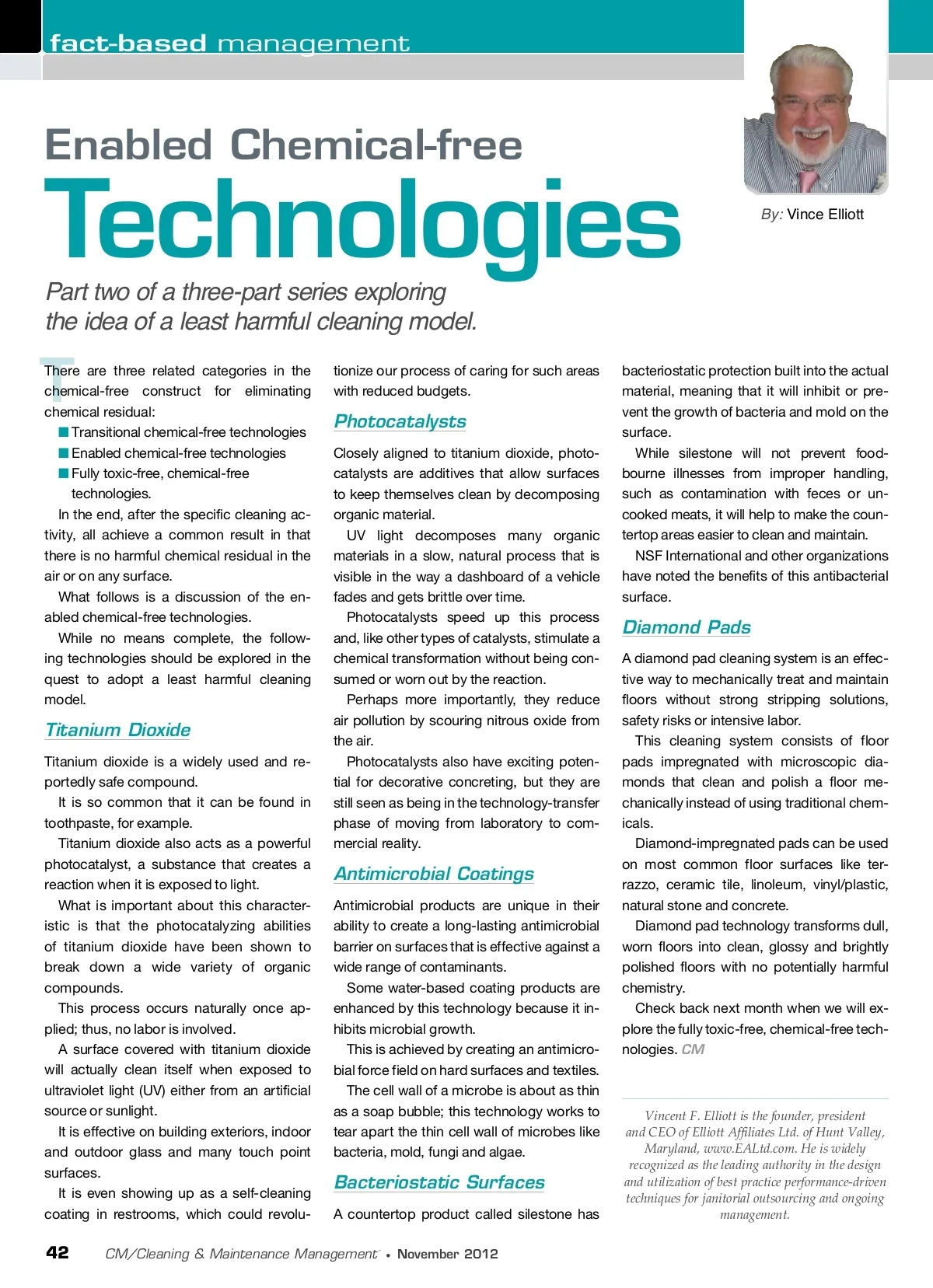 fact-based management Enabled Chemical-free Technologies Part two of a three-part series exploring the idea of a least harmful cleaning model. There are three related categories in the chemical-free construct for eliminating chemical residual: ■ Transitional chemical-free technologies ■ Enabled chemical-free technologies ■ Fully toxic-free, chemical-free technologies. In the end, after the specific cleaning ac-tivity, all achieve a common result in that there is no harmful chemical residual in the air or on any surface. What follows is a discussion of the en-abled chemical-free technologies. While no means complete, the follow-ing technologies should be explored in the quest to adopt a least harmful cleaning model. By: Vince Elliott T tionize our process of caring for such areas with reduced budgets. Photocatalysts Closely aligned to titanium dioxide, photo-catalysts are additives that allow surfaces to keep themselves clean by decomposing organic material. UV light decomposes many organic materials in a slow, natural process that is visible in the way a dashboard of a vehicle fades and gets brittle over time. Photocatalysts speed up this process and, like other types of catalysts, stimulate a chemical transformation without being con-sumed or worn out by the reaction. Perhaps more importantly, they reduce air pollution by scouring nitrous oxide from the air. Photocatalysts also have exciting poten-tial for decorative concreting, but they are still seen as being in the technology-transfer phase of moving from laboratory to com-mercial reality. bacteriostatic protection built into the actual material, meaning that it will inhibit or pre-vent the growth of bacteria and mold on the surface. While silestone will not prevent food-bourne illnesses from improper handling, such as contamination with feces or un-cooked meats, it will help to make the coun-tertop areas easier to clean and maintain. NSF International and other organizations have noted the benefits of this antibacterial surface. Diamond Pads A diamond pad cleaning system is an effec-tive way to mechanically treat and maintain floors without strong stripping solutions, safety risks or intensive labor. This cleaning system consists of floor pads impregnated with microscopic dia-monds that clean and polish a floor me-chanically instead of using traditional chem-icals. Diamond-impregnated pads can be used on most common floor surfaces like ter-razzo, ceramic tile, linoleum, vinyl/plastic, natural stone and concrete. Diamond pad technology transforms dull, worn floors into clean, glossy and brightly polished floors with no potentially harmful chemistry. Check back next month when we will ex-plore the fully toxic-free, chemical-free tech-nologies. CM Titanium Dioxide Titanium dioxide is a widely used and re-portedly safe compound. It is so common that it can be found in toothpaste, for example. Titanium dioxide also acts as a powerful photocatalyst, a substance that creates a reaction when it is exposed to light. What is important about this character-istic is that the photocatalyzing abilities of titanium dioxide have been shown to break down a wide variety of organic compounds. This process occurs naturally once ap-plied; thus, no labor is involved. A surface covered with titanium dioxide will actually clean itself when exposed to ultraviolet light (UV) either from an artificial source or sunlight. It is effective on building exteriors, indoor and outdoor glass and many touch point surfaces. It is even showing up as a self-cleaning coating in restrooms, which could revolu-Antimicrobial Coatings Antimicrobial products are unique in their ability to create a long-lasting antimicrobial barrier on surfaces that is effective against a wide range of contaminants. Some water-based coating products are enhanced by this technology because it in-hibits microbial growth. This is achieved by creating an antimicro-bial force field on hard surfaces and textiles. The cell wall of a microbe is about as thin as a soap bubble; this technology works to tear apart the thin cell wall of microbes like bacteria, mold, fungi and algae. Bacteriostatic Surfaces A countertop product called silestone has Vincent F. Elliott is the founder, president and CEO of Elliott Affiliates Ltd. of Hunt Valley, Maryland, www.EALtd.com. He is widely recognized as the leading authority in the design and utilization of best practice performance-driven techniques for janitorial outsourcing and ongoing management. 42 CM/Cleaning & Maintenance Management ® • November 2012