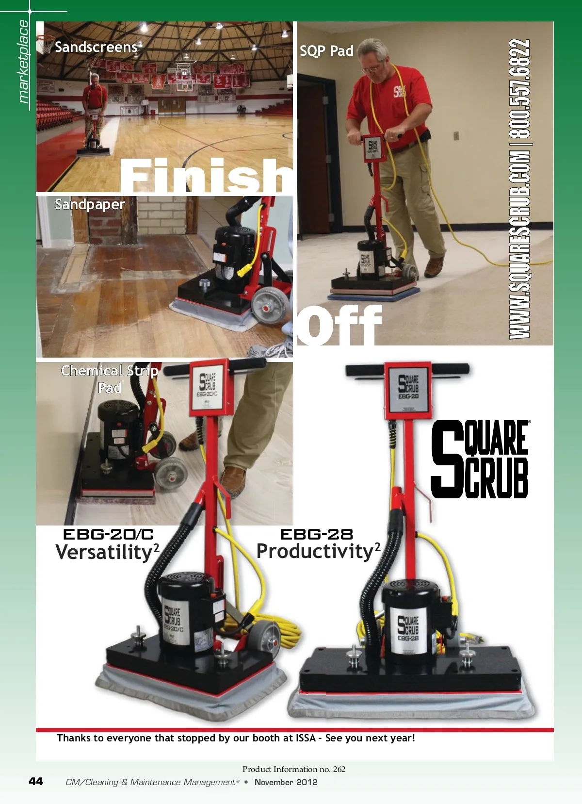 marketplace Sandscreens SQP Pad Sandpaper Chemical Strip Pad ® EBG-20/C Versatility 2 EBG-28 Productivity 2 Thanks to everyone that stopped by our booth at ISSA -See you next year! Product Information no. 262 44 CM/Cleaning & Maintenance Management ® • November 2012