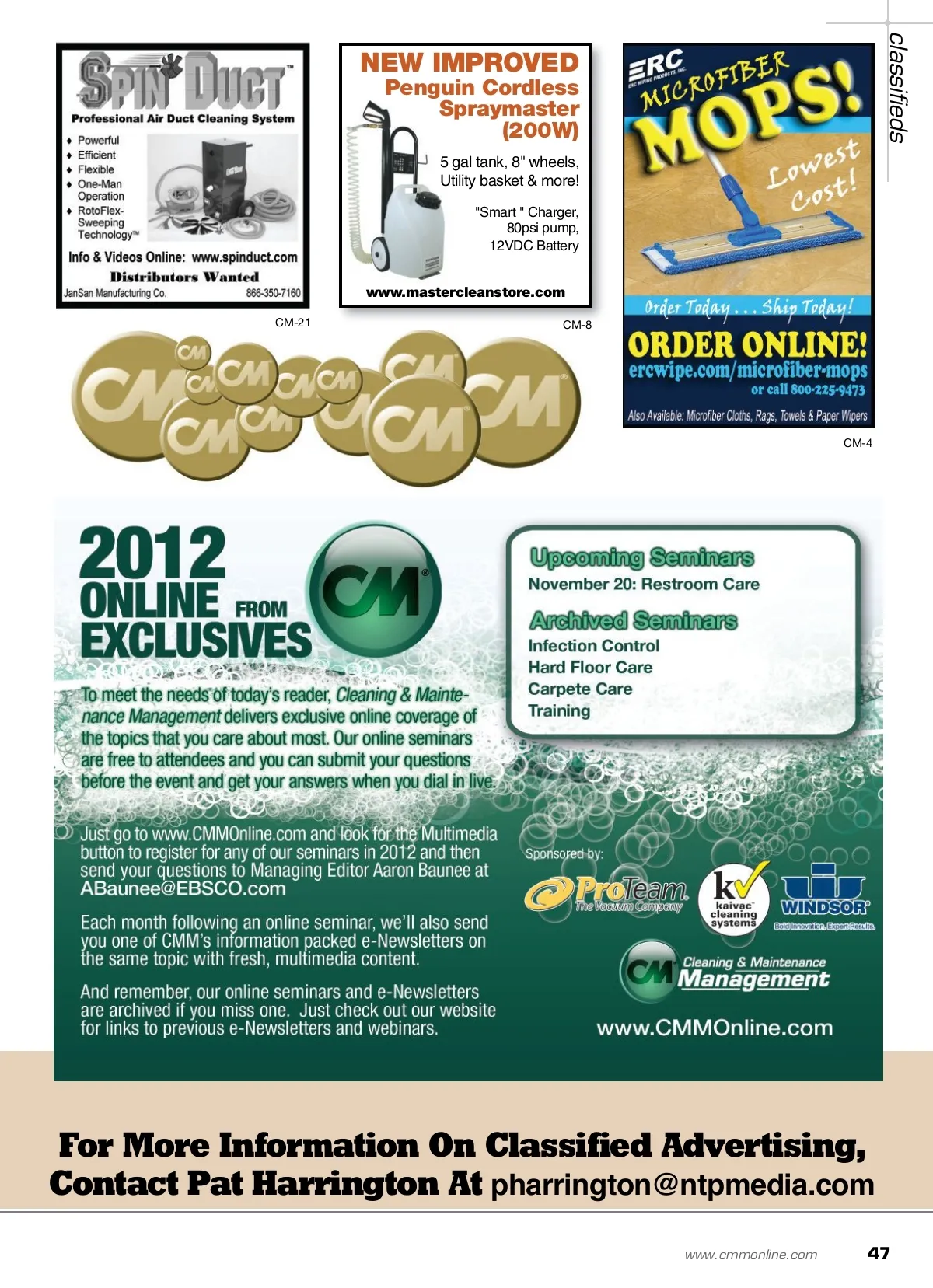 marketplace Product Information no. 260 ATTENTION ROTARY & OP USERS! Bonnet Pro and Tuway American Group have teamed up to provide you with US made bonnets with fresh NEW designs to help you meet your cleaning challenges. Whether you’re dealing with wicking and heavy soil or just need to freshen up the carpet, the ProCotton Series has just the pad you need. The new designs and material combinations comb through the carpets fi bers for better soil removal. They are made in the US and have a heavy duty over bound edge for better quality. Go to bonnetpro.com , under BONNETS , to see the video of these pads being manufactured. 32 Different sizes and varieties of bonnets and Revive pads in stock, including 21” Finally Something New – US Made Bonnets Buy a sample pack, 2 of each style, at bonnetpro.com 46 CM/Cleaning & Maintenance Management ® • November 2012 877-477-1615 | 215-723-5330