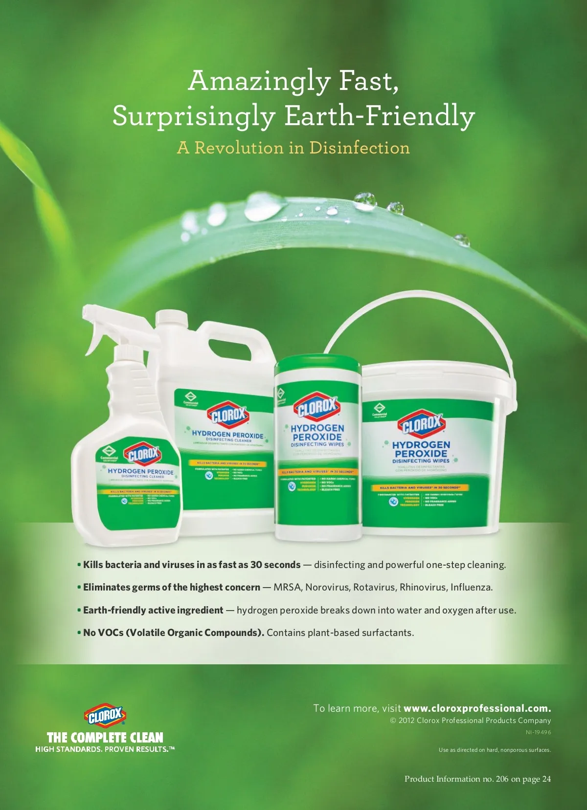 Amazingly Fast, Surprisingly Earth-Friendly A Revolution in Disinfection • Kills bacteria and viruses in as fast as 30 seconds — disinfecting and powerful one-step cleaning. • Eliminates germs of the highest concern — MRSA, Norovirus, Rotavirus, Rhinovirus, Influenza. • Earth-friendly active ingredient — hydrogen peroxide breaks down into water and oxygen after use. • No VOCs (Volatile Organic Compounds). Contains plant-based surfactants. To learn more, visit www.cloroxprofessional.com. © 2012 Clorox Professional Products Company NI-19496 Use as directed on hard, nonporous surfaces. Product Information no. 206 on page 24