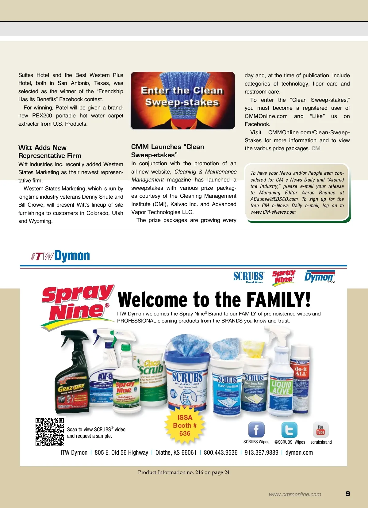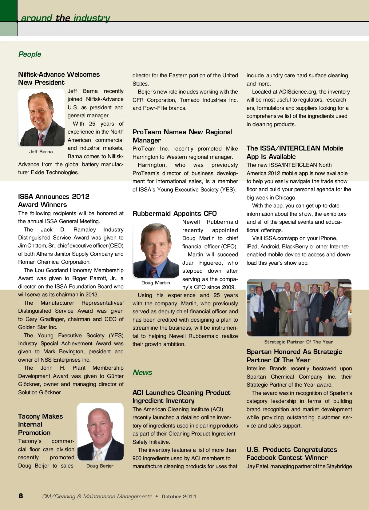around the industry People Nilfisk-Advance Welcomes New President Jeff Barna recently joined Nilfisk-Advance U.S. as president and general manager. With 25 years of experience in the North American commercial and industrial markets, Jeff Barna Barna comes to Nilfisk-Advance from the global battery manufac-turer Exide Technologies. director for the Eastern portion of the United States. Berjer’s new role includes working with the CFR Corporation, Tornado Industries Inc. and Powr-Flite brands. include laundry care hard surface cleaning and more. Located at ACIScience.org, the inventory will be most useful to regulators, research-ers, formulators and suppliers looking for a comprehensive list of the ingredients used in cleaning products. ProTeam Names New Regional Manager ProTeam Inc. recently promoted Mike Harrington to Western regional manager. Harrington, who was previously ProTeam’s director of business develop-ment for international sales, is a member of ISSA’s Young Executive Society (YES). The ISSA/INTERCLEAN Mobile App Is Available The new ISSA/INTERCLEAN North America 2012 mobile app is now available to help you easily navigate the trade show floor and build your personal agenda for the big week in Chicago. With the app, you can get up-to-date information about the show, the exhibitors and all of the special events and educa-tional offerings. Visit ISSA.com/app on your iPhone, iPad, Android, BlackBerry or other Internet-enabled mobile device to access and down-load this year’s show app. ISSA Announces 2012 Award Winners The following recipients will be honored at the annual ISSA General Meeting. The Jack D. Ramaley Industry Distinguished Service Award was given to Jim Chittom, Sr., chief executive officer (CEO) of both Athens Janitor Supply Company and Roman Chemical Corporation. The Lou Goorland Honorary Membership Award was given to Roger Parrott, Jr., a director on the ISSA Foundation Board who will serve as its chairman in 2013. The Manufacturer Representatives’ Distinguished Service Award was given to Gary Gradinger, chairman and CEO of Golden Star Inc. The Young Executive Society (YES) Industry Special Achievement Award was given to Mark Bevington, president and owner of NSS Enterprises Inc. The John H. Plant Membership Development Award was given to Günter Glöckner, owner and managing director of Solution Glöckner. Rubbermaid Appoints CFO Newell Rubbermaid recently appointed Doug Martin to chief financial officer (CFO). Martin will succeed Juan Figuereo, who stepped down after serving as the compa-Doug Martin ny’s CFO since 2009. Using his experience and 25 years with the company, Martin, who previously served as deputy chief financial officer and has been credited with designing a plan to streamline the business, will be instrumen-tal to helping Newell Rubbermaid realize their growth ambition. Strategic Partner Of The Year Spartan Honored As Strategic Partner Of The Year News ACI Launches Cleaning Product Ingredient Inventory The American Cleaning Institute (ACI) recently launched a detailed online inven-tory of ingredients used in cleaning products as part of their Cleaning Product Ingredient Safety Initiative. The inventory features a list of more than 900 ingredients used by ACI members to manufacture cleaning products for uses that Tacony Makes Internal Promotion Tacony’s commer-cial floor care division recently promoted Doug Berjer to sales Interline Brands recently bestowed upon Spartan Chemical Company Inc. their Strategic Partner of the Year award. The award was in recognition of Spartan’s category leadership in terms of building brand recognition and market development while providing outstanding customer ser-vice and sales support. U.S. Products Congratulates Facebook Contest Winner Jay Patel, managing partner of the Staybridge Doug Berjer 8 CM/Cleaning & Maintenance Management ® • October 2011
