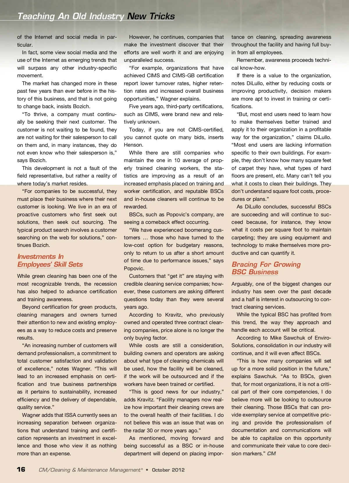 Teaching An Old Industry New Tricks of the Internet and social media in par-ticular. In fact, some view social media and the use of the Internet as emerging trends that will surpass any other industry-specific movement. The market has changed more in these past few years than ever before in the his-tory of this business, and that is not going to change back, insists Bozich. “To thrive, a company must continu-ally be seeking their next customer. The customer is not waiting to be found, they are not waiting for their salesperson to call on them and, in many instances, they do not even know who their salesperson is,” says Bozich. This development is not a fault of the field representative, but rather a reality of where today’s market resides. “For companies to be successful, they must place their business where their next customer is looking. We live in an era of proactive customers who first seek out solutions, then seek out sourcing. The typical product search involves a customer searching on the web for solutions,” con-tinues Bozich. However, he continues, companies that make the investment discover that their efforts are well worth it and are enjoying unparalleled success. “For example, organizations that have achieved CIMS and CIMS-GB certification report lower turnover rates, higher reten-tion rates and increased overall business opportunities,” Wagner explains. Five years ago, third-party certifications, such as CIMS, were brand new and rela-tively unknown. Today, if you are not CIMS-certified, you cannot quote on many bids, inserts Henson. While there are still companies who maintain the one in 10 average of prop-erly trained cleaning workers, the sta-tistics are improving as a result of an increased emphasis placed on training and worker certification, and reputable BSCs and in-house cleaners will continue to be rewarded. BSCs, such as Popovic’s company, are seeing a comeback effect occurring. “We have experienced boomerang cus-tomers … those who have turned to the low-cost option for budgetary reasons, only to return to us after a short amount of time due to performance issues,” says Popovic. Customers that “get it” are staying with credible cleaning service companies; how-ever, these customers are asking different questions today than they were several years ago. According to Kravitz, who previously owned and operated three contract clean-ing companies, price alone is no longer the only buying factor. While costs are still a consideration, building owners and operators are asking about what type of cleaning chemicals will be used, how the facility will be cleaned, if the work will be outsourced and if the workers have been trained or certified. “This is good news for our industry,” adds Kravitz. “Facility managers now real-ize how important their cleaning crews are to the overall health of their facilities. I do not believe this was an issue that was on the radar 30 or more years ago.” As mentioned, moving forward and being successful as a BSC or in-house department will depend on placing impor-tance on cleaning, spreading awareness throughout the facility and having full buy-in from all employees. Remember, awareness proceeds techni-cal know-how. If there is a value to the organization, notes DiLullo, either by reducing costs or improving productivity, decision makers are more apt to invest in training or certi-fications. “But, most end users need to learn how to make themselves better trained and apply it to their organization in a profitable way for the organization,” claims DiLullo. “Most end users are lacking information specific to their own buildings. For exam-ple, they don’t know how many square feet of carpet they have, what types of hard floors are present, etc. Many can’t tell you what it costs to clean their buildings. They don’t understand square foot costs, proce-dures or plans.” As DiLullo concludes, successful BSCs are succeeding and will continue to suc-ceed because, for instance, they know what it costs per square foot to maintain carpeting; they are using equipment and technology to make themselves more pro-ductive and can quantify it. Investments In Employees’ Skill Sets While green cleaning has been one of the most recognizable trends, the recession has also helped to advance certification and training awareness. Beyond certification for green products, cleaning managers and owners turned their attention to new and existing employ-ees as a way to reduce costs and preserve results. “An increasing number of customers will demand professionalism, a commitment to total customer satisfaction and validation of excellence,” notes Wagner. “This will lead to an increased emphasis on certi-fication and true business partnerships as it pertains to sustainability, increased efficiency and the delivery of dependable, quality service.” Wagner adds that ISSA currently sees an increasing separation between organiza-tions that understand training and certifi-cation represents an investment in excel-lence and those who view it as nothing more than an expense. Bracing For Growing BSC Business Arguably, one of the biggest changes our industry has seen over the past decade and a half is interest in outsourcing to con-tract cleaning services. While the typical BSC has profited from this trend, the way they approach and handle each account will be critical. According to Mike Sawchuk of Enviro-Solutions, consolidation in our industry will continue, and it will even affect BSCs. “This is how many companies will set up for a more solid position in the future,” explains Sawchuk. “As to BSCs, given that, for most organizations, it is not a criti-cal part of their core competencies, I do believe more will be looking to outsource their cleaning. Those BSCs that can pro-vide exemplary service at competitive pric-ing and provide the professionalism of documentation and communications will be able to capitalize on this opportuni