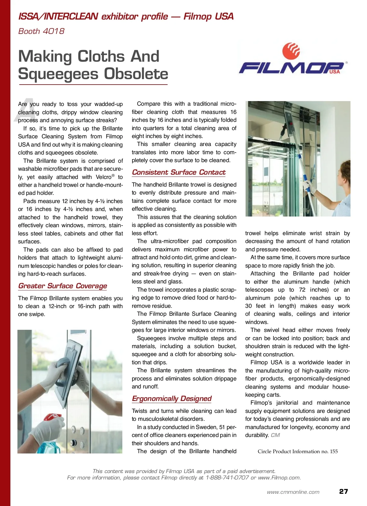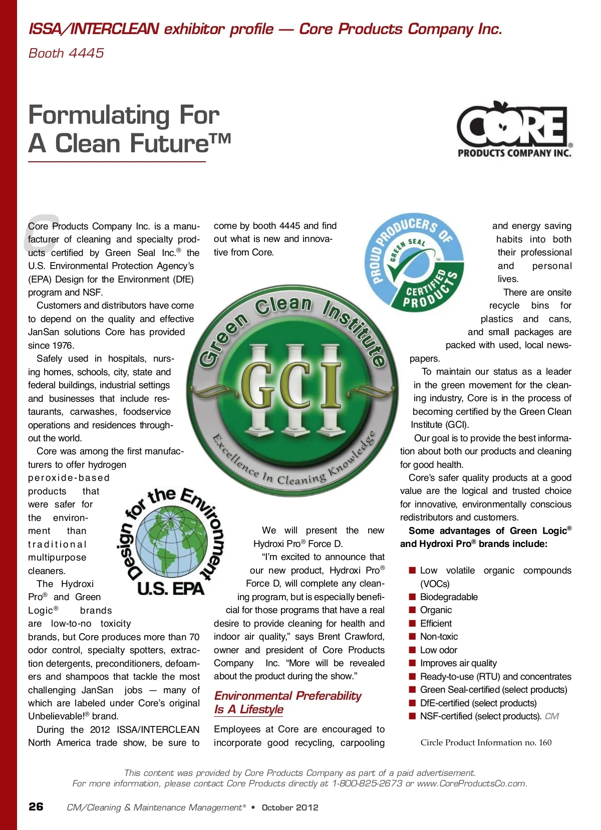 ISSA/INTERCLEAN exhibitor profile — Core Products Company Inc. Booth 4445 Formulating For A Clean Future™ C Core Products Company Inc. is a manu-facturer of cleaning and specialty prod-ucts certified by Green Seal Inc. ® the U.S. Environmental Protection Agency’s (EPA) Design for the Environment (DfE) program and NSF. Customers and distributors have come to depend on the quality and effective JanSan solutions Core has provided since 1976. Safely used in hospitals, nurs-ing homes, schools, city, state and federal buildings, industrial settings and businesses that include res-taurants, carwashes, foodservice operations and residences through-out the world. Core was among the first manufac-turers to offer hydrogen peroxide-based products that were safer for the environ-ment than traditional multipurpose cleaners. The Hydroxi Pro ® and Green brands Logic ® are low-to-no toxicity brands, but Core produces more than 70 odor control, specialty spotters, extrac-tion detergents, preconditioners, defoam-ers and shampoos that tackle the most challenging JanSan jobs — many of which are labeled under Core’s original Unbelievable! ® brand. During the 2012 ISSA/INTERCLEAN North America trade show, be sure to come by booth 4445 and find out what is new and innova-tive from Core. and energy saving habits into both their professional and personal lives. There are onsite recycle bins for plastics and cans, and small packages are packed with used, local news-papers. To maintain our status as a leader in the green movement for the clean-ing industry, Core is in the process of becoming certified by the Green Clean Institute (GCI). Our goal is to provide the best informa-tion about both our products and cleaning for good health. Core’s safer quality products at a good value are the logical and trusted choice for innovative, environmentally conscious redistributors and customers. Some advantages of Green Logic ® and Hydroxi Pro ® brands include: ■ Low volatile organic compounds (VOCs) ■ Biodegradable ■ Organic ■ Efficient ■ Non-toxic ■ Low odor ■ Improves air quality ■ Ready-to-use (RTU) and concentrates ■ Green Seal-certified (select products) ■ DfE-certified (select products) ■ NSF-certified (select products). CM Circle Product Information no. 160 We will present the new Hydroxi Pro ® Force D. “I’m excited to announce that our new product, Hydroxi Pro ® Force D, will complete any clean-ing program, but is especially benefi-cial for those programs that have a real desire to provide cleaning for health and indoor air quality,” says Brent Crawford, owner and president of Core Products Company Inc. “More will be revealed about the product during the show.” Environmental Preferability Is A Lifestyle Employees at Core are encouraged to incorporate good recycling, carpooling This content was provided by Core Products Company as part of a paid advertisement. For more information, please contact Core Products directly at 1-800-825-2673 or www.CoreProductsCo.com. 26 CM/Cleaning & Maintenance Management ® • October 2012