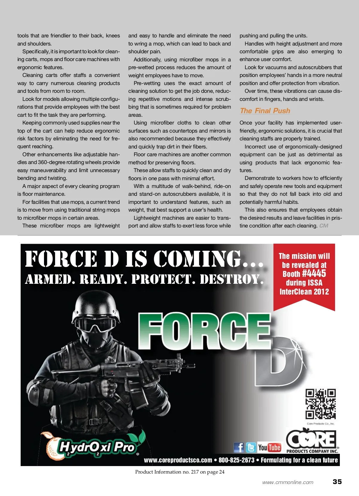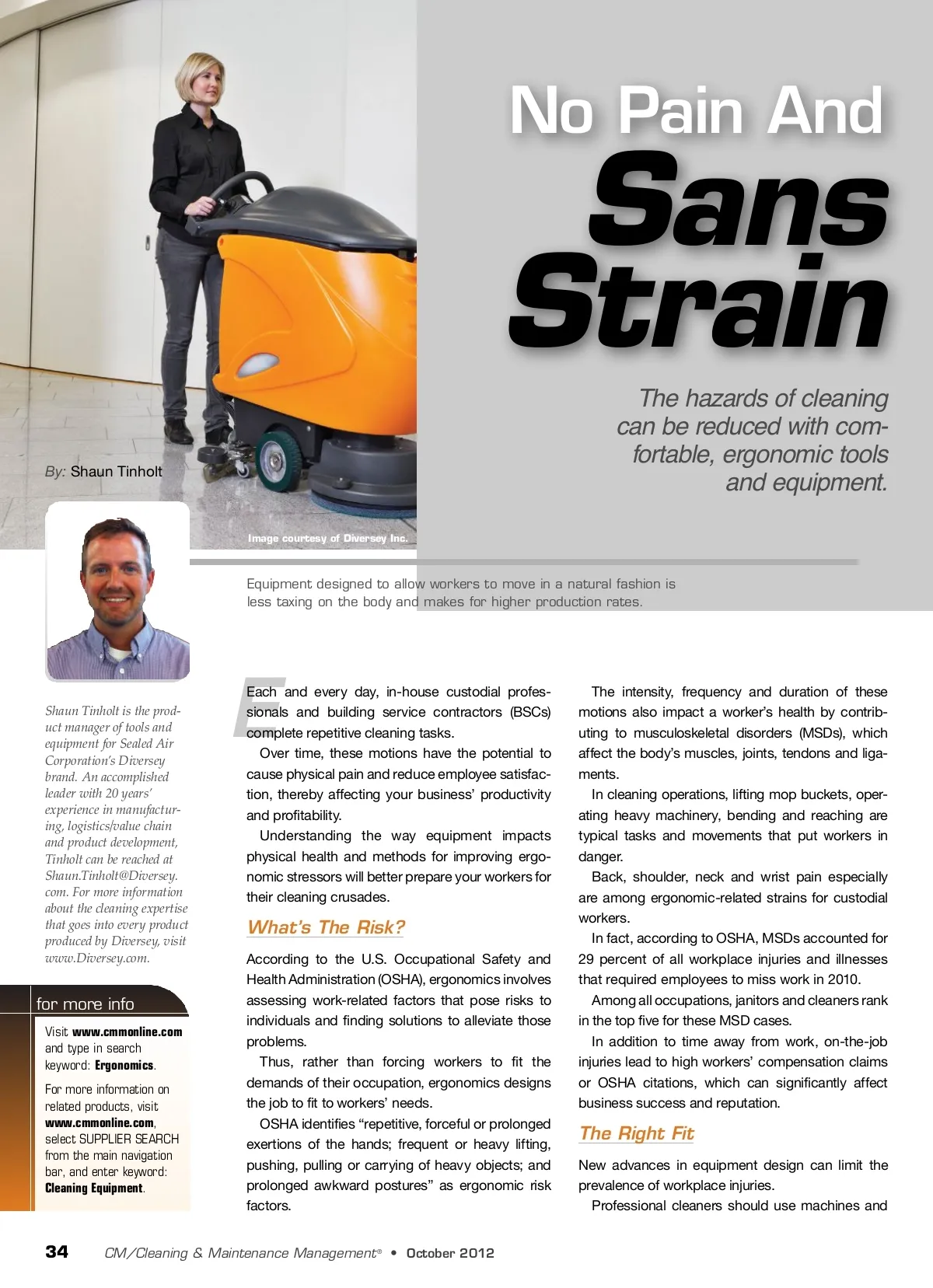 No Pain And Sans Strain By: Shaun Tinholt The hazards of cleaning can be reduced with com-fortable, ergonomic tools and equipment. Image courtesy of Diversey Inc. Equipment designed to allow workers to move in a natural fashion is less taxing on the body and makes for higher production rates. Shaun Tinholt is the prod-uct manager of tools and equipment for Sealed Air Corporation’s Diversey brand. An accomplished leader with 20 years’ experience in manufactur-ing, logistics/value chain and product development, Tinholt can be reached at Shaun.Tinholt@Diversey. com. For more information about the cleaning expertise that goes into every product produced by Diversey, visit www.Diversey.com. E Each and every day, in-house custodial profes-sionals and building service contractors (BSCs) complete repetitive cleaning tasks. Over time, these motions have the potential to cause physical pain and reduce employee satisfac-tion, thereby affecting your business’ productivity and profitability. Understanding the way equipment impacts physical health and methods for improving ergo-nomic stressors will better prepare your workers for their cleaning crusades. What’s The Risk? According to the U.S. Occupational Safety and Health Administration (OSHA), ergonomics involves assessing work-related factors that pose risks to individuals and finding solutions to alleviate those problems. Thus, rather than forcing workers to fit the demands of their occupation, ergonomics designs the job to fit to workers’ needs. OSHA identifies “repetitive, forceful or prolonged exertions of the hands; frequent or heavy lifting, pushing, pulling or carrying of heavy objects; and prolonged awkward postures” as ergonomic risk factors. for more info Visit www.cmmonline.com and type in search keyword: Ergonomics . For more information on related products, visit www.cmmonline.com , select SUPPLIER SEARCH from the main navigation bar, and enter keyword: Cleaning Equipment . The intensity, frequency and duration of these motions also impact a worker’s health by contrib-uting to musculoskeletal disorders (MSDs), which affect the body’s muscles, joints, tendons and liga-ments. In cleaning operations, lifting mop buckets, oper-ating heavy machinery, bending and reaching are typical tasks and movements that put workers in danger. Back, shoulder, neck and wrist pain especially are among ergonomic-related strains for custodial workers. In fact, according to OSHA, MSDs accounted for 29 percent of all workplace injuries and illnesses that required employees to miss work in 2010. Among all occupations, janitors and cleaners rank in the top five for these MSD cases. In addition to time away from work, on-the-job injuries lead to high workers’ compensation claims or OSHA citations, which can significantly affect business success and reputation. The Right Fit New advances in equipment design can limit the prevalence of workplace injuries. Professional cleaners should use machines and 34 CM/Cleaning & Maintenance Management ® • October 2012