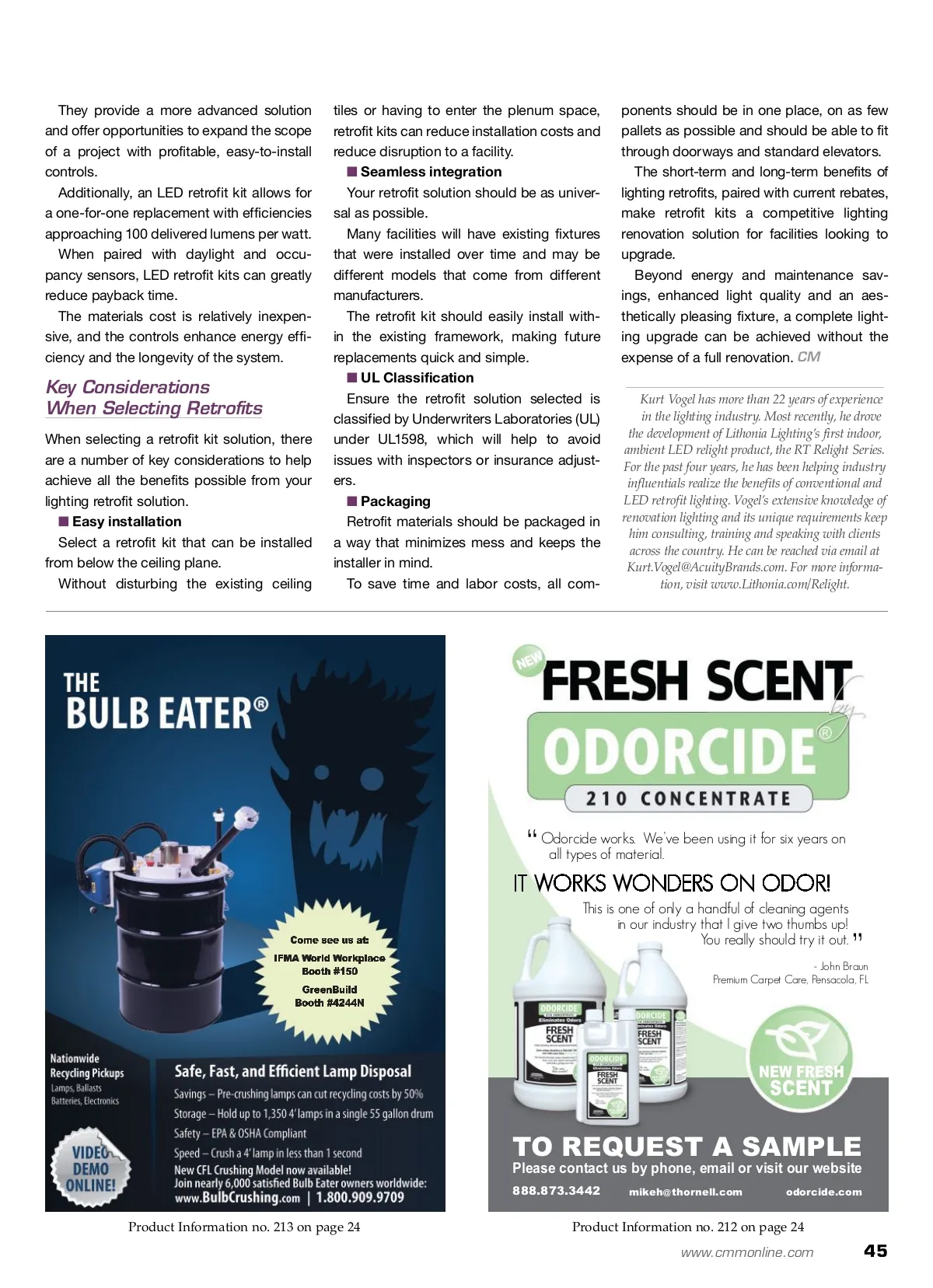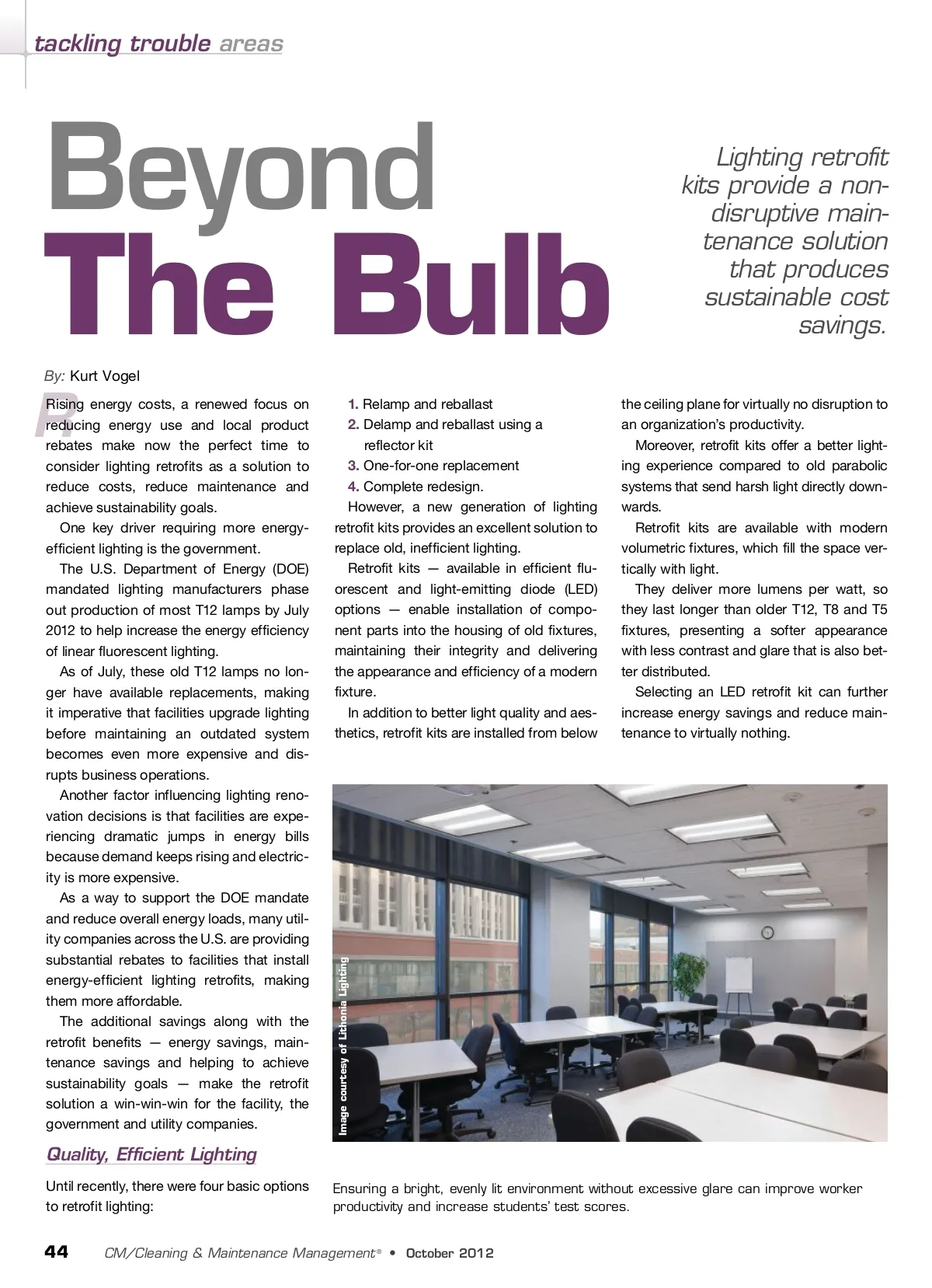 tackling trouble areas Beyond By: Kurt Vogel The Bulb R Rising energy costs, a renewed focus on reducing energy use and local product rebates make now the perfect time to consider lighting retrofits as a solution to reduce costs, reduce maintenance and achieve sustainability goals. One key driver requiring more energy-efficient lighting is the government. The U.S. Department of Energy (DOE) mandated lighting manufacturers phase out production of most T12 lamps by July 2012 to help increase the energy efficiency of linear fluorescent lighting. As of July, these old T12 lamps no lon-ger have available replacements, making it imperative that facilities upgrade lighting before maintaining an outdated system becomes even more expensive and dis-rupts business operations. Another factor influencing lighting reno-vation decisions is that facilities are expe-riencing dramatic jumps in energy bills because demand keeps rising and electric-ity is more expensive. As a way to support the DOE mandate and reduce overall energy loads, many util-ity companies across the U.S. are providing substantial rebates to facilities that install energy-efficient lighting retrofits, making them more affordable. The additional savings along with the retrofit benefits — energy savings, main-tenance savings and helping to achieve sustainability goals — make the retrofit solution a win-win-win for the facility, the government and utility companies. 1. Relamp and reballast 2. Delamp and reballast using a reflector kit 3. One-for-one replacement 4. Complete redesign. However, a new generation of lighting retrofit kits provides an excellent solution to replace old, inefficient lighting. Retrofit kits — available in efficient flu-orescent and light-emitting diode (LED) options — enable installation of compo-nent parts into the housing of old fixtures, maintaining their integrity and delivering the appearance and efficiency of a modern fixture. In addition to better light quality and aes-thetics, retrofit kits are installed from below Lighting retrofit kits provide a non-disruptive main-tenance solution that produces sustainable cost savings. the ceiling plane for virtually no disruption to an organization’s productivity. Moreover, retrofit kits offer a better light-ing experience compared to old parabolic systems that send harsh light directly down-wards. Retrofit kits are available with modern volumetric fixtures, which fill the space ver-tically with light. They deliver more lumens per watt, so they last longer than older T12, T8 and T5 fixtures, presenting a softer appearance with less contrast and glare that is also bet-ter distributed. Selecting an LED retrofit kit can further increase energy savings and reduce main-tenance to virtually nothing. Quality, Efficient Lighting Until recently, there were four basic options to retrofit lighting: Ensuring a bright, evenly lit environment without excessive glare can improve worker productivity and increase students’ test scores. 44 CM/Cleaning & Maintenance Management ® • October 2012 Image courtesy of Lithonia Lighting