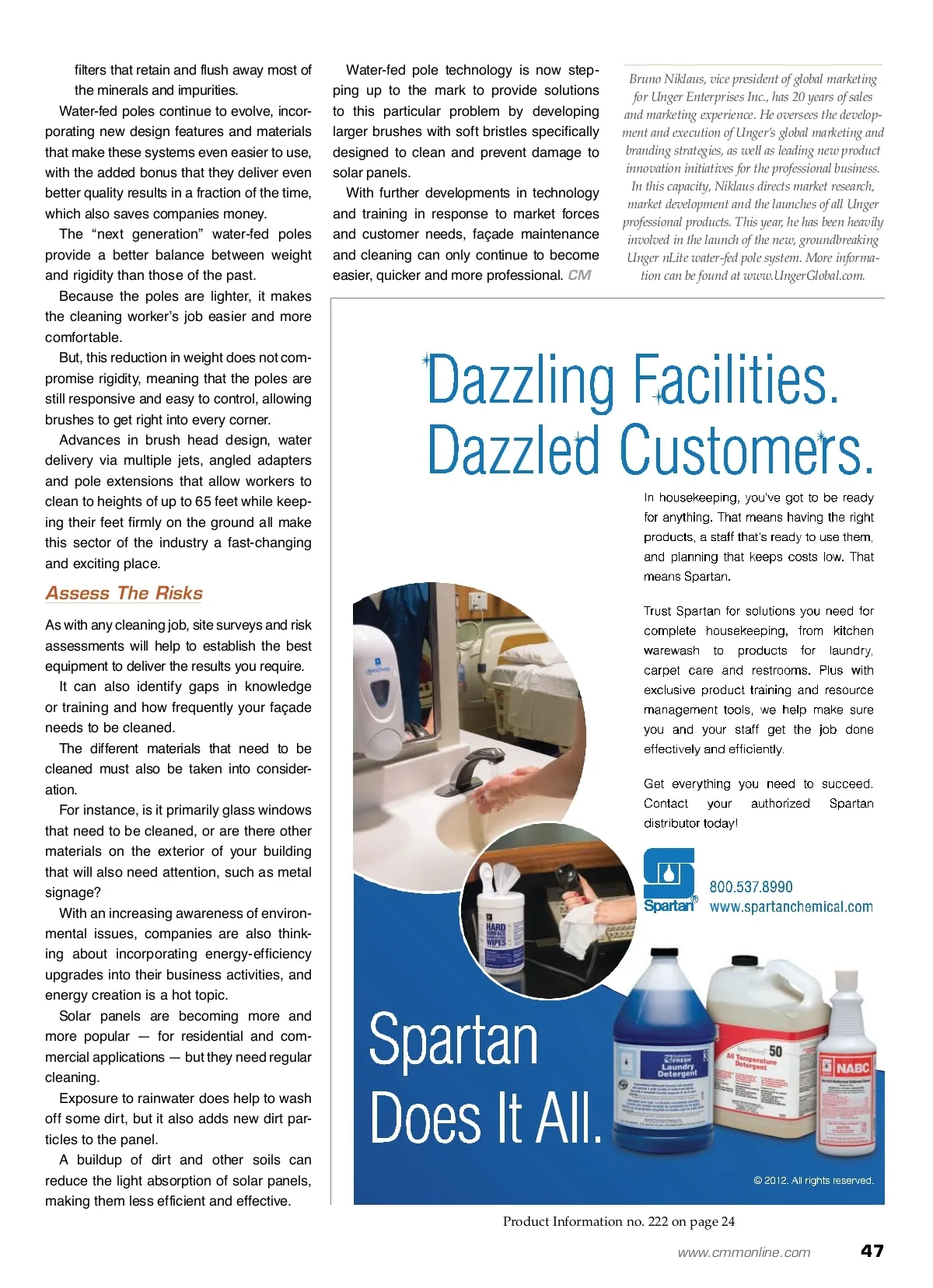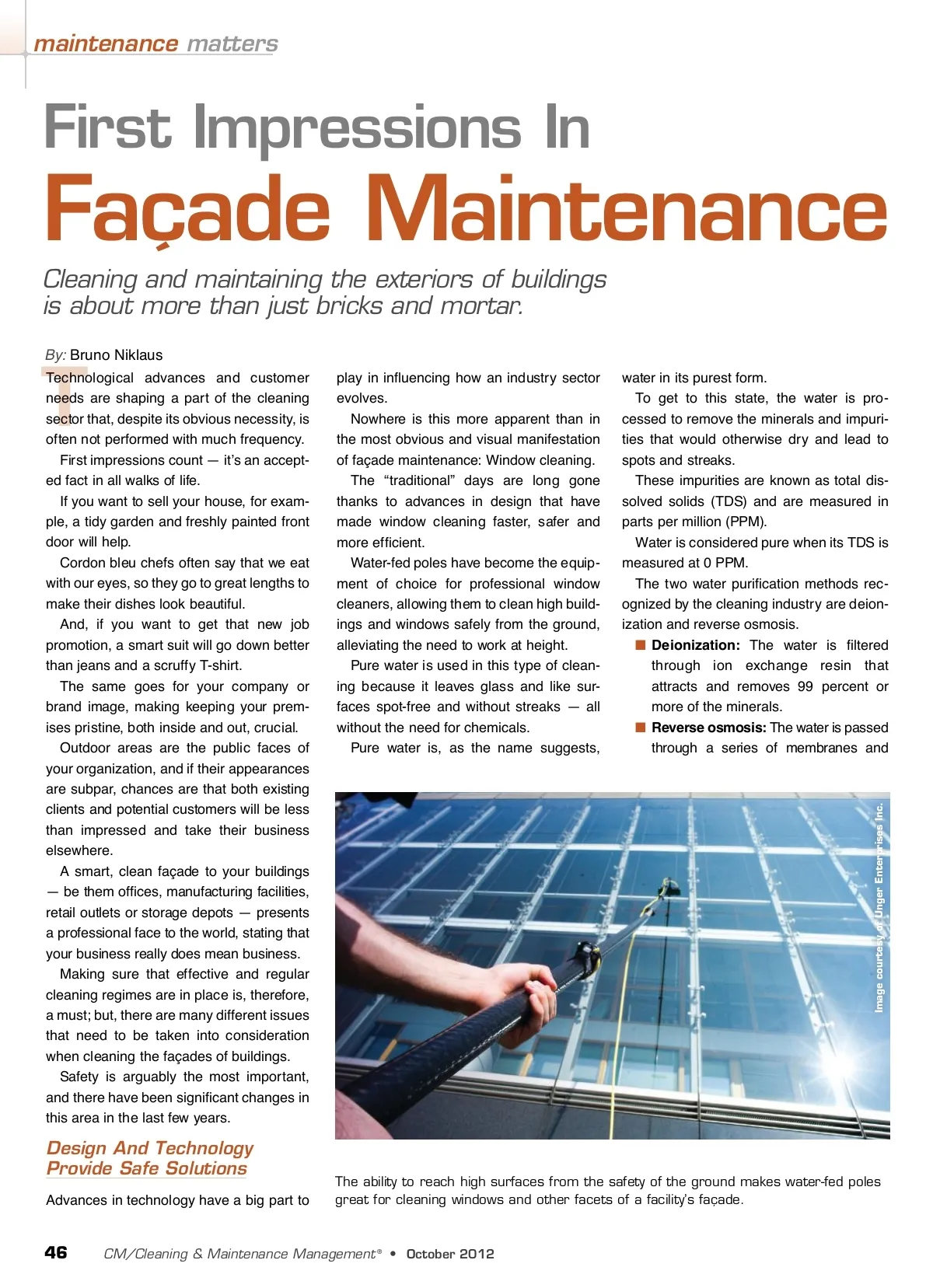 maintenance matters First Impressions In Façade Maintenance Cleaning and maintaining the exteriors of buildings is about more than just bricks and mortar. By: Bruno Niklaus T Technological advances and customer needs are shaping a part of the cleaning sector that, despite its obvious necessity, is often not performed with much frequency. First impressions count — it’s an accept-ed fact in all walks of life. If you want to sell your house, for exam-ple, a tidy garden and freshly painted front door will help. Cordon bleu chefs often say that we eat with our eyes, so they go to great lengths to make their dishes look beautiful. And, if you want to get that new job promotion, a smart suit will go down better than jeans and a scruffy T-shirt. The same goes for your company or brand image, making keeping your prem-ises pristine, both inside and out, crucial. Outdoor areas are the public faces of your organization, and if their appearances are subpar, chances are that both existing clients and potential customers will be less than impressed and take their business elsewhere. A smart, clean façade to your buildings — be them offices, manufacturing facilities, retail outlets or storage depots — presents a professional face to the world, stating that your business really does mean business. Making sure that effective and regular cleaning regimes are in place is, therefore, a must; but, there are many different issues that need to be taken into consideration when cleaning the façades of buildings. Safety is arguably the most important, and there have been significant changes in this area in the last few years. play in influencing how an industry sector evolves. Nowhere is this more apparent than in the most obvious and visual manifestation of façade maintenance: Window cleaning. The “traditional” days are long gone thanks to advances in design that have made window cleaning faster, safer and more efficient. Water-fed poles have become the equip-ment of choice for professional window cleaners, allowing them to clean high build-ings and windows safely from the ground, alleviating the need to work at height. Pure water is used in this type of clean-ing because it leaves glass and like sur-faces spot-free and without streaks — all without the need for chemicals. Pure water is, as the name suggests, water in its purest form. To get to this state, the water is pro-cessed to remove the minerals and impuri-ties that would otherwise dry and lead to spots and streaks. These impurities are known as total dis-solved solids (TDS) and are measured in parts per million (PPM). Water is considered pure when its TDS is measured at 0 PPM. The two water purification methods rec-ognized by the cleaning industry are deion-ization and reverse osmosis. ■ Deionization: The water is filtered through ion exchange resin that attracts and removes 99 percent or more of the minerals. ■ Reverse osmosis: The water is passed through a series of membranes and Design And Technology Provide Safe Solutions Advances in technology have a big part to The ability to reach high surfaces from the safety of the ground makes water-fed poles great for cleaning windows and other facets of a facility’s façade. 46 CM/Cleaning & Maintenance Management ® • October 2012 Image courtesy of Unger Enterprises Inc.