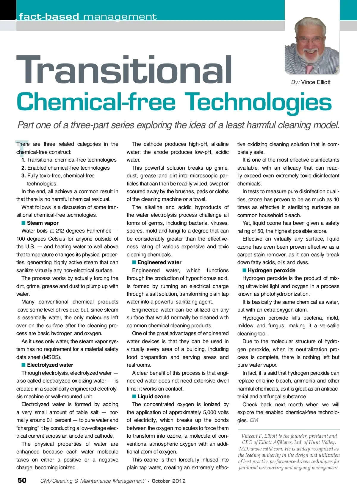 fact-based management Transitional T There are three related categories in the chemical-free construct: 1. Transitional chemical-free technologies 2. Enabled chemical-free technologies 3. Fully toxic-free, chemical-free technologies. In the end, all achieve a common result in that there is no harmful chemical residual. What follows is a discussion of some tran-sitional chemical-free technologies. ■ Steam vapor Water boils at 212 degrees Fahrenheit — 100 degrees Celsius for anyone outside of the U.S. — and heating water to well above that temperature changes its physical proper-ties, generating highly active steam that can sanitize virtually any non-electrical surface. The process works by actually forcing the dirt, grime, grease and dust to plump up with water. Many conventional chemical products leave some level of residue; but, since steam is essentially water, the only molecules left over on the surface after the cleaning pro-cess are basic hydrogen and oxygen. As it uses only water, the steam vapor sys-tem has no requirement for a material safety data sheet (MSDS). ■ Electrolyzed water Through electrolysis, electrolyzed water — also called electrolyzed oxidizing water — is created in a specifically engineered electroly-sis machine or wall-mounted unit. Electrolyzed water is formed by adding a very small amount of table salt — nor-mally around 0.1 percent — to pure water and “charging” it by conducting a low-voltage elec-trical current across an anode and cathode. The physical properties of water are enhanced because each water molecule takes on either a positive or a negative charge, becoming ionized. The cathode produces high-pH, alkaline water; the anode produces low-pH, acidic water. This powerful solution breaks up grime, dust, grease and dirt into microscopic par-ticles that can then be readily wiped, swept or scoured away by the brushes, pads or cloths of the cleaning machine or a towel. The alkaline and acidic byproducts of the water electrolysis process challenge all forms of germs, including bacteria, viruses, spores, mold and fungi to a degree that can be considerably greater than the effective-ness rating of various expensive and toxic cleaning chemicals. ■ Engineered water Engineered water, which functions through the production of hypochlorous acid, is formed by running an electrical charge through a salt solution, transforming plain tap water into a powerful sanitizing agent. Engineered water can be utilized on any surface that would normally be cleaned with common chemical cleaning products. One of the great advantages of engineered water devices is that they can be used in virtually every area of a building, including food preparation and serving areas and restrooms. A clear benefit of this process is that engi-neered water does not need extensive dwell time; it works on contact. ■ Liquid ozone The concentrated oxygen is ionized by the application of approximately 5,000 volts of electricity, which breaks up the bonds between the oxygen molecules to force them to transform into ozone, a molecule of con-ventional atmospheric oxygen with an addi-tional atom of oxygen. This ozone is then forcefully infused into plain tap water, creating an extremely effec-By: Vince Elliott Chemical-free Technologies Part one of a three-part series exploring the idea of a least harmful cleaning model. tive oxidizing cleaning solution that is com-pletely safe. It is one of the most effective disinfectants available, with an efficacy that can read-ily exceed even extremely toxic disinfectant chemicals. In tests to measure pure disinfection quali-ties, ozone has proven to be as much as 10 times as effective in sterilizing surfaces as common household bleach. Yet, liquid ozone has been given a safety rating of 50, the highest possible score. Effective on virtually any surface, liquid ozone has even been proven effective as a carpet stain remover, as it can easily break down fatty acids, oils and dyes. ■ Hydrogen peroxide Hydrogen peroxide is the product of mix-ing ultraviolet light and oxygen in a process known as photohydroionization. It is basically the same chemical as water, but with an extra oxygen atom. Hydrogen peroxide kills bacteria, mold, mildew and fungus, making it a versatile cleaning tool. Due to the molecular structure of hydro-gen peroxide, when its neutralization pro-cess is complete, there is nothing left but pure water vapor. In fact, it is said that hydrogen peroxide can replace chlorine bleach, ammonia and other harmful chemicals, as it is great as an antibac-terial and antifungal substance. Check back next month when we will explore the enabled chemical-free technolo-gies. CM Vincent F. Elliott is the founder, president and CEO of Elliott Affiliates, Ltd. of Hunt Valley, MD, www.ealtd.com. He is widely recognized as the leading authority in the design and utilization of best practice performance-driven techniques for janitorial outsourcing and ongoing management. 50 CM/Cleaning & Maintenance Management ® • October 2012