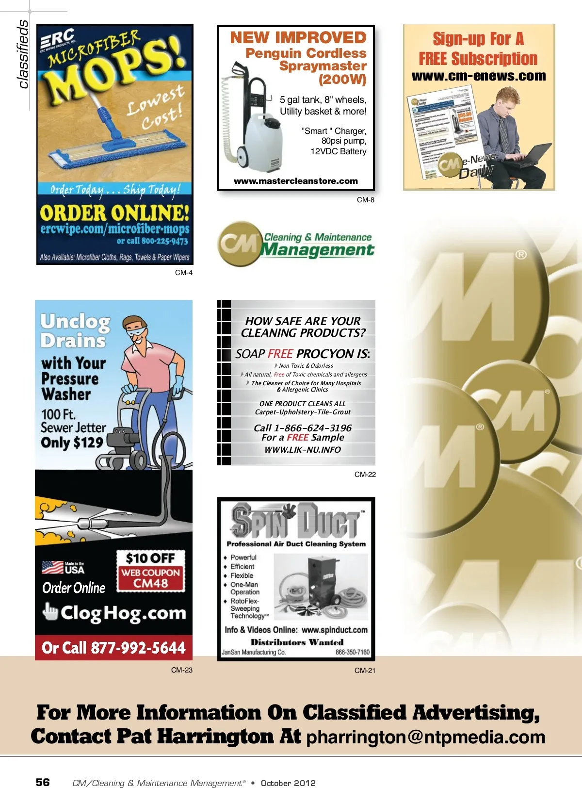 classifieds NEW IMPROVED Penguin Cordless Spraymaster (200W) Sign-up For A FREE Subscription www.cm-enews.com 5 gal tank, 8" wheels, Utility basket & more! "Smart " Charger, 80psi pump, 12VDC Battery www.mastercleanstore.com CM-8 CM-4 HOW SAFE ARE YOUR CLEANING PRODUCTS? Soap Free PROCYON IS : Non Toxic & odorless all natural, Free of Toxic chemicals and allergens The Cleaner of Choice for Many Hospitals & Allergenic Clinics ONE PRODUCT CLEANS ALL Carpet-Upholstery-Tile-Grout Call 1-866-624-3196 For a FREE Sample WWW.LIK-NU.INFO CM-22 CM-23 CM-21 For More Information On Classified Advertising, Contact Pat Harrington At [email protected] 56 CM/Cleaning & Maintenance Management ® • October 2012