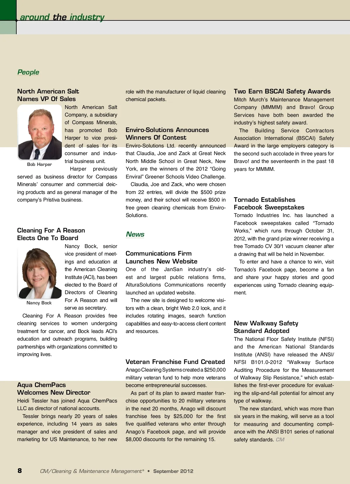around the industry People North American Salt Names VP Of Sales North American Salt Company, a subsidiary of Compass Minerals, has promoted Bob Harper to vice presi-dent of sales for its consumer and indus-trial business unit. Bob Harper Harper previously served as business director for Compass Minerals’ consumer and commercial deic-ing products and as general manager of the company’s Pristiva business. role with the manufacturer of liquid cleaning chemical packets. Two Earn BSCAI Safety Awards Mitch Murch’s Maintenance Management Company (MMMM) and Bravo! Group Services have both been awarded the industry’s highest safety award. The Building Service Contractors Association International (BSCAI) Safety Award in the large employers category is the second such accolade in three years for Bravo! and the seventeenth in the past 18 years for MMMM. Enviro-Solutions Announces Winners Of Contest Enviro-Solutions Ltd. recently announced that Claudia, Joe and Zack at Great Neck North Middle School in Great Neck, New York, are the winners of the 2012 “Going Enviral” Greener Schools Video Challenge. Claudia, Joe and Zack, who were chosen from 22 entries, will divide the $500 prize money, and their school will receive $500 in free green cleaning chemicals from Enviro-Solutions. Tornado Establishes Facebook Sweepstakes Tornado Industries Inc. has launched a Facebook sweepstakes called “Tornado Works,” which runs through October 31, 2012, with the grand prize winner receiving a free Tornado CV 30/1 vacuum cleaner after a drawing that will be held in November. To enter and have a chance to win, visit Tornado’s Facebook page, become a fan and share your happy stories and good experiences using Tornado cleaning equip-ment. Cleaning For A Reason Elects One To Board Nancy Bock, senior vice president of meet-ings and education at the American Cleaning Institute (ACI), has been elected to the Board of Directors of Cleaning For A Reason and will Nancy Bock serve as secretary. Cleaning For A Reason provides free cleaning services to women undergoing treatment for cancer, and Bock leads ACI’s education and outreach programs, building partnerships with organizations committed to improving lives. News Communications Firm Launches New Website One of the JanSan industry’s old-est and largest public relations firms, AlturaSolutions Communications recently launched an updated website. The new site is designed to welcome visi-tors with a clean, bright Web 2.0 look, and it includes rotating images, search function capabilities and easy-to-access client content and resources. New Walkway Safety Standard Adopted The National Floor Safety Institute (NFSI) and the American National Standards Institute (ANSI) have released the ANSI/ NFSI B101.0-2012 “Walkway Surface Auditing Procedure for the Measurement of Walkway Slip Resistance,” which estab-lishes the first-ever procedure for evaluat-ing the slip-and-fall potential for almost any type of walkway. The new standard, which was more than six years in the making, will serve as a tool for measuring and documenting compli-ance with the ANSI B101 series of national safety standards. CM Veteran Franchise Fund Created Anago Cleaning Systems created a $250,000 military veteran fund to help more veterans become entrepreneurial successes. As part of its plan to award master fran-chise opportunities to 20 military veterans in the next 20 months, Anago will discount franchise fees by $25,000 for the first five qualified veterans who enter through Anago’s Facebook page, and will provide $8,000 discounts for the remaining 15. Aqua ChemPacs Welcomes New Director Heidi Tessler has joined Aqua ChemPacs LLC as director of national accounts. Tessler brings nearly 20 years of sales experience, including 14 years as sales manager and vice president of sales and marketing for US Maintenance, to her new 8 CM/Cleaning & Maintenance Management ® • September 2012