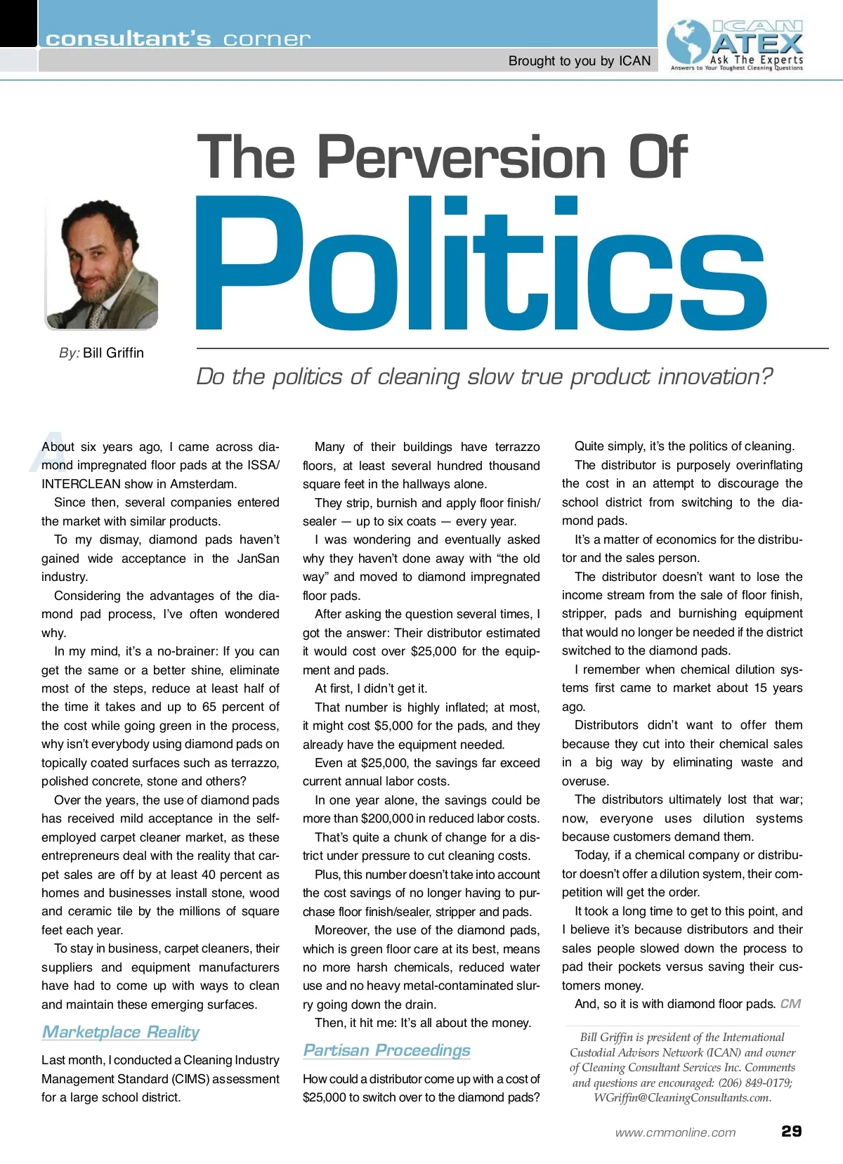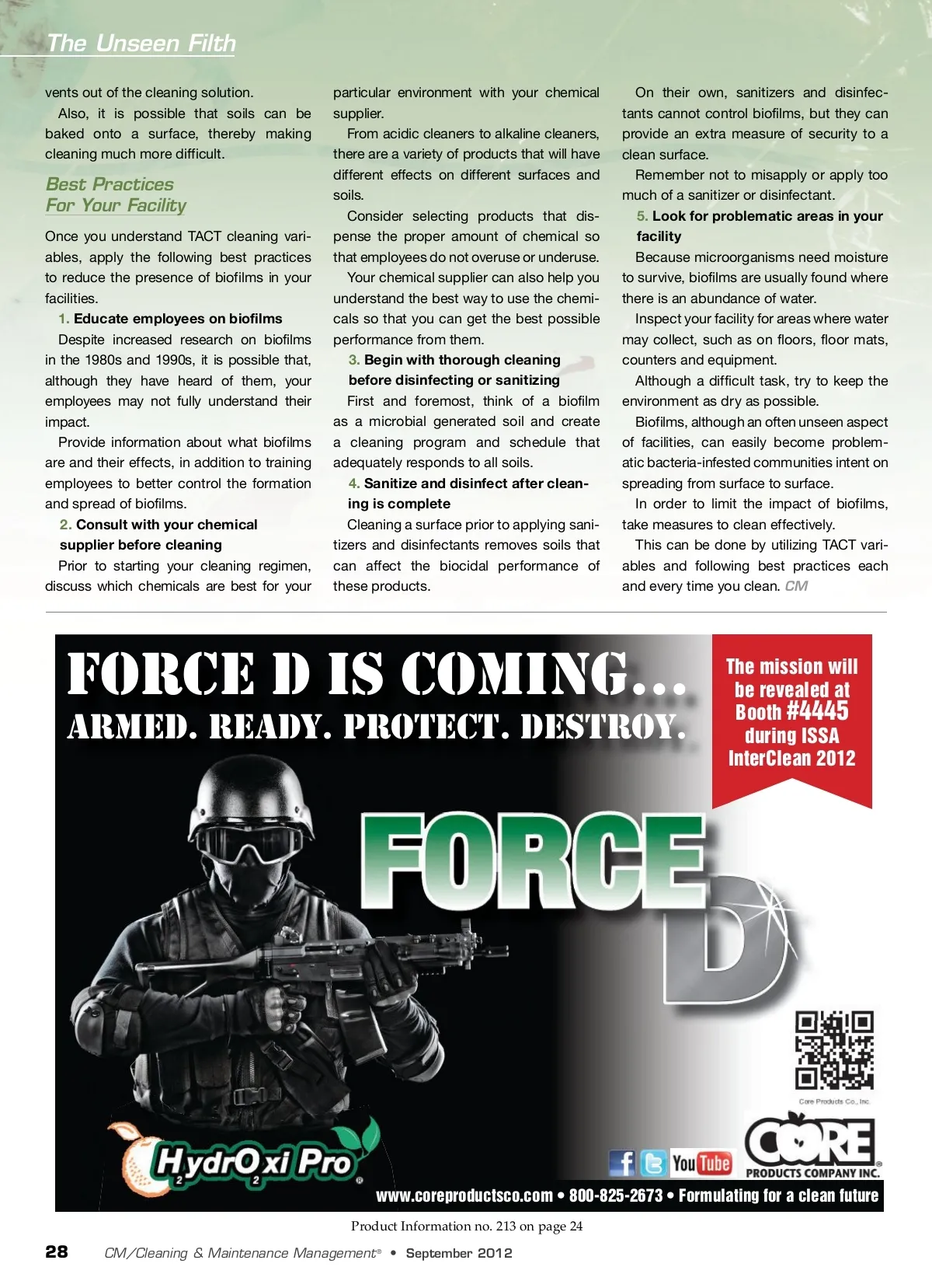 The Unseen Filth vents out of the cleaning solution. Also, it is possible that soils can be baked onto a surface, thereby making cleaning much more difficult. particular environment with your chemical supplier. From acidic cleaners to alkaline cleaners, there are a variety of products that will have different effects on different surfaces and soils. Consider selecting products that dis-pense the proper amount of chemical so that employees do not overuse or underuse. Your chemical supplier can also help you understand the best way to use the chemi-cals so that you can get the best possible performance from them. 3. Begin with thorough cleaning before disinfecting or sanitizing First and foremost, think of a biofilm as a microbial generated soil and create a cleaning program and schedule that adequately responds to all soils. 4. Sanitize and disinfect after clean-ing is complete Cleaning a surface prior to applying sani-tizers and disinfectants removes soils that can affect the biocidal performance of these products. On their own, sanitizers and disinfec-tants cannot control biofilms, but they can provide an extra measure of security to a clean surface. Remember not to misapply or apply too much of a sanitizer or disinfectant. 5. Look for problematic areas in your facility Because microorganisms need moisture to survive, biofilms are usually found where there is an abundance of water. Inspect your facility for areas where water may collect, such as on floors, floor mats, counters and equipment. Although a difficult task, try to keep the environment as dry as possible. Biofilms, although an often unseen aspect of facilities, can easily become problem-atic bacteria-infested communities intent on spreading from surface to surface. In order to limit the impact of biofilms, take measures to clean effectively. This can be done by utilizing TACT vari-ables and following best practices each and every time you clean. CM Best Practices For Your Facility Once you understand TACT cleaning vari-ables, apply the following best practices to reduce the presence of biofilms in your facilities. 1. Educate employees on biofilms Despite increased research on biofilms in the 1980s and 1990s, it is possible that, although they have heard of them, your employees may not fully understand their impact. Provide information about what biofilms are and their effects, in addition to training employees to better control the formation and spread of biofilms. 2. Consult with your chemical supplier before cleaning Prior to starting your cleaning regimen, discuss which chemicals are best for your force d is coming… armed. ready. protect. destroy. The mission will be revealed at Booth #4445 during ISSA InterClean 2012 www.coreproductsco.com • 800-825-2673 • Formulating for a clean future Product Information no. 213 on page 24 28 CM/Cleaning & Maintenance Management ® • September 2012