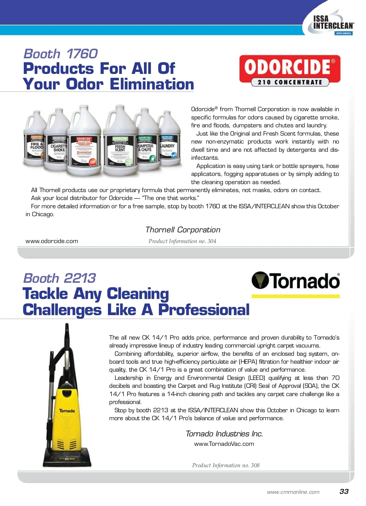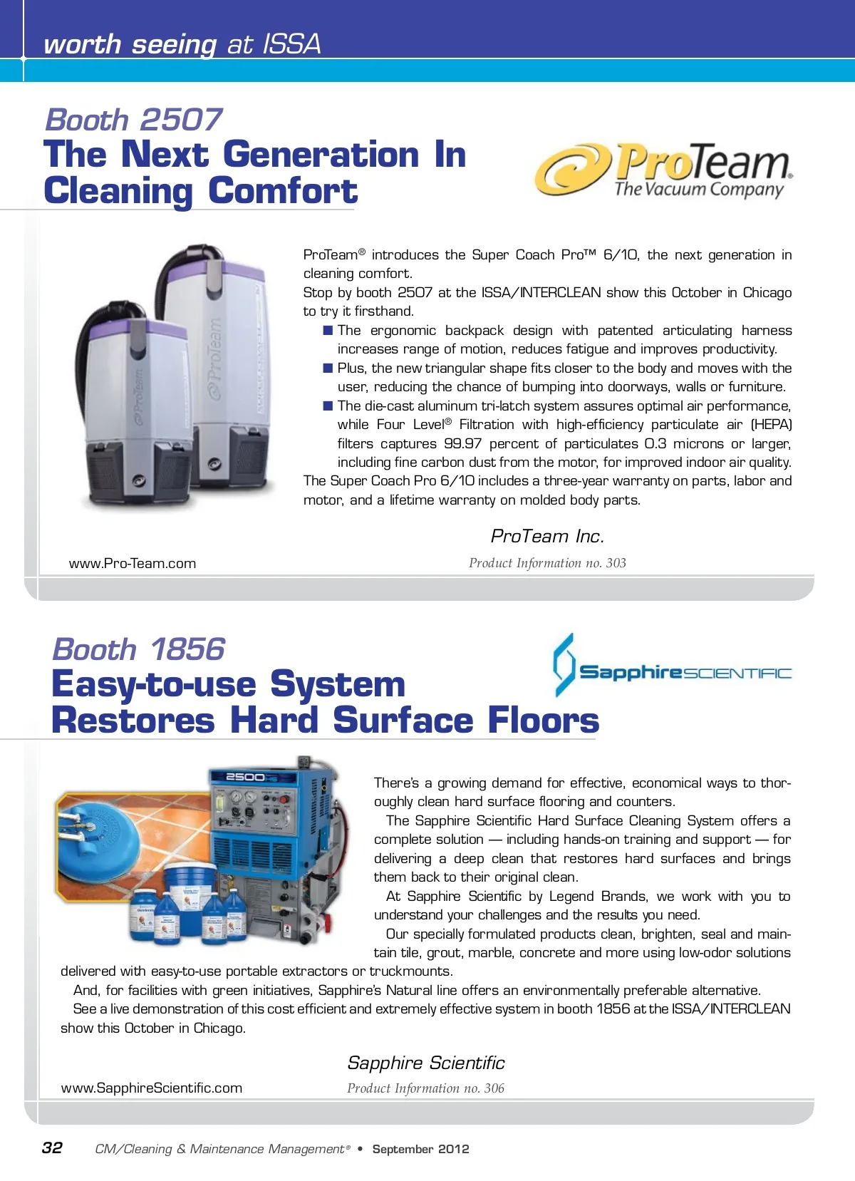 worth seeing at ISSA Booth 2507 The Next Generation In Cleaning Comfort ProTeam ® introduces the Super Coach Pro™ 6/10, the next generation in cleaning comfort. Stop by booth 2507 at the ISSA/INTERCLEAN show this October in Chicago to try it firsthand. ■ The ergonomic backpack design with patented articulating harness increases range of motion, reduces fatigue and improves productivity. ■ Plus, the new triangular shape fits closer to the body and moves with the user, reducing the chance of bumping into doorways, walls or furniture. ■ The die-cast aluminum tri-latch system assures optimal air performance, while Four Level ® Filtration with high-efficiency particulate air (HEPA) filters captures 99.97 percent of particulates 0.3 microns or larger, including fine carbon dust from the motor, for improved indoor air quality. The Super Coach Pro 6/10 includes a three-year warranty on parts, labor and motor, and a lifetime warranty on molded body parts. ProTeam Inc. w w w.Pro-Team.com Product Information no. 303 Booth 1856 Easy-to-use System Restores Hard Surface Floors There’s a growing demand for effective, economical ways to thor-oughly clean hard surface flooring and counters. The Sapphire Scientific Hard Surface Cleaning System offers a complete solution — including hands-on training and support — for delivering a deep clean that restores hard surfaces and brings them back to their original clean. At Sapphire Scientific by Legend Brands, we work with you to understand your challenges and the results you need. Our specially formulated products clean, brighten, seal and main-tain tile, grout, marble, concrete and more using low-odor solutions delivered with easy-to-use portable extractors or truckmounts. And, for facilities with green initiatives, Sapphire’s Natural line offers an environmentally preferable alternative. See a live demonstration of this cost efficient and extremely effective system in booth 1856 at the ISSA/INTERCLEAN show this October in Chicago. Sapphire Scientific www.SapphireScientific.com Product Information no. 306 32 CM/Cleaning & Maintenance Management ® • September2012