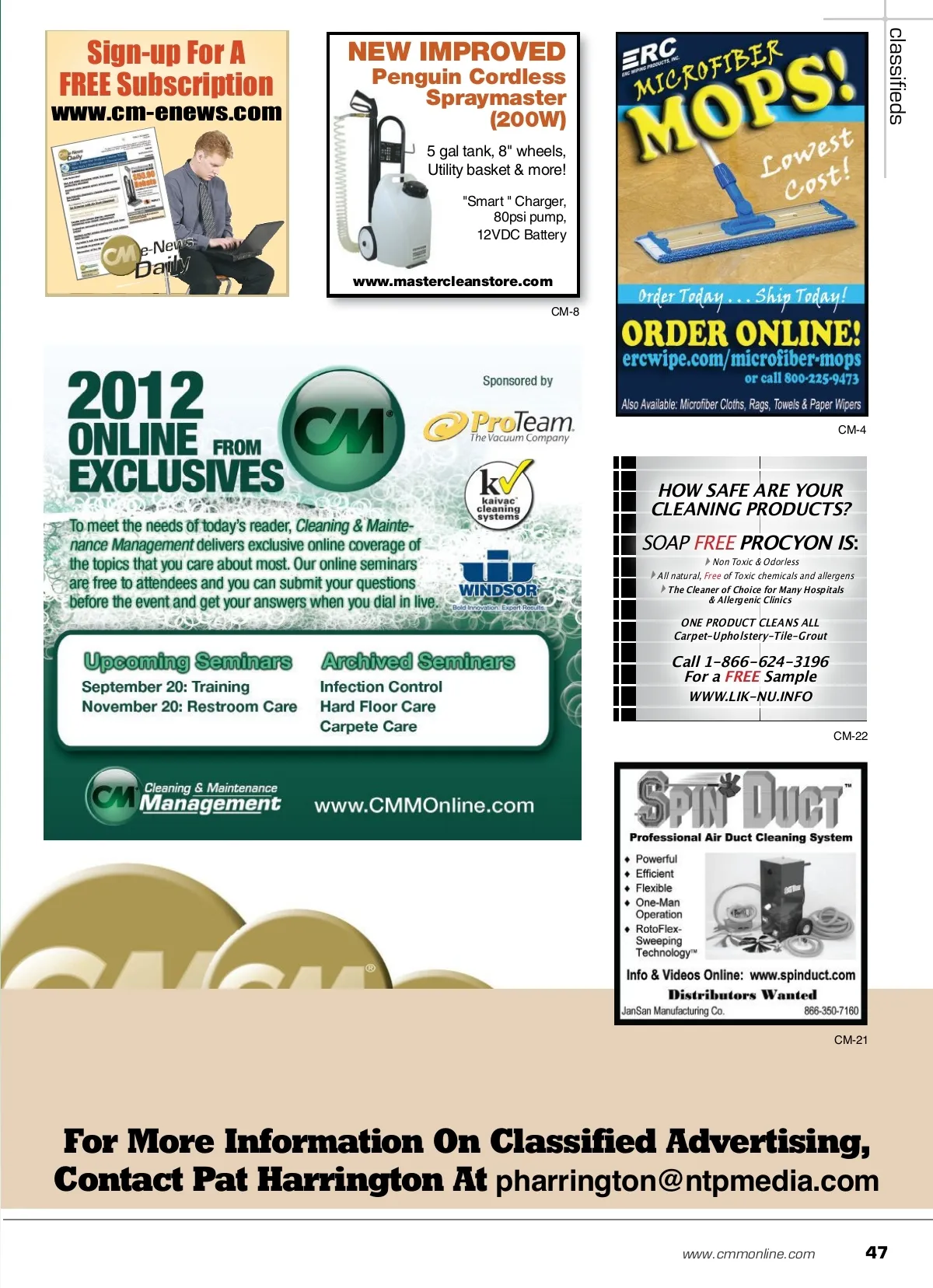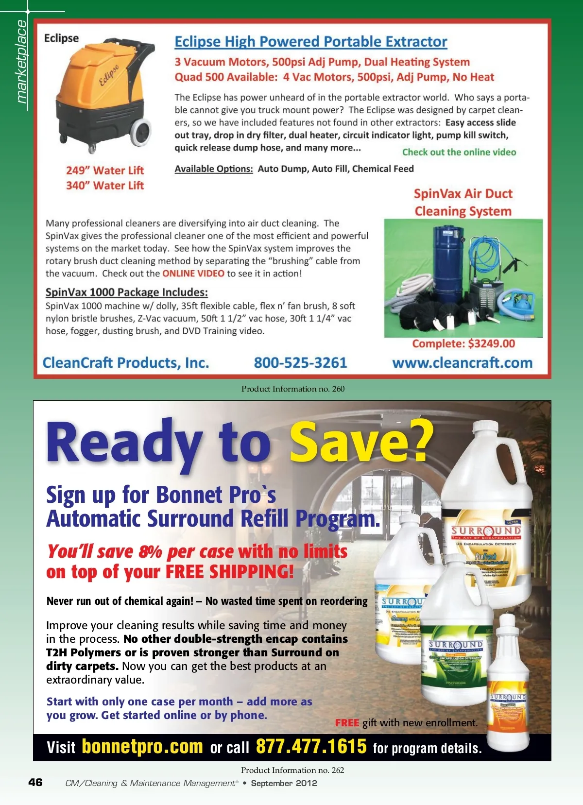 marketplace Product Information no. 260 Ready to Save? Sign up for Bonnet Pro`s Automatic Surround Refill Program. You’ll save 8% per case with no limits on top of your FREE SHIPPING! Never run out of chemical again! — No wasted time spent on reordering Improve your cleaning results while saving time and money in the process. No other double-strength encap contains T2H Polymers or is proven stronger than Surround on dirty carpets. Now you can get the best products at an extraordinary value. Start with only one case per month – add more as you grow. Get started online or by phone. FREE gift with new enrollment. Visit 46 bonnetpro.com or call ® 877.477.1615 for program details. Product Information no. 262 CM/Cleaning & Maintenance Management • September 2012