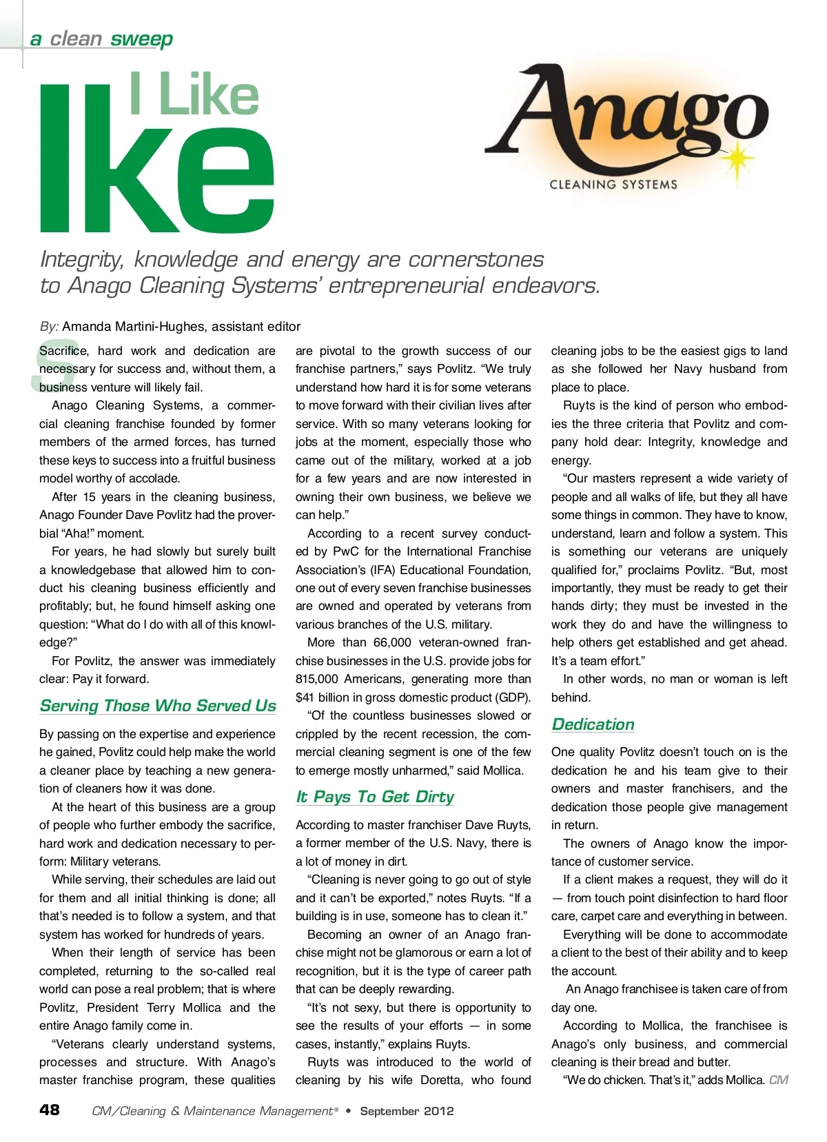 a clean sweep Ike S Sacrifice, hard work and dedication are necessary for success and, without them, a business venture will likely fail. Anago Cleaning Systems, a commer-cial cleaning franchise founded by former members of the armed forces, has turned these keys to success into a fruitful business model worthy of accolade. After 15 years in the cleaning business, Anago Founder Dave Povlitz had the prover-bial “Aha!” moment. For years, he had slowly but surely built a knowledgebase that allowed him to con-duct his cleaning business efficiently and profitably; but, he found himself asking one question: “What do I do with all of this knowl-edge?” For Povlitz, the answer was immediately clear: Pay it forward. I Like Integrity, knowledge and energy are cornerstones to Anago Cleaning Systems’ entrepreneurial endeavors. By: Amanda Martini-Hughes, assistant editor are pivotal to the growth success of our franchise partners,” says Povlitz. “We truly understand how hard it is for some veterans to move forward with their civilian lives after service. With so many veterans looking for jobs at the moment, especially those who came out of the military, worked at a job for a few years and are now interested in owning their own business, we believe we can help.” According to a recent survey conduct-ed by PwC for the International Franchise Association’s (IFA) Educational Foundation, one out of every seven franchise businesses are owned and operated by veterans from various branches of the U.S. military. More than 66,000 veteran-owned fran-chise businesses in the U.S. provide jobs for 815,000 Americans, generating more than $41 billion in gross domestic product (GDP). “Of the countless businesses slowed or crippled by the recent recession, the com-mercial cleaning segment is one of the few to emerge mostly unharmed,” said Mollica. cleaning jobs to be the easiest gigs to land as she followed her Navy husband from place to place. Ruyts is the kind of person who embod-ies the three criteria that Povlitz and com-pany hold dear: Integrity, knowledge and energy. “Our masters represent a wide variety of people and all walks of life, but they all have some things in common. They have to know, understand, learn and follow a system. This is something our veterans are uniquely qualified for,” proclaims Povlitz. “But, most importantly, they must be ready to get their hands dirty; they must be invested in the work they do and have the willingness to help others get established and get ahead. It’s a team effort.” In other words, no man or woman is left behind. Serving Those Who Served Us By passing on the expertise and experience he gained, Povlitz could help make the world a cleaner place by teaching a new genera-tion of cleaners how it was done. At the heart of this business are a group of people who further embody the sacrifice, hard work and dedication necessary to per-form: Military veterans. While serving, their schedules are laid out for them and all initial thinking is done; all that’s needed is to follow a system, and that system has worked for hundreds of years. When their length of service has been completed, returning to the so-called real world can pose a real problem; that is where Povlitz, President Terry Mollica and the entire Anago family come in. “Veterans clearly understand systems, processes and structure. With Anago’s master franchise program, these qualities Dedication One quality Povlitz doesn’t touch on is the dedication he and his team give to their owners and master franchisers, and the dedication those people give management in return. The owners of Anago know the impor-tance of customer service. If a client makes a request, they will do it — from touch point disinfection to hard floor care, carpet care and everything in between. Everything will be done to accommodate a client to the best of their ability and to keep the account. An Anago franchisee is taken care of from day one. According to Mollica, the franchisee is Anago’s only business, and commercial cleaning is their bread and butter. “We do chicken. That’s it,” adds Mollica. CM It Pays To Get Dirty According to master franchiser Dave Ruyts, a former member of the U.S. Navy, there is a lot of money in dirt. “Cleaning is never going to go out of style and it can’t be exported,” notes Ruyts. “If a building is in use, someone has to clean it.” Becoming an owner of an Anago fran-chise might not be glamorous or earn a lot of recognition, but it is the type of career path that can be deeply rewarding. “It’s not sexy, but there is opportunity to see the results of your efforts — in some cases, instantly,” explains Ruyts. Ruyts was introduced to the world of cleaning by his wife Doretta, who found 48 CM/Cleaning & Maintenance Management ® • September 2012