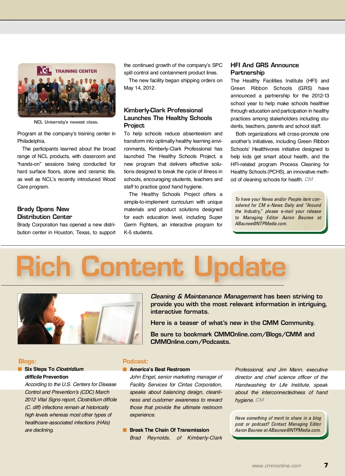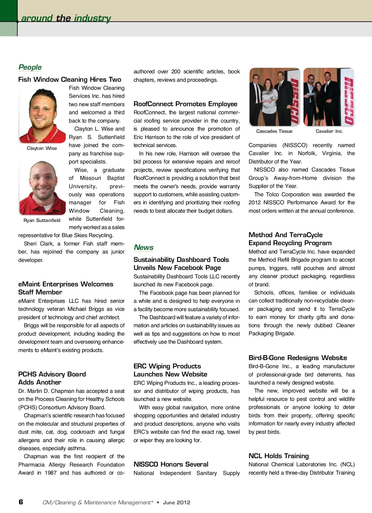 around the industry People Fish Window Cleaning Hires Two Fish Window Cleaning Services Inc. has hired two new staff members and welcomed a third back to the company. Clayton L. Wise and Ryan S. Suttenfield have joined the com-Clayton Wise pany as franchise sup-port specialists. Wise, a graduate of Missouri Baptist University, previ-ously was operations manager for Fish Window Cleaning, while Suttenfield for-Ryan Suttenfield merly worked as a sales representative for Blue Skies Recycling. Sheri Clark, a former Fish staff mem-ber, has rejoined the company as junior developer. authored over 200 scientific articles, book chapters, reviews and proceedings. RoofConnect Promotes Employee RoofConnect, the largest national commer-cial roofing service provider in the country, is pleased to announce the promotion of Eric Harrison to the role of vice president of technical services. In his new role, Harrison will oversee the bid process for extensive repairs and reroof projects, review specifications verifying that RoofConnect is providing a solution that best meets the owner’s needs, provide warranty support to customers, while assisting custom-ers in identifying and prioritizing their roofing needs to best allocate their budget dollars. Cascades Tissue Cavalier Inc. Companies (NISSCO) recently named Cavalier Inc. in Norfolk, Virginia, the Distributor of the Year. NISSCO also named Cascades Tissue Group’s Away-from-Home division the Supplier of the Year. The Tolco Corporation was awarded the 2012 NISSCO Performance Award for the most orders written at the annual conference. News Sustainability Dashboard Tools Unveils New Facebook Page Sustainability Dashboard Tools LLC recently launched its new Facebook page. The Facebook page has been planned for a while and is designed to help everyone in a facility become more sustainability focused. The Dashboard will feature a variety of infor-mation and articles on sustainability issues as well as tips and suggestions on how to most effectively use the Dashboard system. Method And TerraCycle Expand Recycling Program Method and TerraCycle Inc. have expanded the Method Refill Brigade program to accept pumps, triggers, refill pouches and almost any cleaner product packaging, regardless of brand. Schools, offices, families or individuals can collect traditionally non-recyclable clean-er packaging and send it to TerraCycle to earn money for charity gifts and dona-tions through the newly dubbed Cleaner Packaging Brigade. eMaint Enterprises Welcomes Staff Member eMaint Enterprises LLC has hired senior technology veteran Michael Briggs as vice president of technology and chief architect. Briggs will be responsible for all aspects of product development, including leading the development team and overseeing enhance-ments to eMaint’s existing products. Bird-B-Gone Redesigns Website PCHS Advisory Board Adds Another Dr. Martin D. Chapman has accepted a seat on the Process Cleaning for Healthy Schools (PCHS) Consortium Advisory Board. Chapman’s scientific research has focused on the molecular and structural properties of dust mite, cat, dog, cockroach and fungal allergens and their role in causing allergic diseases, especially asthma. Chapman was the first recipient of the Pharmacia Allergy Research Foundation Award in 1987 and has authored or co-ERC Wiping Products Launches New Website ERC Wiping Products Inc., a leading proces-sor and distributor of wiping products, has launched a new website. With easy global navigation, more online shopping opportunities and detailed industry and product descriptions, anyone who visits ERC’s website can find the exact rag, towel or wiper they are looking for. Bird-B-Gone Inc., a leading manufacturer of professional-grade bird deterrents, has launched a newly designed website. The new, improved website will be a helpful resource to pest control and wildlife professionals or anyone looking to deter birds from their property, offering specific information for nearly every industry affected by pest birds. NCL Holds Training NISSCO Honors Several National Independent Sanitary Supply National Chemical Laboratories Inc. (NCL) recently held a three-day Distributor Training 6 CM/Cleaning & Maintenance Management ® • June 2012