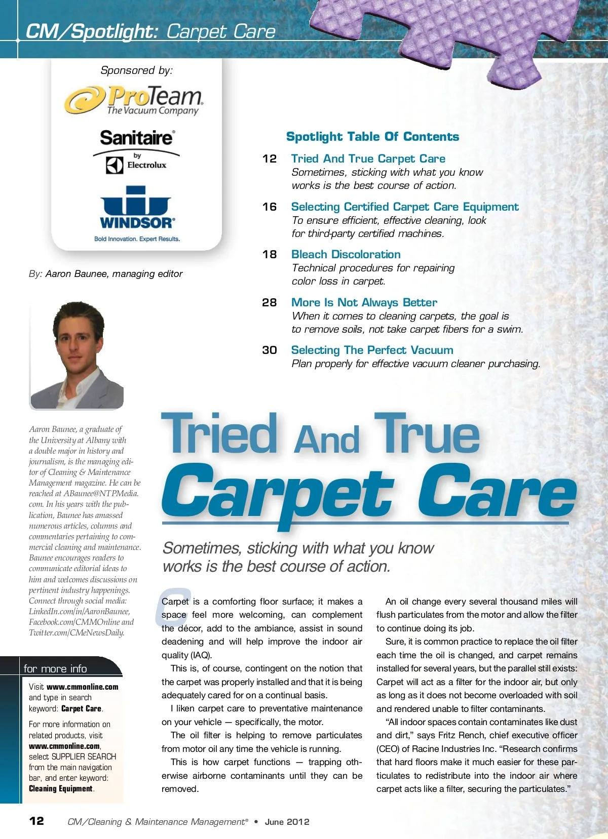 CM/Spotlight: Carpet Care Sponsored by: Spotlight Table Of Contents 12 Tried And True Carpet Care Sometimes, sticking with what you know works is the best course of action. 16 Selecting Certified Carpet Care Equipment To ensure efficient, effective cleaning, look for third-party certified machines. 18 By: Aaron Baunee, managing editor Bleach Discoloration Technical procedures for repairing color loss in carpet. 28 More Is Not Always Better When it comes to cleaning carpets, the goal is to remove soils, not take carpet fibers for a swim. 30 Selecting The Perfect Vacuum Plan properly for effective vacuum cleaner purchasing. Aaron Baunee, a graduate of the University at Albany with a double major in history and journalism, is the managing edi-tor of Cleaning & Maintenance Management magazine. He can be reached at ABaunee@NTPMedia. com. In his years with the pub-lication, Baunee has amassed numerous articles, columns and commentaries pertaining to com-mercial cleaning and maintenance. Baunee encourages readers to communicate editorial ideas to him and welcomes discussions on pertinent industry happenings. Connect through social media: LinkedIn.com/in/AaronBaunee, Facebook.com/CMMOnline and Twitter.com/CMeNewsDaily. Carpet Care Sometimes, sticking with what you know works is the best course of action. Tried And True Carpet is a comforting floor surface; it makes a space feel more welcoming, can complement the décor, add to the ambiance, assist in sound deadening and will help improve the indoor air quality (IAQ). This is, of course, contingent on the notion that the carpet was properly installed and that it is being adequately cared for on a continual basis. I liken carpet care to preventative maintenance on your vehicle — specifically, the motor. The oil filter is helping to remove particulates from motor oil any time the vehicle is running. This is how carpet functions — trapping oth-erwise airborne contaminants until they can be removed. C for more info Visit www.cmmonline.com and type in search keyword: Carpet Care . For more information on related products, visit www.cmmonline.com , select SUPPLIER SEARCH from the main navigation bar, and enter keyword: Cleaning Equipment . An oil change every several thousand miles will flush particulates from the motor and allow the filter to continue doing its job. Sure, it is common practice to replace the oil filter each time the oil is changed, and carpet remains installed for several years, but the parallel still exists: Carpet will act as a filter for the indoor air, but only as long as it does not become overloaded with soil and rendered unable to filter contaminants. “All indoor spaces contain contaminates like dust and dirt,” says Fritz Rench, chief executive officer (CEO) of Racine Industries Inc. “Research confirms that hard floors make it much easier for these par-ticulates to redistribute into the indoor air where carpet acts like a filter, securing the particulates.” 12 CM/Cleaning & Maintenance Management ® • June 2012