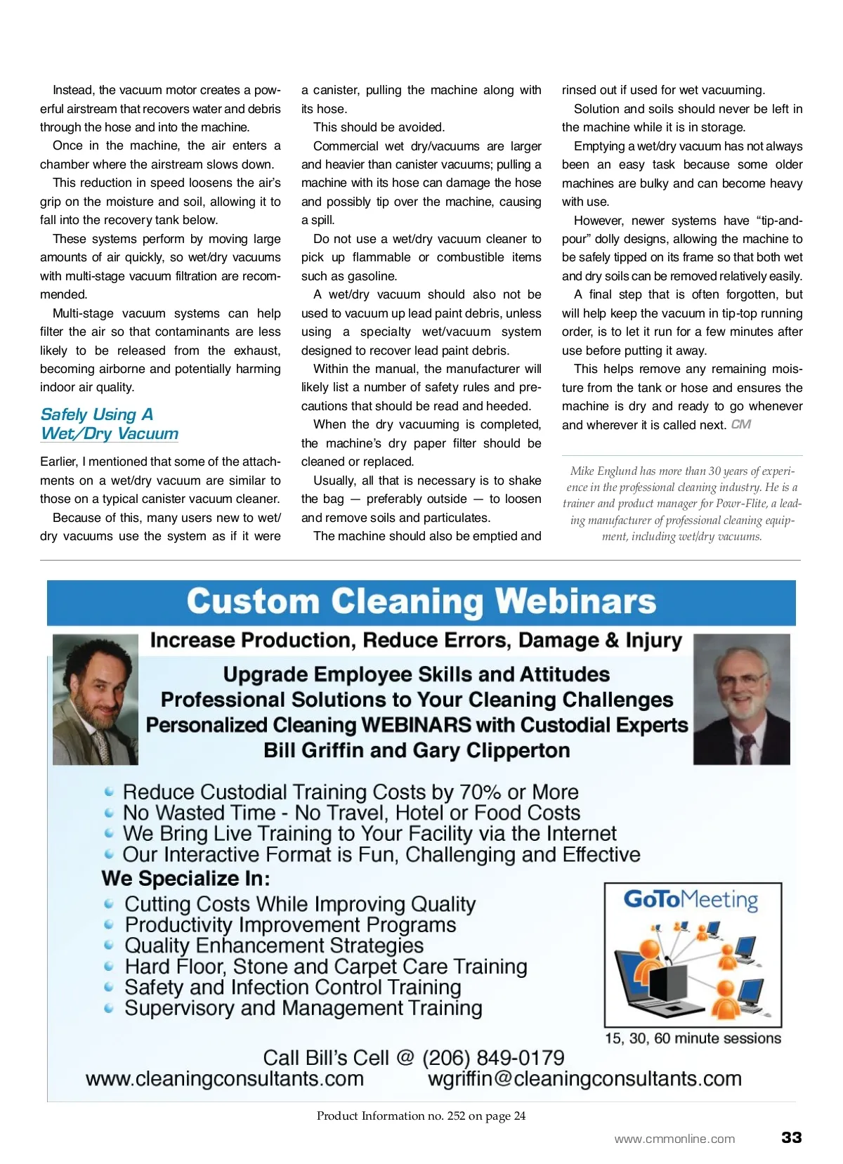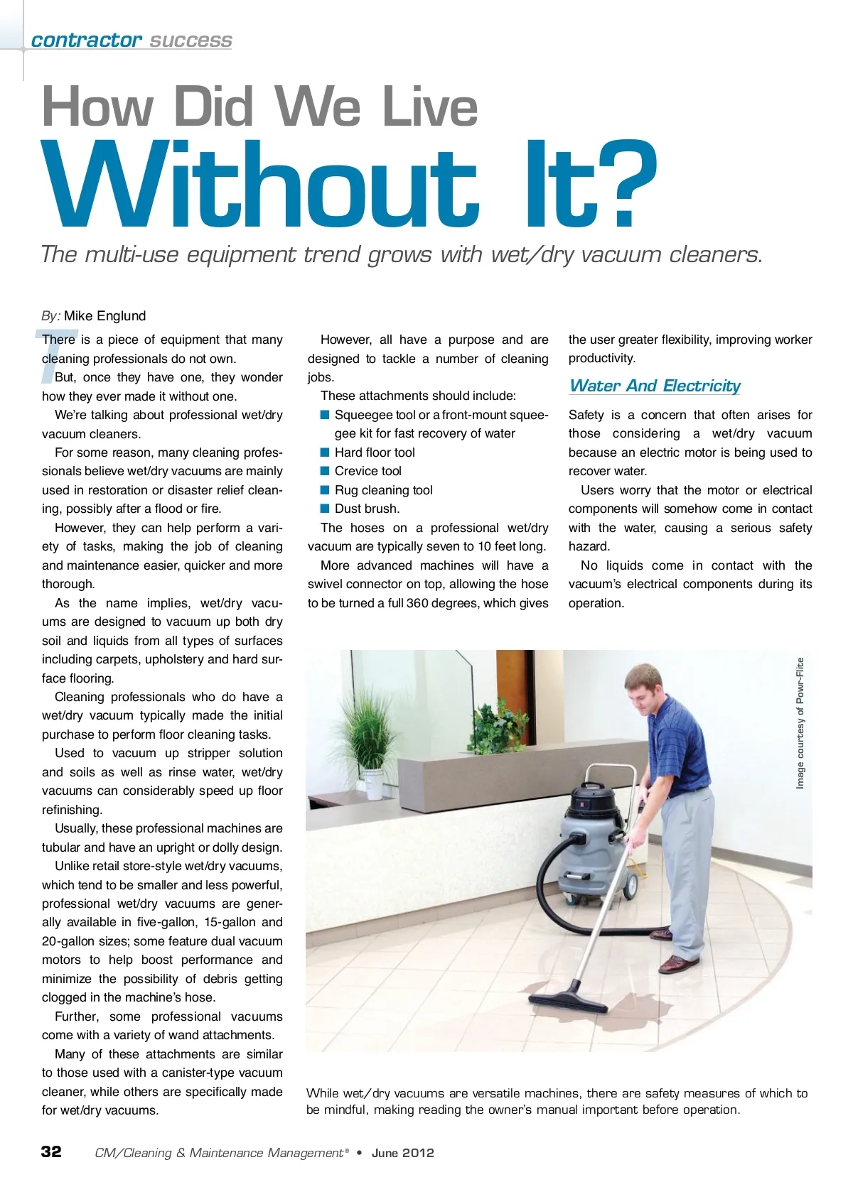 contractor success How Did We Live The multi-use equipment trend grows with wet/dry vacuum cleaners. By: Mike Englund Without It? There is a piece of equipment that many cleaning professionals do not own. But, once they have one, they wonder how they ever made it without one. We’re talking about professional wet/dry vacuum cleaners. For some reason, many cleaning profes-sionals believe wet/dry vacuums are mainly used in restoration or disaster relief clean-ing, possibly after a flood or fire. However, they can help perform a vari-ety of tasks, making the job of cleaning and maintenance easier, quicker and more thorough. As the name implies, wet/dry vacu-ums are designed to vacuum up both dry soil and liquids from all types of surfaces including carpets, upholstery and hard sur-face flooring. Cleaning professionals who do have a wet/dry vacuum typically made the initial purchase to perform floor cleaning tasks. Used to vacuum up stripper solution and soils as well as rinse water, wet/dry vacuums can considerably speed up floor refinishing. Usually, these professional machines are tubular and have an upright or dolly design. Unlike retail store-style wet/dry vacuums, which tend to be smaller and less powerful, professional wet/dry vacuums are gener-ally available in five-gallon, 15-gallon and 20-gallon sizes; some feature dual vacuum motors to help boost performance and minimize the possibility of debris getting clogged in the machine’s hose. Further, some professional vacuums come with a variety of wand attachments. Many of these attachments are similar to those used with a canister-type vacuum cleaner, while others are specifically made for wet/dry vacuums. However, all have a purpose and are designed to tackle a number of cleaning jobs. These attachments should include: ■ Squeegee tool or a front-mount squee-gee kit for fast recovery of water ■ Hard floor tool ■ Crevice tool ■ Rug cleaning tool ■ Dust brush. The hoses on a professional wet/dry vacuum are typically seven to 10 feet long. More advanced machines will have a swivel connector on top, allowing the hose to be turned a full 360 degrees, which gives T the user greater flexibility, improving worker productivity. Water And Electricity Safety is a concern that often arises for those considering a wet/dry vacuum because an electric motor is being used to recover water. Users worry that the motor or electrical components will somehow come in contact with the water, causing a serious safety hazard. No liquids come in contact with the vacuum’s electrical components during its operation. While wet/dry vacuums are versatile machines, there are safety measures of which to be mindful, making reading the owner’s manual important before operation. 32 CM/Cleaning & Maintenance Management ® • June 2012 Image courtesy of Powr-Flite