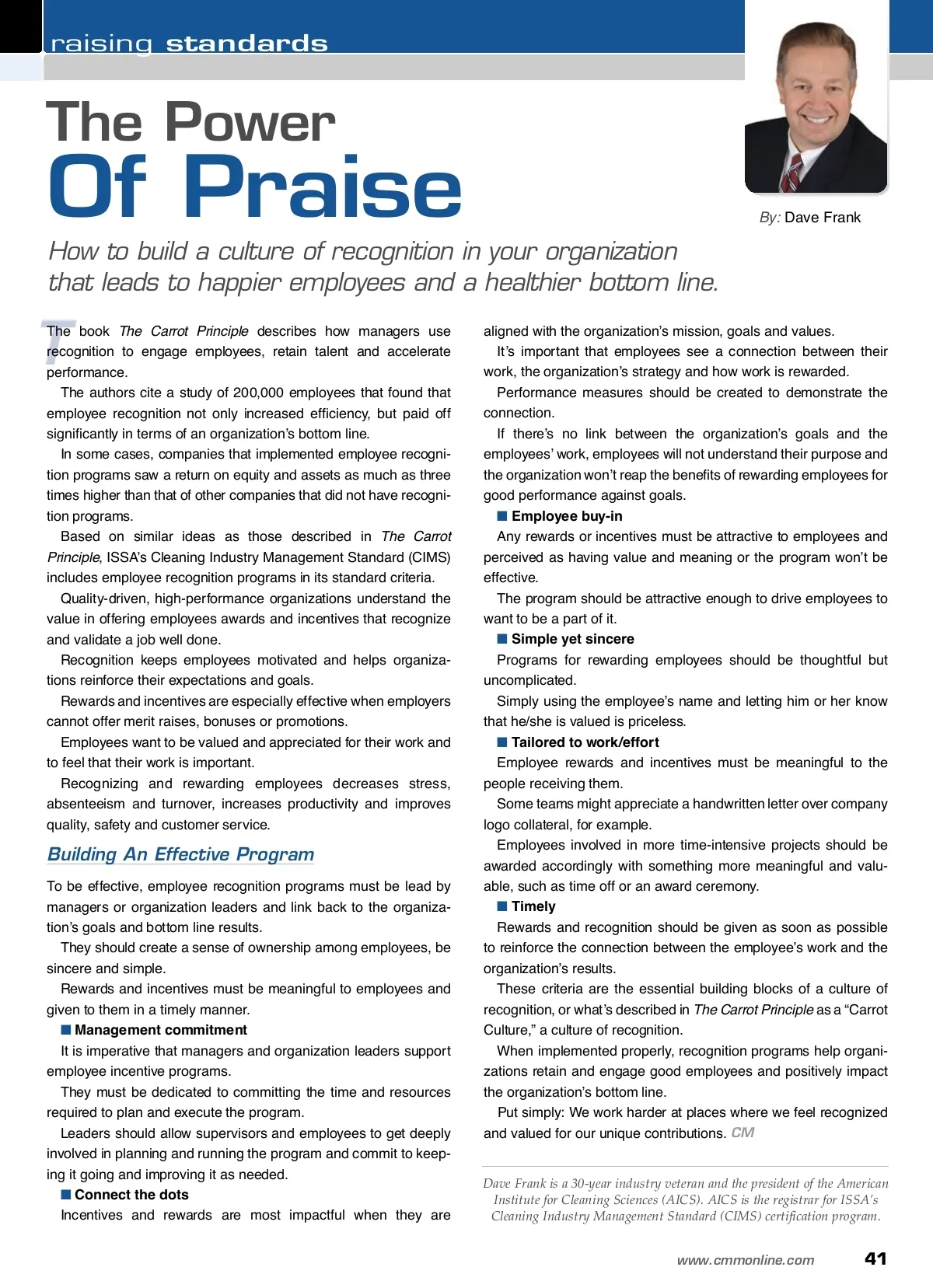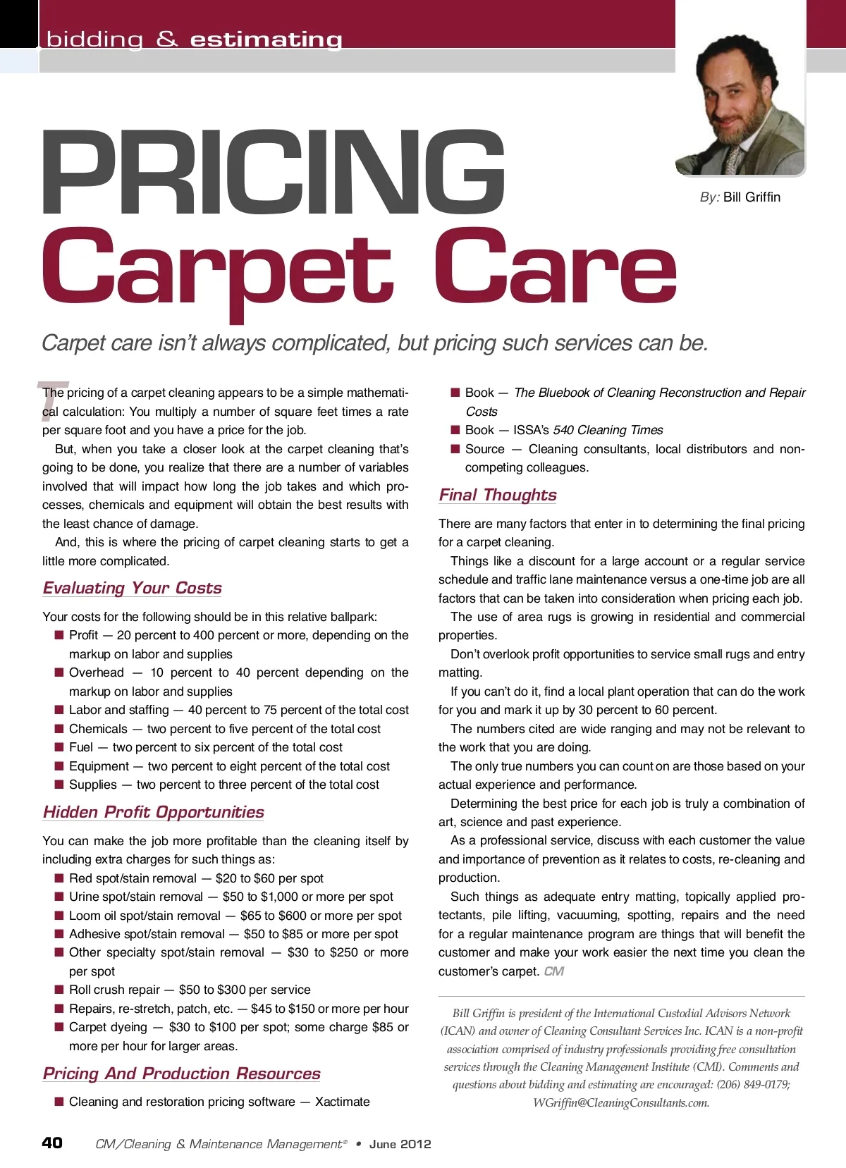 bidding & estimating PRICING T The pricing of a carpet cleaning appears to be a simple mathemati-cal calculation: You multiply a number of square feet times a rate per square foot and you have a price for the job. But, when you take a closer look at the carpet cleaning that’s going to be done, you realize that there are a number of variables involved that will impact how long the job takes and which pro-cesses, chemicals and equipment will obtain the best results with the least chance of damage. And, this is where the pricing of carpet cleaning starts to get a little more complicated. By: Bill Griffin Carpet Care Carpet care isn’t always complicated, but pricing such services can be. ■ Book — The Bluebook of Cleaning Reconstruction and Repair Costs ■ Book — ISSA’s 540 Cleaning Times ■ Source — Cleaning consultants, local distributors and non-competing colleagues. Final Thoughts There are many factors that enter in to determining the final pricing for a carpet cleaning. Things like a discount for a large account or a regular service schedule and traffic lane maintenance versus a one-time job are all factors that can be taken into consideration when pricing each job. The use of area rugs is growing in residential and commercial properties. Don’t overlook profit opportunities to service small rugs and entry matting. If you can’t do it, find a local plant operation that can do the work for you and mark it up by 30 percent to 60 percent. The numbers cited are wide ranging and may not be relevant to the work that you are doing. The only true numbers you can count on are those based on your actual experience and performance. Determining the best price for each job is truly a combination of art, science and past experience. As a professional service, discuss with each customer the value and importance of prevention as it relates to costs, re-cleaning and production. Such things as adequate entry matting, topically applied pro-tectants, pile lifting, vacuuming, spotting, repairs and the need for a regular maintenance program are things that will benefit the customer and make your work easier the next time you clean the customer’s carpet. CM Bill Griffin is president of the International Custodial Advisors Network (ICAN) and owner of Cleaning Consultant Services Inc. ICAN is a non-profit association comprised of industry professionals providing free consultation services through the Cleaning Management Institute (CMI). Comments and questions about bidding and estimating are encouraged: (206) 849-0179; [email protected]. Evaluating Your Costs Your costs for the following should be in this relative ballpark: ■ Profit — 20 percent to 400 percent or more, depending on the markup on labor and supplies ■ Overhead — 10 percent to 40 percent depending on the markup on labor and supplies ■ Labor and staffing — 40 percent to 75 percent of the total cost ■ Chemicals — two percent to five percent of the total cost ■ Fuel — two percent to six percent of the total cost ■ Equipment — two percent to eight percent of the total cost ■ Supplies — two percent to three percent of the total cost Hidden Profit Opportunities You can make the job more profitable than the cleaning itself by including extra charges for such things as: ■ Red spot/stain removal — $20 to $60 per spot ■ Urine spot/stain removal — $50 to $1,000 or more per spot ■ Loom oil spot/stain removal — $65 to $600 or more per spot ■ Adhesive spot/stain removal — $50 to $85 or more per spot ■ Other specialty spot/stain removal — $30 to $250 or more per spot ■ Roll crush repair — $50 to $300 per service ■ Repairs, re-stretch, patch, etc. — $45 to $150 or more per hour ■ Carpet dyeing — $30 to $100 per spot; some charge $85 or more per hour for larger areas. Pricing And Production Resources ■ Cleaning and restoration pricing software — Xactimate 40 CM/Cleaning & Maintenance Management ® • June 2012