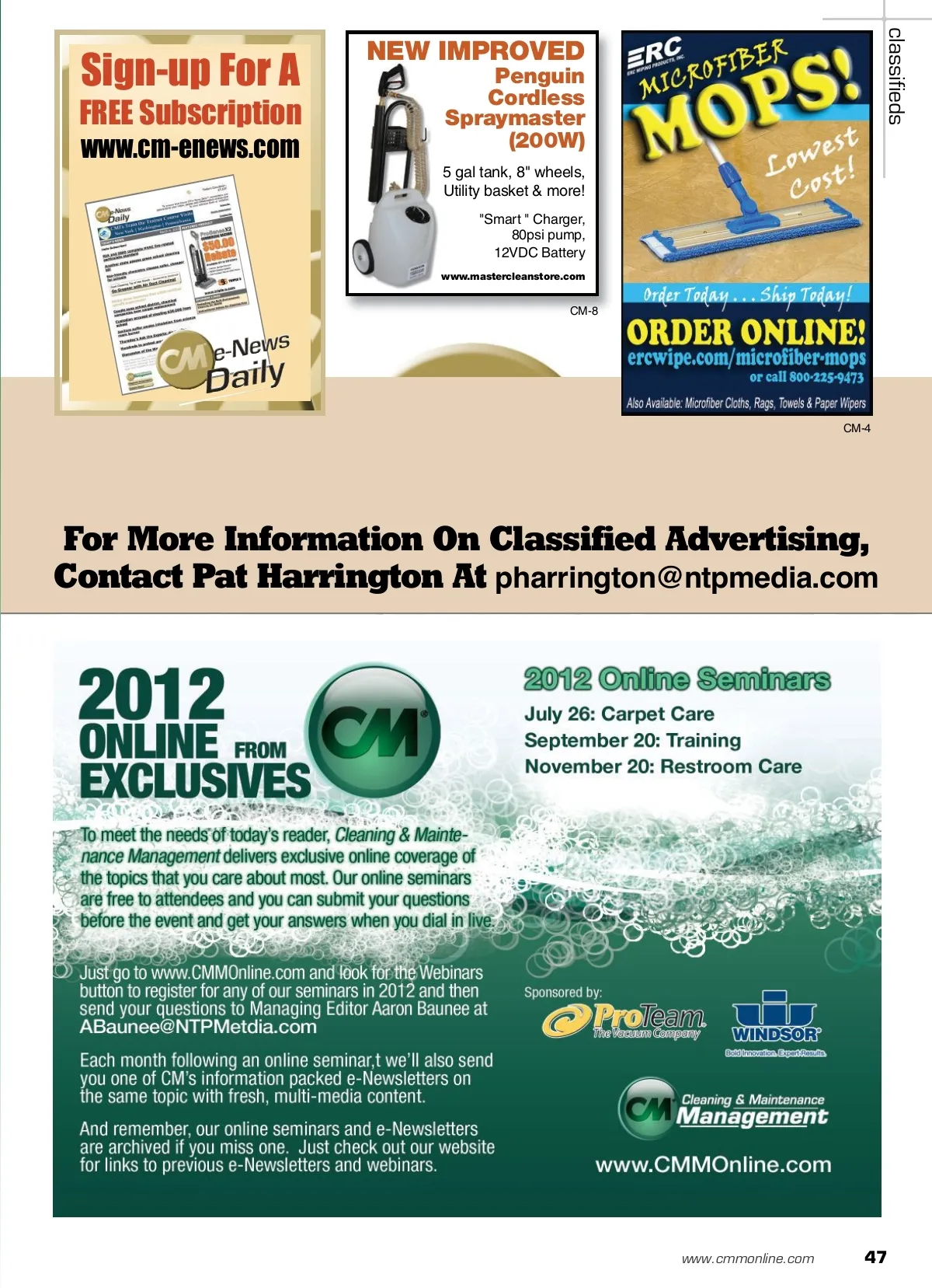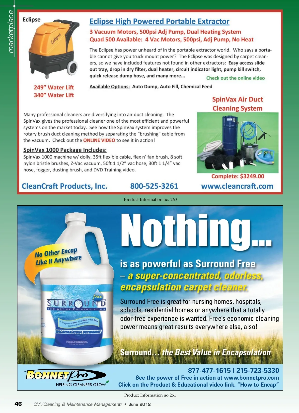 marketplace Product Information no. 260 Encap No Other where Like It Any Nothing … is as powerful as Surround Free – a super-concentrated, odorless, encapsulation carpet cleaner. Surround Free is great for nursing homes, hospitals, schools, residential homes or anywhere that a totally odor-free experience is wanted. Free’s economic cleaning power means great results everywhere else, also! Surround… the Best Value in Encapsulation 877-477-1615 | 215-723-5330 See the power of Free in action at www.bonnetpro.com Click on the Product & Educational video link, “How to Encap” Product Information no.261 46 CM/Cleaning & Maintenance Management ® • June 2012