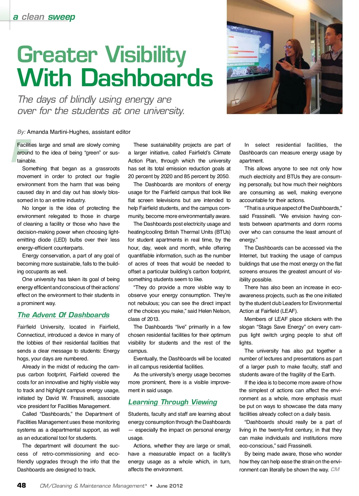 a clean sweep Greater Visibility With Dashboards The days of blindly using energy are over for the students at one university. By: Amanda Martini-Hughes, assistant editor F Facilities large and small are slowly coming around to the idea of being “green” or sus-tainable. Something that began as a grassroots movement in order to protect our fragile environment from the harm that was being caused day in and day out has slowly blos-somed in to an entire industry. No longer is the idea of protecting the environment relegated to those in charge of cleaning a facility or those who have the decision-making power when choosing light-emitting diode (LED) bulbs over their less energy-efficient counterparts. Energy conservation, a part of any goal of becoming more sustainable, falls to the build-ing occupants as well. One university has taken its goal of being energy efficient and conscious of their actions’ effect on the environment to their students in a prominent way. The Advent Of Dashboards Fairfield University, located in Fairfield, Connecticut, introduced a device in many of the lobbies of their residential facilities that sends a clear message to students: Energy hogs, your days are numbered. Already in the midst of reducing the cam-pus carbon footprint, Fairfield covered the costs for an innovative and highly visible way to track and highlight campus energy usage, initiated by David W. Frassinelli, associate vice president for Facilities Management. Called “Dashboards,” the Department of Facilities Management uses these monitoring systems as a departmental support, as well as an educational tool for students. The department will document the suc-cess of retro-commissioning and eco-friendly upgrades through the info that the Dashboards are designed to track. These sustainability projects are part of a larger initiative, called Fairfield’s Climate Action Plan, through which the university has set its total emission reduction goals at 20 percent by 2020 and 85 percent by 2050. The Dashboards are monitors of energy usage for the Fairfield campus that look like flat screen televisions but are intended to help Fairfield students, and the campus com-munity, become more environmentally aware. The Dashboards post electricity usage and heating/cooling British Thermal Units (BTUs) for student apartments in real time, by the hour, day, week and month, while offering quantifiable information, such as the number of acres of trees that would be needed to offset a particular building’s carbon footprint, something students seem to like. “They do provide a more visible way to observe your energy consumption. They’re not nebulous; you can see the direct impact of the choices you make,” said Helen Nelson, class of 2013. The Dashboards “live” primarily in a few chosen residential facilities for their optimum visibility for students and the rest of the campus. Eventually, the Dashboards will be located in all campus residential facilities. As the university’s energy usage becomes more prominent, there is a visible improve-ment in said usage. Learning Through Viewing Students, faculty and staff are learning about energy consumption through the Dashboards — especially the impact on personal energy usage. Actions, whether they are large or small, have a measurable impact on a facility’s energy usage as a whole which, in turn, affects the environment. In select residential facilities, the Dashboards can measure energy usage by apartment. This allows anyone to see not only how much electricity and BTUs they are consum-ing personally, but how much their neighbors are consuming as well, making everyone accountable for their actions. “That is a unique aspect of the Dashboards,” said Frassinelli. “We envision having con-tests between apartments and dorm rooms over who can consume the least amount of energy.” The Dashboards can be accessed via the Internet, but tracking the usage of campus buildings that use the most energy on the flat screens ensures the greatest amount of vis-ibility possible. There has also been an increase in eco-awareness projects, such as the one initiated by the student club Leaders for Environmental Action at Fairfield (LEAF). Members of LEAF place stickers with the slogan “Stags Save Energy” on every cam-pus light switch urging people to shut off lights. The university has also put together a number of lectures and presentations as part of a larger push to make faculty, staff and students aware of the fragility of the Earth. If the idea is to become more aware of how the simplest of actions can affect the envi-ronment as a whole, more emphasis must be put on ways to showcase the data many facilities already collect on a daily basis. “Dashboards should really be a part of living in the twenty-first century, in that they can make individuals and institutions more eco-conscious,” said Frassinelli. By being made aware, those who wonder how they can help ease the strain on the envi-ronment can literally be shown the way. CM 48 CM/Cleaning & Maintenance Management ® • June 2012