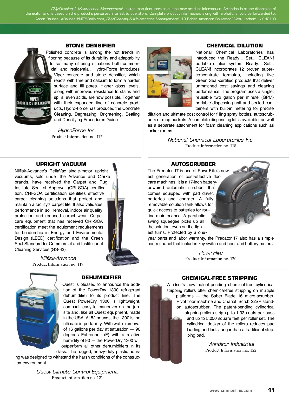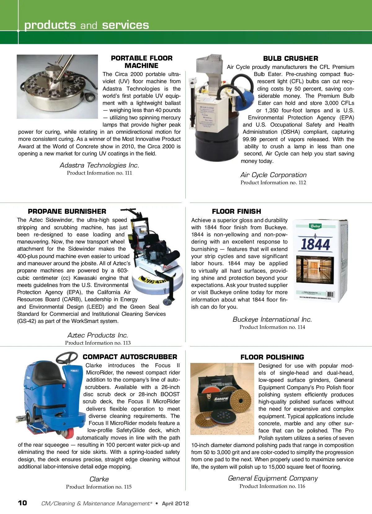 products and services PORTABLE FLOOR MACHINE The Circa 2000 portable ultra-violet (UV) floor machine from Adastra Technologies is the world’s first portable UV equip-ment with a lightweight ballast — weighing less than 40 pounds — utilizing two spinning mercury lamps that provide higher peak power for curing, while rotating in an omnidirectional motion for more consistent curing. As a winner of the Most Innovative Product Award at the World of Concrete show in 2010, the Circa 2000 is opening a new market for curing UV coatings in the field. BULB CRUSHER Air Cycle proudly manufacturers the CFL Premium Bulb Eater. Pre-crushing compact fluo-rescent light (CFL) bulbs can cut recy-cling costs by 50 percent, saving con-siderable money. The Premium Bulb Eater can hold and store 3,000 CFLs or 1,350 four-foot lamps and is U.S. Environmental Protection Agency (EPA) and U.S. Occupational Safety and Health Administration (OSHA) compliant, capturing 99.99 percent of vapors released. With the ability to crush a lamp in less than one second, Air Cycle can help you start saving money today. Adastra Technologies Inc. Product Information no. 111 Air Cycle Corporation Product Information no. 112 PROPANE BURNISHER The Aztec Sidewinder, the ultra-high speed stripping and scrubbing machine, has just been re-designed to ease loading and maneuvering. Now, the new transport wheel attachment for the Sidewinder makes the 400-plus pound machine even easier to unload and maneuver around the jobsite. All of Aztec’s propane machines are powered by a 603-cubic centimeter (cc) Kawasaki engine that meets guidelines from the U.S. Environmental Protection Agency (EPA), the California Air Resources Board (CARB), Leadership in Energy and Environmental Design (LEED) and the Green Seal Standard for Commercial and Institutional Cleaning Services (GS-42) as part of the WorkSmart system. FLOOR FINISH Achieve a superior gloss and durability with 1844 floor finish from Buckeye. 1844 is non-yellowing and non-pow-dering with an excellent response to burnishing — features that will extend your strip cycles and save significant labor hours. 1844 may be applied to virtually all hard surfaces, provid-ing shine and protection beyond your expectations. Ask your trusted supplier or visit Buckeye online today for more information about what 1844 floor fin-ish can do for you. Buckeye International Inc. Product Information no. 114 Aztec Products Inc. Product Information no. 113 COMPACT AUTOSCRUBBER Clarke introduces the Focus II MicroRider, the newest compact rider addition to the company’s line of auto-scrubbers. Available with a 26-inch disc scrub deck or 28-inch BOOST scrub deck, the Focus II MicroRider delivers flexible operation to meet diverse cleaning requirements. The Focus II MicroRider models feature a low-profile SafetyGlide deck, which automatically moves in line with the path of the rear squeegee — resulting in 100 percent water pick-up and eliminating the need for side skirts. With a spring-loaded safety design, the deck ensures precise, straight edge cleaning without additional labor-intensive detail edge mopping. FLOOR POLISHING Designed for use with popular mod-els of single-head and dual-head, low-speed surface grinders, General Equipment Company’s Pro Polish floor polishing system efficiently produces high-quality polished surfaces without the need for expensive and complex equipment. Typical applications include concrete, marble and any other sur-face that can be polished. The Pro Polish system utilizes a series of seven 10-inch diameter diamond polishing pads that range in composition from 50 to 3,000 grit and are color-coded to simplify the progression from one pad to the next. When properly used to maximize service life, the system will polish up to 15,000 square feet of flooring. Clarke Product Information no. 115 General Equipment Company Product Information no. 116 10 CM/Cleaning & Maintenance Management ® • April 2012