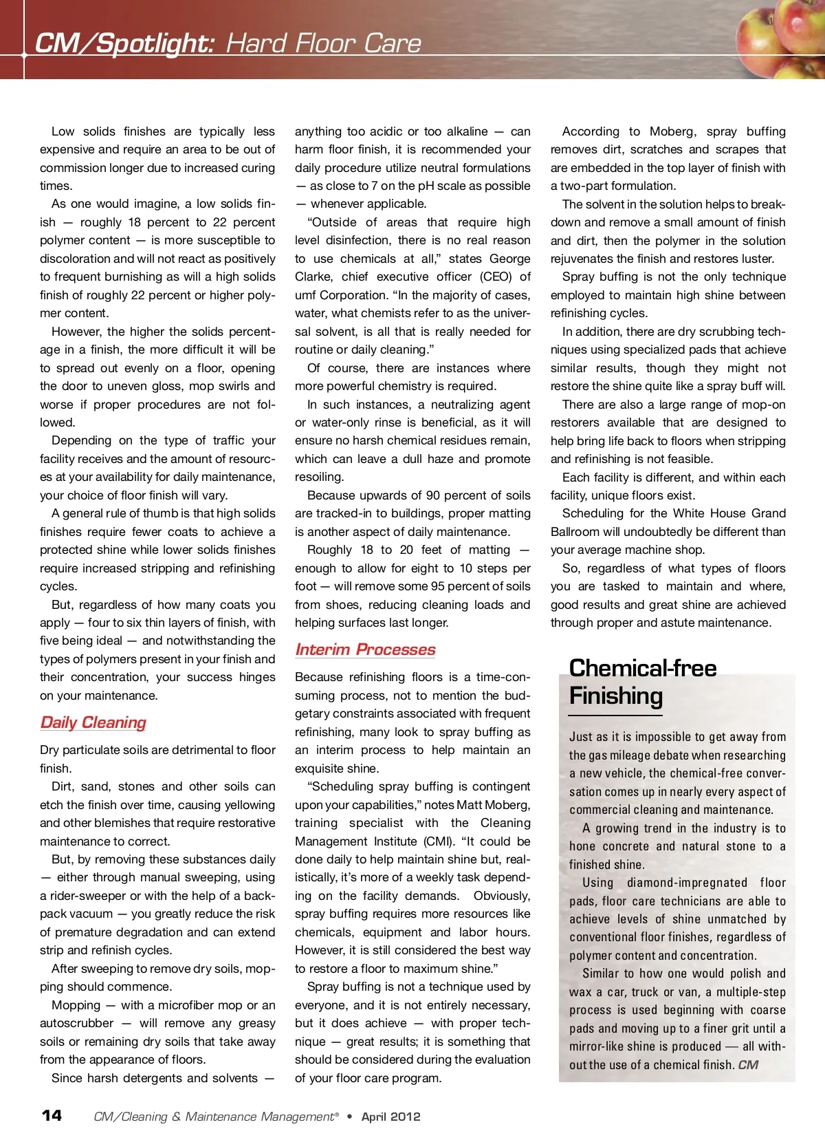 CM/Spotlight: Hard Floor Care Low solids finishes are typically less expensive and require an area to be out of commission longer due to increased curing times. As one would imagine, a low solids fin-ish — roughly 18 percent to 22 percent polymer content — is more susceptible to discoloration and will not react as positively to frequent burnishing as will a high solids finish of roughly 22 percent or higher poly-mer content. However, the higher the solids percent-age in a finish, the more difficult it will be to spread out evenly on a floor, opening the door to uneven gloss, mop swirls and worse if proper procedures are not fol-lowed. Depending on the type of traffic your facility receives and the amount of resourc-es at your availability for daily maintenance, your choice of floor finish will vary. A general rule of thumb is that high solids finishes require fewer coats to achieve a protected shine while lower solids finishes require increased stripping and refinishing cycles. But, regardless of how many coats you apply — four to six thin layers of finish, with five being ideal — and notwithstanding the types of polymers present in your finish and their concentration, your success hinges on your maintenance. anything too acidic or too alkaline — can harm floor finish, it is recommended your daily procedure utilize neutral formulations — as close to 7 on the pH scale as possible — whenever applicable. “Outside of areas that require high level disinfection, there is no real reason to use chemicals at all,” states George Clarke, chief executive officer (CEO) of umf Corporation. “In the majority of cases, water, what chemists refer to as the univer-sal solvent, is all that is really needed for routine or daily cleaning.” Of course, there are instances where more powerful chemistry is required. In such instances, a neutralizing agent or water-only rinse is beneficial, as it will ensure no harsh chemical residues remain, which can leave a dull haze and promote resoiling. Because upwards of 90 percent of soils are tracked-in to buildings, proper matting is another aspect of daily maintenance. Roughly 18 to 20 feet of matting — enough to allow for eight to 10 steps per foot — will remove some 95 percent of soils from shoes, reducing cleaning loads and helping surfaces last longer. According to Moberg, spray buffing removes dirt, scratches and scrapes that are embedded in the top layer of finish with a two-part formulation. The solvent in the solution helps to break-down and remove a small amount of finish and dirt, then the polymer in the solution rejuvenates the finish and restores luster. Spray buffing is not the only technique employed to maintain high shine between refinishing cycles. In addition, there are dry scrubbing tech-niques using specialized pads that achieve similar results, though they might not restore the shine quite like a spray buff will. There are also a large range of mop-on restorers available that are designed to help bring life back to floors when stripping and refinishing is not feasible. Each facility is different, and within each facility, unique floors exist. Scheduling for the White House Grand Ballroom will undoubtedly be different than your average machine shop. So, regardless of what types of floors you are tasked to maintain and where, good results and great shine are achieved through proper and astute maintenance. Interim Processes Because refinishing floors is a time-con-suming process, not to mention the bud-getary constraints associated with frequent refinishing, many look to spray buffing as an interim process to help maintain an exquisite shine. “Scheduling spray buffing is contingent upon your capabilities,” notes Matt Moberg, training specialist with the Cleaning Management Institute (CMI). “It could be done daily to help maintain shine but, real-istically, it’s more of a weekly task depend-ing on the facility demands. Obviously, spray buffing requires more resources like chemicals, equipment and labor hours. However, it is still considered the best way to restore a floor to maximum shine.” Spray buffing is not a technique used by everyone, and it is not entirely necessary, but it does achieve — with proper tech-nique — great results; it is something that should be considered during the evaluation of your floor care program. Chemical-free Finishing Just as it is impossible to get away from the gas mileage debate when researching a new vehicle, the chemical-free conver-sation comes up in nearly every aspect of commercial cleaning and maintenance. A growing trend in the industry is to hone concrete and natural stone to a finished shine. Using diamond-impregnated floor pads, floor care technicians are able to achieve levels of shine unmatched by conventional floor finishes, regardless of polymer content and concentration. Similar to how one would polish and wax a car, truck or van, a multiple-step process is used beginning with coarse pads and moving up to a finer grit until a mirror-like shine is produced — all with-out the use of a chemical finish. CM Daily Cleaning Dry particulate soils are detrimental to floor finish. Dirt, sand, stones and other soils can etch the finish over time, causing yellowing and other blemishes that require restorative maintenance to correct. But, by removing these substances daily — either through manual sweeping, using a rider-sweeper or with the help of a back-pack vacuum — you greatly reduce the risk of premature degradation and can extend strip and refinish cycles. After sweeping to remove dry soils, mop-ping should commence. Mopping — with a microfiber mop or an autoscrubber — will remove any greasy soils or remaining dry soils that take away from the appearance of floors. Since harsh detergents and solvents — 14 CM/Cleaning & Maintenance Management ® • April 2012