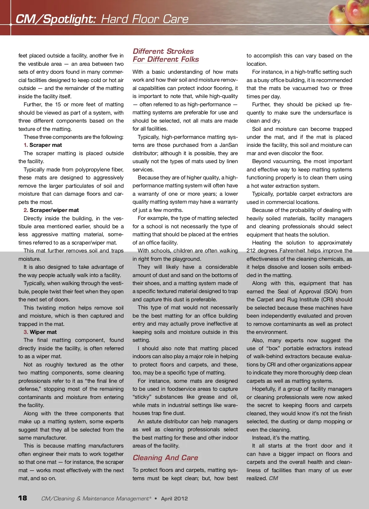 CM/Spotlight: Hard Floor Care feet placed outside a facility, another five in the vestibule area — an area between two sets of entry doors found in many commer-cial facilities designed to keep cold or hot air outside — and the remainder of the matting inside the facility itself. Further, the 15 or more feet of matting should be viewed as part of a system, with three different components based on the texture of the matting. These three components are the following: 1. Scraper mat The scraper matting is placed outside the facility. Typically made from polypropylene fiber, these mats are designed to aggressively remove the larger particulates of soil and moisture that can damage floors and car-pets the most. 2. Scraper/wiper mat Directly inside the building, in the ves-tibule area mentioned earlier, should be a less aggressive matting material, some-times referred to as a scraper/wiper mat. This mat further removes soil and traps moisture. It is also designed to take advantage of the way people actually walk into a facility. Typically, when walking through the vesti-bule, people twist their feet when they open the next set of doors. This twisting motion helps remove soil and moisture, which is then captured and trapped in the mat. 3. Wiper mat The final matting component, found directly inside the facility, is often referred to as a wiper mat. Not as roughly textured as the other two matting components, some cleaning professionals refer to it as “the final line of defense,” stopping most of the remaining contaminants and moisture from entering the facility. Along with the three components that make up a matting system, some experts suggest that they all be selected from the same manufacturer. This is because matting manufacturers often engineer their mats to work together so that one mat — for instance, the scraper mat — works most effectively with the next mat, and so on. Different Strokes For Different Folks With a basic understanding of how mats work and how their soil and moisture remov-al capabilities can protect indoor flooring, it is important to note that, while high-quality — often referred to as high-performance — matting systems are preferable for use and should be selected, not all mats are made for all facilities. Typically, high-performance matting sys-tems are those purchased from a JanSan distributor; although it is possible, they are usually not the types of mats used by linen services. Because they are of higher quality, a high-performance matting system will often have a warranty of one or more years; a lower quality matting system may have a warranty of just a few months. For example, the type of matting selected for a school is not necessarily the type of matting that should be placed at the entries of an office facility. With schools, children are often walking in right from the playground. They will likely have a considerable amount of dust and sand on the bottoms of their shoes, and a matting system made of a specific textured material designed to trap and capture this dust is preferable. This type of mat would not necessarily be the best matting for an office building entry and may actually prove ineffective at keeping soils and moisture outside in this setting. I should also note that matting placed indoors can also play a major role in helping to protect floors and carpets, and these, too, may be a specific type of matting. For instance, some mats are designed to be used in foodservice areas to capture “sticky” substances like grease and oil, while mats in industrial settings like ware-houses trap fine dust. An astute distributor can help managers as well as cleaning professionals select the best matting for these and other indoor areas of the facility. Cleaning And Care To protect floors and carpets, matting sys-tems must be kept clean; but, how best to accomplish this can vary based on the location. For instance, in a high-traffic setting such as a busy office building, it is recommended that the mats be vacuumed two or three times per day. Further, they should be picked up fre-quently to make sure the undersurface is clean and dry. Soil and moisture can become trapped under the mat, and if the mat is placed inside the facility, this soil and moisture can mar and even discolor the floor. Beyond vacuuming, the most important and effective way to keep matting systems functioning properly is to clean them using a hot water extraction system. Typically, portable carpet extractors are used in commercial locations. Because of the probability of dealing with heavily soiled materials, facility managers and cleaning professionals should select equipment that heats the solution. Heating the solution to approximately 212 degrees Fahrenheit helps improve the effectiveness of the cleaning chemicals, as it helps dissolve and loosen soils embed-ded in the matting. Along with this, equipment that has earned the Seal of Approval (SOA) from the Carpet and Rug Institute (CRI) should be selected because these machines have been independently evaluated and proven to remove contaminants as well as protect the environment. Also, many experts now suggest the use of “box” portable extractors instead of walk-behind extractors because evalua-tions by CRI and other organizations appear to indicate they more thoroughly deep clean carpets as well as matting systems. Hopefully, if a group of facility managers or cleaning professionals were now asked the secret to keeping floors and carpets cleaned, they would know it’s not the finish selected, the dusting or damp mopping or even the cleaning. Instead, it’s the matting. It all starts at the front door and it can have a bigger impact on floors and carpets and the overall health and clean-liness of facilities than many of us ever realized. CM 18 CM/Cleaning & Maintenance Management ® • April 2012