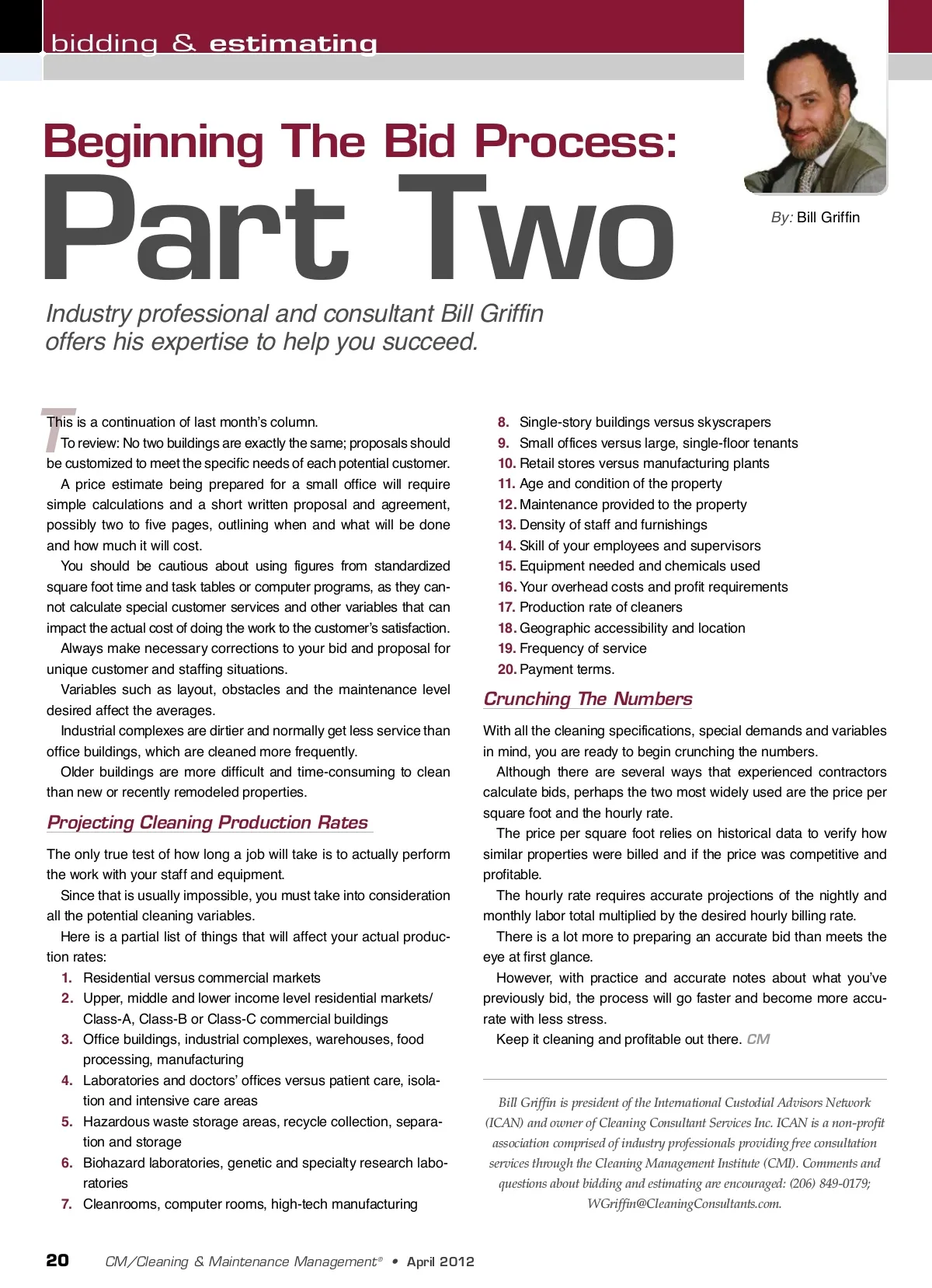 bidding & estimating Beginning The Bid Process: Part Two Industry professional and consultant Bill Griffin offers his expertise to help you succeed. By: Bill Griffin T This is a continuation of last month’s column. To review: No two buildings are exactly the same; proposals should be customized to meet the specific needs of each potential customer. A price estimate being prepared for a small office will require simple calculations and a short written proposal and agreement, possibly two to five pages, outlining when and what will be done and how much it will cost. You should be cautious about using figures from standardized square foot time and task tables or computer programs, as they can-not calculate special customer services and other variables that can impact the actual cost of doing the work to the customer’s satisfaction. Always make necessary corrections to your bid and proposal for unique customer and staffing situations. Variables such as layout, obstacles and the maintenance level desired affect the averages. Industrial complexes are dirtier and normally get less service than office buildings, which are cleaned more frequently. Older buildings are more difficult and time-consuming to clean than new or recently remodeled properties. 8. Single-story buildings versus skyscrapers 9. Small offices versus large, single-floor tenants 10. Retail stores versus manufacturing plants 11. Age and condition of the property 12. Maintenance provided to the property 13. Density of staff and furnishings 14. Skill of your employees and supervisors 15. Equipment needed and chemicals used 16. Your overhead costs and profit requirements 17. Production rate of cleaners 18. Geographic accessibility and location 19. Frequency of service 20. Payment terms. Crunching The Numbers With all the cleaning specifications, special demands and variables in mind, you are ready to begin crunching the numbers. Although there are several ways that experienced contractors calculate bids, perhaps the two most widely used are the price per square foot and the hourly rate. The price per square foot relies on historical data to verify how similar properties were billed and if the price was competitive and profitable. The hourly rate requires accurate projections of the nightly and monthly labor total multiplied by the desired hourly billing rate. There is a lot more to preparing an accurate bid than meets the eye at first glance. However, with practice and accurate notes about what you’ve previously bid, the process will go faster and become more accu-rate with less stress. Keep it cleaning and profitable out there. CM Projecting Cleaning Production Rates The only true test of how long a job will take is to actually perform the work with your staff and equipment. Since that is usually impossible, you must take into consideration all the potential cleaning variables. Here is a partial list of things that will affect your actual produc-tion rates: 1. Residential versus commercial markets 2. Upper, middle and lower income level residential markets/ Class-A, Class-B or Class-C commercial buildings 3. Office buildings, industrial complexes, warehouses, food processing, manufacturing 4. Laboratories and doctors’ offices versus patient care, isola-tion and intensive care areas 5. Hazardous waste storage areas, recycle collection, separa-tion and storage 6. Biohazard laboratories, genetic and specialty research labo-ratories 7. Cleanrooms, computer rooms, high-tech manufacturing Bill Griffin is president of the International Custodial Advisors Network (ICAN) and owner of Cleaning Consultant Services Inc. ICAN is a non-profit association comprised of industry professionals providing free consultation services through the Cleaning Management Institute (CMI). Comments and questions about bidding and estimating are encouraged: (206) 849-0179; [email protected]. 20 CM/Cleaning & Maintenance Management ® • April 2012