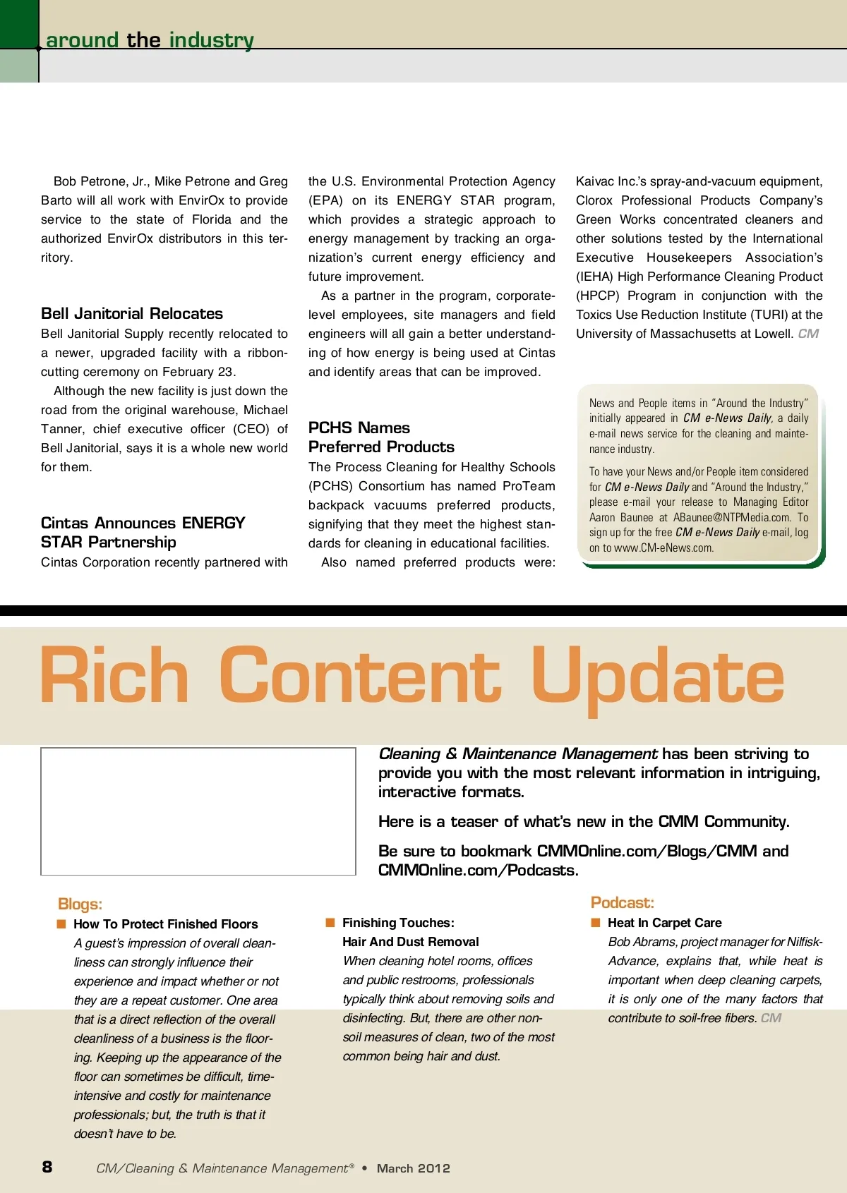 around the industry Bob Petrone, Jr., Mike Petrone and Greg Barto will all work with EnvirOx to provide service to the state of Florida and the authorized EnvirOx distributors in this ter-ritory. Bell Janitorial Relocates Bell Janitorial Supply recently relocated to a newer, upgraded facility with a ribbon-cutting ceremony on February 23. Although the new facility is just down the road from the original warehouse, Michael Tanner, chief executive officer (CEO) of Bell Janitorial, says it is a whole new world for them. the U.S. Environmental Protection Agency (EPA) on its ENERGY STAR program, which provides a strategic approach to energy management by tracking an orga-nization’s current energy efficiency and future improvement. As a partner in the program, corporate-level employees, site managers and field engineers will all gain a better understand-ing of how energy is being used at Cintas and identify areas that can be improved. Kaivac Inc.’s spray-and-vacuum equipment, Clorox Professional Products Company’s Green Works concentrated cleaners and other solutions tested by the International Executive Housekeepers Association’s (IEHA) High Performance Cleaning Product (HPCP) Program in conjunction with the Toxics Use Reduction Institute (TURI) at the University of Massachusetts at Lowell. CM PCHS Names Preferred Products The Process Cleaning for Healthy Schools (PCHS) Consortium has named ProTeam backpack vacuums preferred products, signifying that they meet the highest stan-dards for cleaning in educational facilities. Also named preferred products were: News and People items in “Around the Industry” initially appeared in CM e-News Daily , a daily e-mail news service for the cleaning and mainte-nance industry. To have your News and/or People item considered for CM e-News Daily and “Around the Industry,” please e-mail your release to Managing Editor Aaron Baunee at [email protected]. To sign up for the free CM e-News Daily e-mail, log on to www.CM-eNews.com. Cintas Announces ENERGY STAR Partnership Cintas Corporation recently partnered with Rich Content Update Cleaning & Maintenance Management has been striving to provide you with the most relevant information in intriguing, interactive formats. Here is a teaser of what’s new in the CMM Community. Be sure to bookmark CMMOnline.com/Blogs/CMM and CMMOnline.com/Podcasts. ■ How To Protect Finished Floors A guest’s impression of overall clean-liness can strongly influence their experience and impact whether or not they are a repeat customer. One area that is a direct reflection of the overall cleanliness of a business is the floor-ing. Keeping up the appearance of the floor can sometimes be difficult, time-intensive and costly for maintenance professionals; but, the truth is that it doesn’t have to be. Blogs: ■ Finishing Touches: Hair And Dust Removal When cleaning hotel rooms, offices and public restrooms, professionals typically think about removing soils and disinfecting. But, there are other non-soil measures of clean, two of the most common being hair and dust. Podcast: ■ Heat In Carpet Care Bob Abrams, project manager for Nilfisk-Advance, explains that, while heat is important when deep cleaning carpets, it is only one of the many factors that contribute to soil-free fibers. CM 8 CM/Cleaning & Maintenance Management ® • March 2012