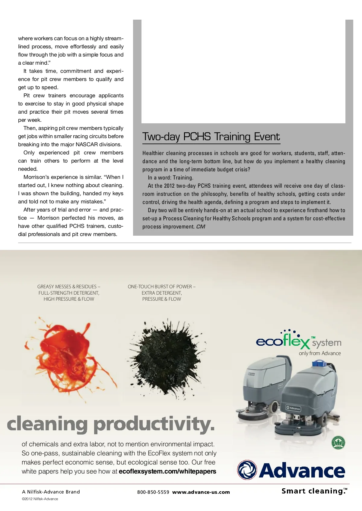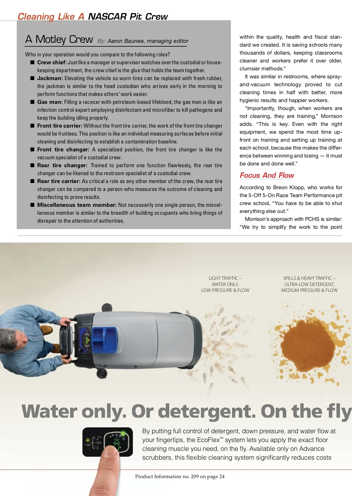 Cleaning Like A NASCAR Pit Crew A Motley Crew By: Aaron Baunee, managing editor Who in your operation would you compare to the following roles? ■ Crew chief: Just like a manager or supervisor watches over the custodial or house-keeping department, the crew chief is the glue that holds the team together. ■ Jackman: Elevating the vehicle so worn tires can be replaced with fresh rubber, the jackman is similar to the head custodian who arrives early in the morning to perform functions that makes others’ work easier. ■ Gas man: Filling a racecar with petroleum-based lifeblood, the gas man is like an infection control expert employing disinfectant and microfiber to kill pathogens and keep the building idling properly. ■ Front tire carrier: Without the front tire carrier, the work of the front tire changer would be fruitless. This position is like an individual measuring surfaces before initial cleaning and disinfecting to establish a contamination baseline. ■ Front tire changer: A specialized position, the front tire changer is like the vacuum specialist of a custodial crew. ■ Rear tire changer: Trained to perform one function flawlessly, the rear tire changer can be likened to the restroom specialist of a custodial crew. ■ Rear tire carrier: As critical a role as any other member of the crew, the rear tire changer can be compared to a person who measures the outcome of cleaning and disinfecting to prove results. ■ Miscellaneous team member: Not necessarily one single person, the miscel-laneous member is similar to the breadth of building occupants who bring things of disrepair to the attention of authorities. within the quality, health and fiscal stan-dard we created. It is saving schools many thousands of dollars, keeping classrooms cleaner and workers prefer it over older, clumsier methods.” It was similar in restrooms, where spray-and-vacuum technology proved to cut cleaning times in half with better, more hygienic results and happier workers. “Importantly, though, when workers are not cleaning, they are training,” Morrison adds. “This is key. Even with the right equipment, we spend the most time up-front on training and setting up training at each school, because this makes the differ-ence between winning and losing — it must be done and done well.” Focus And Flow According to Breon Klopp, who works for the 5-Off 5-On Race Team Performance pit crew school, “You have to be able to shut everything else out.” Morrison’s approach with PCHS is similar: “We try to simplify the work to the point LIGHT TRAFFIC – WATER ONLY, LOW PRESSURE & FLOW SPILLS & HEAVY TRAFFIC – ULTRA-LOW DETERGENT, MEDIUM PRESSURE & FLOW By putting full control of detergent, down pressure, and water flow at your fingertips, the EcoFlex ™ system lets you apply the exact floor cleaning muscle you need, on the fly. Available only on Advance scrubbers, this flexible cleaning system significantly reduces costs Product Information no. 209 on page 24