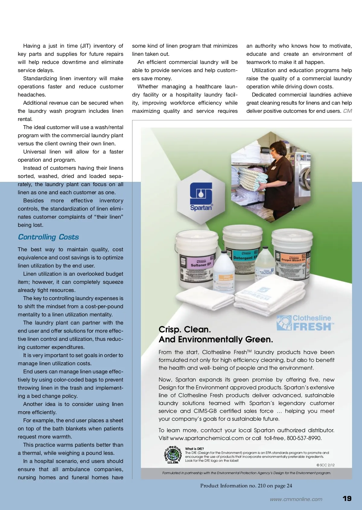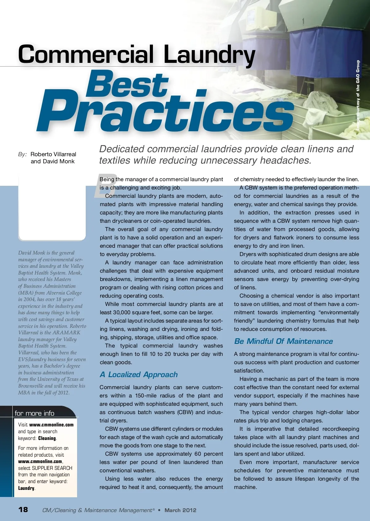 Practices By: Roberto Villarreal and David Monk Best B Dedicated commercial laundries provide clean linens and textiles while reducing unnecessary headaches. Being the manager of a commercial laundry plant is a challenging and exciting job. Commercial laundry plants are modern, auto-mated plants with impressive material handling capacity; they are more like manufacturing plants than drycleaners or coin-operated laundries. The overall goal of any commercial laundry plant is to have a solid operation and an experi-enced manager that can offer practical solutions to everyday problems. A laundry manager can face administration challenges that deal with expensive equipment breakdowns, implementing a linen management program or dealing with rising cotton prices and reducing operating costs. While most commercial laundry plants are at least 30,000 square feet, some can be larger. A typical layout includes separate areas for sort-ing linens, washing and drying, ironing and fold-ing, shipping, storage, utilities and office space. The typical commercial laundry washes enough linen to fill 10 to 20 trucks per day with clean goods. of chemistry needed to effectively launder the linen. A CBW system is the preferred operation meth-od for commercial laundries as a result of the energy, water and chemical savings they provide. In addition, the extraction presses used in sequence with a CBW system remove high quan-tities of water from processed goods, allowing for dryers and flatwork ironers to consume less energy to dry and iron linen. Dryers with sophisticated drum designs are able to circulate heat more efficiently than older, less advanced units, and onboard residual moisture sensors save energy by preventing over-drying of linens. Choosing a chemical vendor is also important to save on utilities, and most of them have a com-mitment towards implementing “environmentally friendly” laundering chemistry formulas that help to reduce consumption of resources. David Monk is the general manager of environmental ser-vices and laundry at the Valley Baptist Health System. Monk, who received his Masters of Business Administration (MBA) from Alvernia College in 2004, has over 18 years’ experience in the industry and has done many things to help with cost savings and customer service in his operation. Roberto Villarreal is the ARAMARK laundry manager for Valley Baptist Health System. Villarreal, who has been the EVS/laundry business for seven years, has a Bachelor’s degree in business administration from the University of Texas at Brownsville and will receive his MBA in the fall of 2012. Be Mindful Of Maintenance A strong maintenance program is vital for continu-ous success with plant production and customer satisfaction. Having a mechanic as part of the team is more cost effective than the constant need for external vendor support, especially if the machines have many years behind them. The typical vendor charges high-dollar labor rates plus trip and lodging charges. It is imperative that detailed recordkeeping takes place with all laundry plant machines and should include the issue resolved, parts used, dol-lars spent and labor utilized. Even more important, manufacturer service schedules for preventive maintenance must be followed to assure lifespan longevity of the machine. A Localized Approach Commercial laundry plants can serve custom-ers within a 150-mile radius of the plant and are equipped with sophisticated equipment, such as continuous batch washers (CBW) and indus-trial dryers. CBW systems use different cylinders or modules for each stage of the wash cycle and automatically move the goods from one stage to the next. CBW systems use approximately 60 percent less water per pound of linen laundered than conventional washers. Using less water also reduces the energy required to heat it and, consequently, the amount for more info Visit www.cmmonline.com and type in search keyword: Cleaning . For more information on related products, visit www.cmmonline.com , select SUPPLIER SEARCH from the main navigation bar, and enter keyword: Laundry . 18 CM/Cleaning & Maintenance Management ® • March 2012 Image courtesy of the GAO Group Commercial Laundry