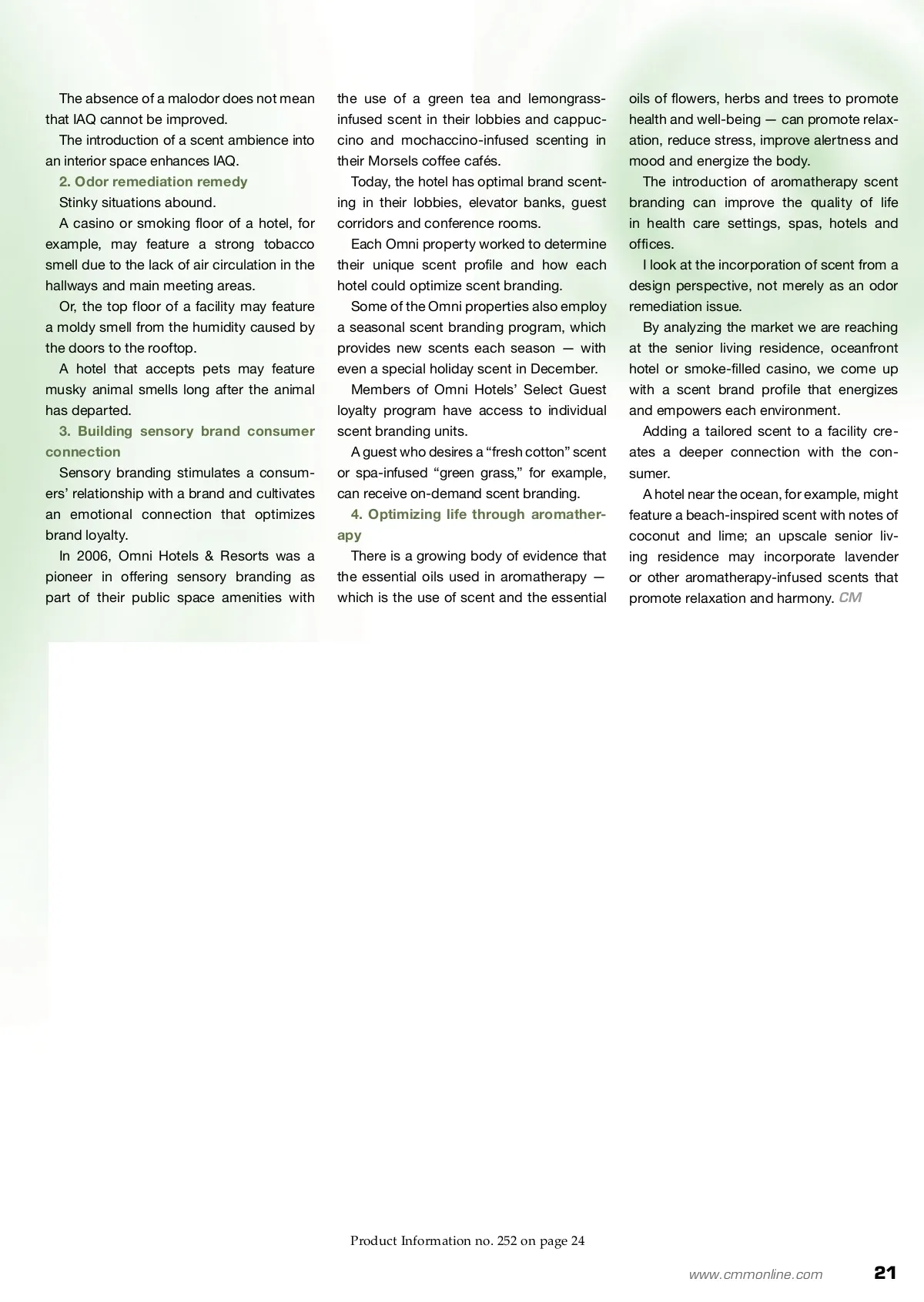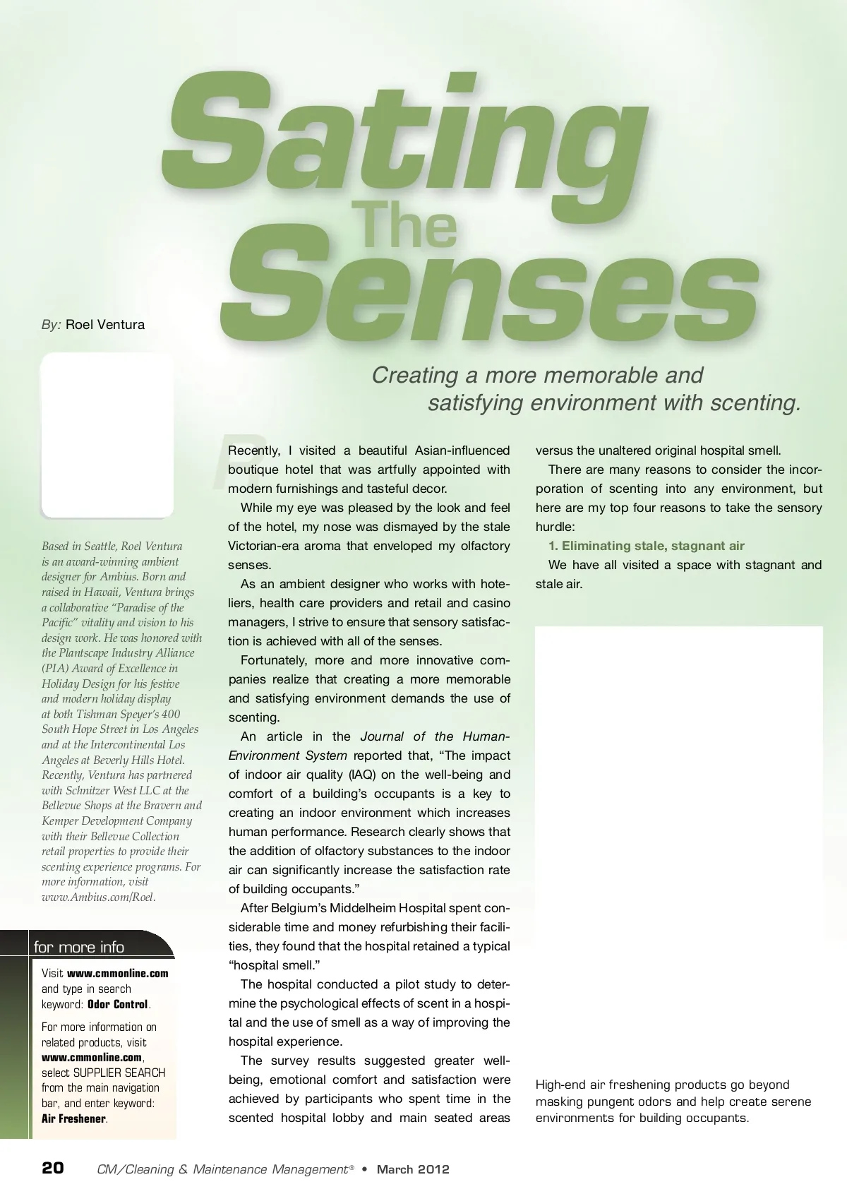 By: Roel Ventura Sating Senses The Creating a more memorable and satisfying environment with scenting. versus the unaltered original hospital smell. There are many reasons to consider the incor-poration of scenting into any environment, but here are my top four reasons to take the sensory hurdle: 1. Eliminating stale, stagnant air We have all visited a space with stagnant and stale air. R Based in Seattle, Roel Ventura is an award-winning ambient designer for Ambius. Born and raised in Hawaii, Ventura brings a collaborative “Paradise of the Pacific” vitality and vision to his design work. He was honored with the Plantscape Industry Alliance (PIA) Award of Excellence in Holiday Design for his festive and modern holiday display at both Tishman Speyer’s 400 South Hope Street in Los Angeles and at the Intercontinental Los Angeles at Beverly Hills Hotel. Recently, Ventura has partnered with Schnitzer West LLC at the Bellevue Shops at the Bravern and Kemper Development Company with their Bellevue Collection retail properties to provide their scenting experience programs. For more information, visit www.Ambius.com/Roel. for more info Visit www.cmmonline.com and type in search keyword: Odor Control . For more information on related products, visit www.cmmonline.com , select SUPPLIER SEARCH from the main navigation bar, and enter keyword: Air Freshener . Recently, I visited a beautiful Asian-influenced boutique hotel that was artfully appointed with modern furnishings and tasteful decor. While my eye was pleased by the look and feel of the hotel, my nose was dismayed by the stale Victorian-era aroma that enveloped my olfactory senses. As an ambient designer who works with hote-liers, health care providers and retail and casino managers, I strive to ensure that sensory satisfac-tion is achieved with all of the senses. Fortunately, more and more innovative com-panies realize that creating a more memorable and satisfying environment demands the use of scenting. An article in the Journal of the Human-Environment System reported that, “The impact of indoor air quality (IAQ) on the well-being and comfort of a building’s occupants is a key to creating an indoor environment which increases human performance. Research clearly shows that the addition of olfactory substances to the indoor air can significantly increase the satisfaction rate of building occupants.” After Belgium’s Middelheim Hospital spent con-siderable time and money refurbishing their facili-ties, they found that the hospital retained a typical “hospital smell.” The hospital conducted a pilot study to deter-mine the psychological effects of scent in a hospi-tal and the use of smell as a way of improving the hospital experience. The survey results suggested greater well-being, emotional comfort and satisfaction were achieved by participants who spent time in the scented hospital lobby and main seated areas High-end air freshening products go beyond masking pungent odors and help create serene environments for building occupants. 20 CM/Cleaning & Maintenance Management ® • March 2012 Image courtesy of Ambius