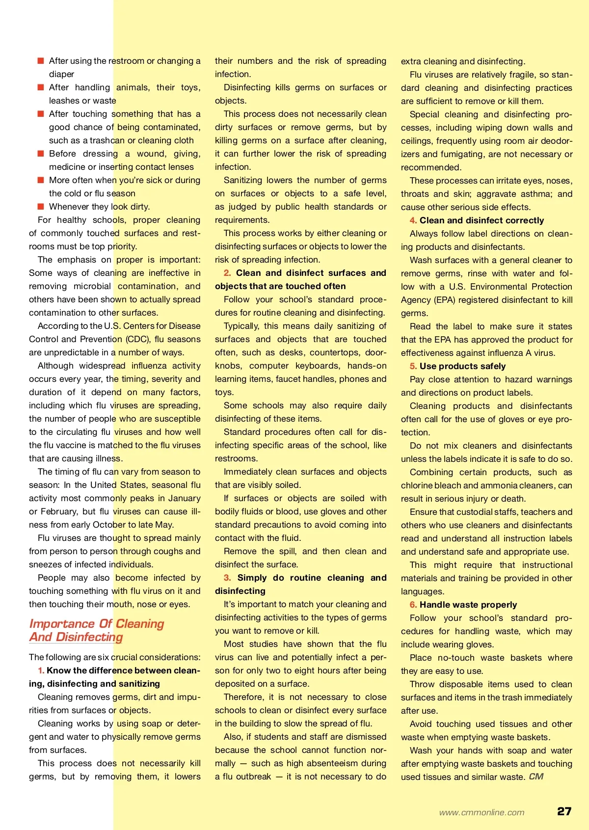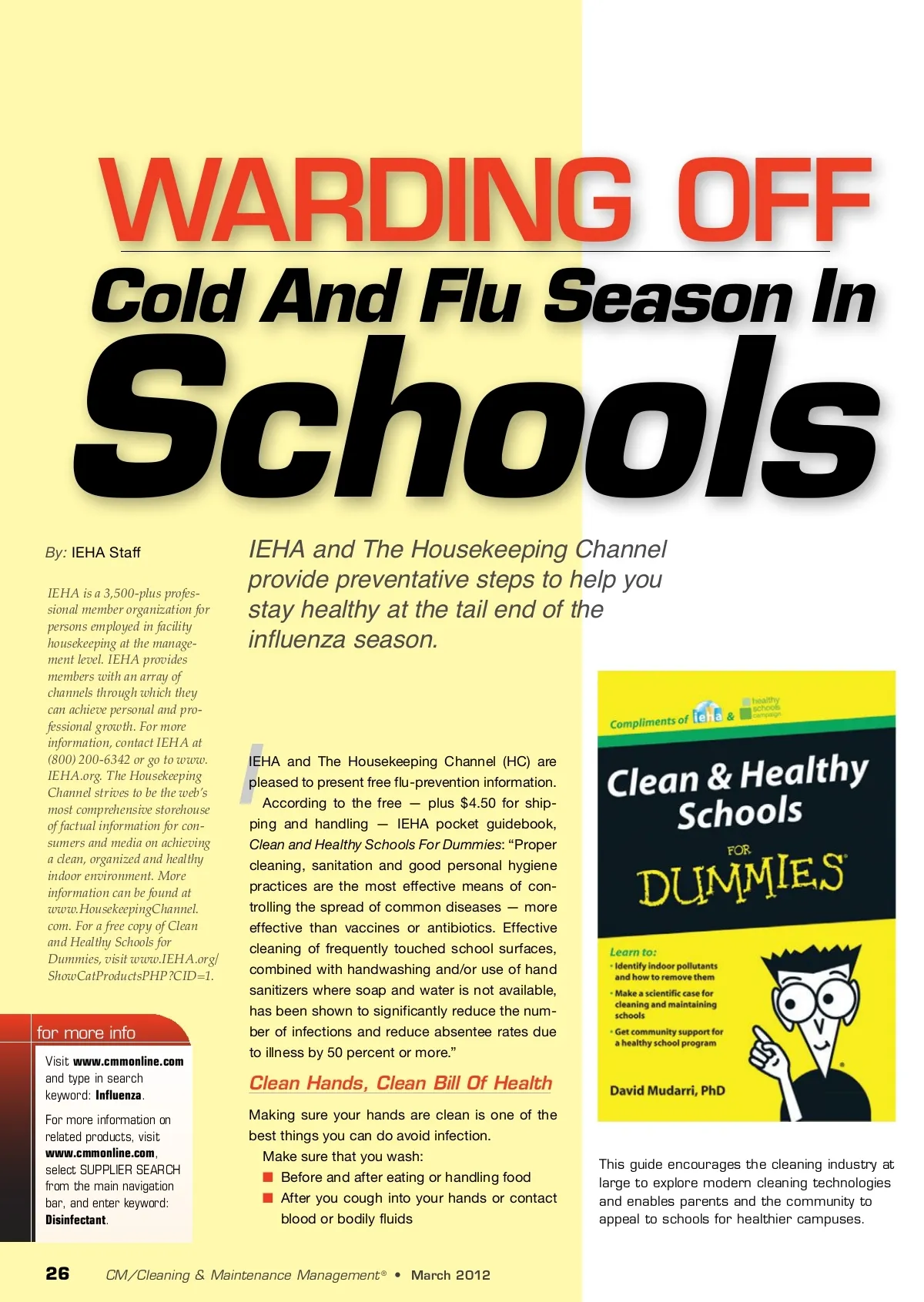 WARDING OFF Cold And Flu Season In Schools By: IEHA Staff IEHA is a 3,500-plus profes-sional member organization for persons employed in facility housekeeping at the manage-ment level. IEHA provides members with an array of channels through which they can achieve personal and pro-fessional growth. For more information, contact IEHA at (800) 200-6342 or go to www. IEHA.org. The Housekeeping Channel strives to be the web’s most comprehensive storehouse of factual information for con-sumers and media on achieving a clean, organized and healthy indoor environment. More information can be found at www.HousekeepingChannel. com. For a free copy of Clean and Healthy Schools for Dummies, visit www.IEHA.org/ ShowCatProductsPHP?CID=1. IEHA and The Housekeeping Channel provide preventative steps to help you stay healthy at the tail end of the influenza season. I for more info Visit www.cmmonline.com and type in search keyword: Influenza . For more information on related products, visit www.cmmonline.com , select SUPPLIER SEARCH from the main navigation bar, and enter keyword: Disinfectant . IEHA and The Housekeeping Channel (HC) are pleased to present free flu-prevention information. According to the free — plus $4.50 for ship-ping and handling — IEHA pocket guidebook, Clean and Healthy Schools For Dummies : “Proper cleaning, sanitation and good personal hygiene practices are the most effective means of con-trolling the spread of common diseases — more effective than vaccines or antibiotics. Effective cleaning of frequently touched school surfaces, combined with handwashing and/or use of hand sanitizers where soap and water is not available, has been shown to significantly reduce the num-ber of infections and reduce absentee rates due to illness by 50 percent or more.” Clean Hands, Clean Bill Of Health Making sure your hands are clean is one of the best things you can do avoid infection. Make sure that you wash: ■ Before and after eating or handling food ■ After you cough into your hands or contact blood or bodily fluids This guide encourages the cleaning industry at large to explore modern cleaning technologies and enables parents and the community to appeal to schools for healthier campuses. 26 CM/Cleaning & Maintenance Management ® • March 2012