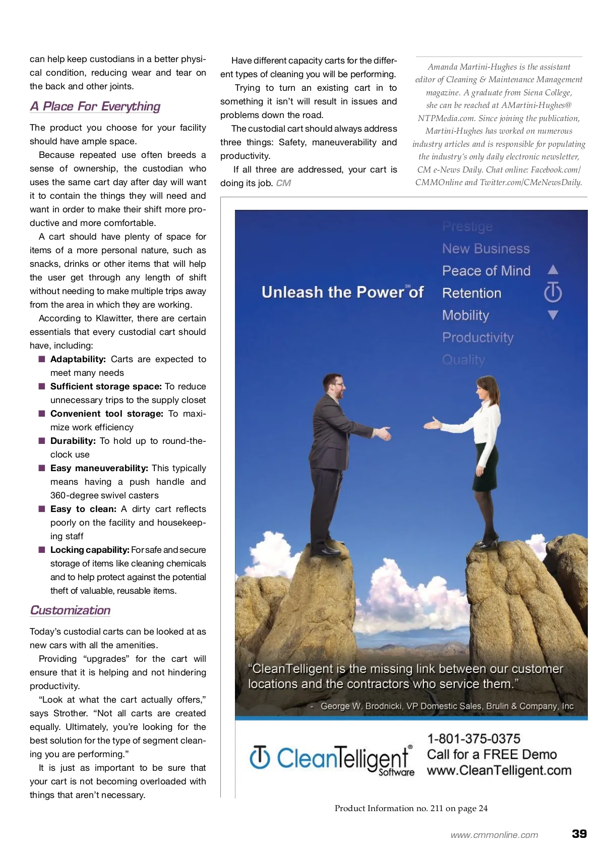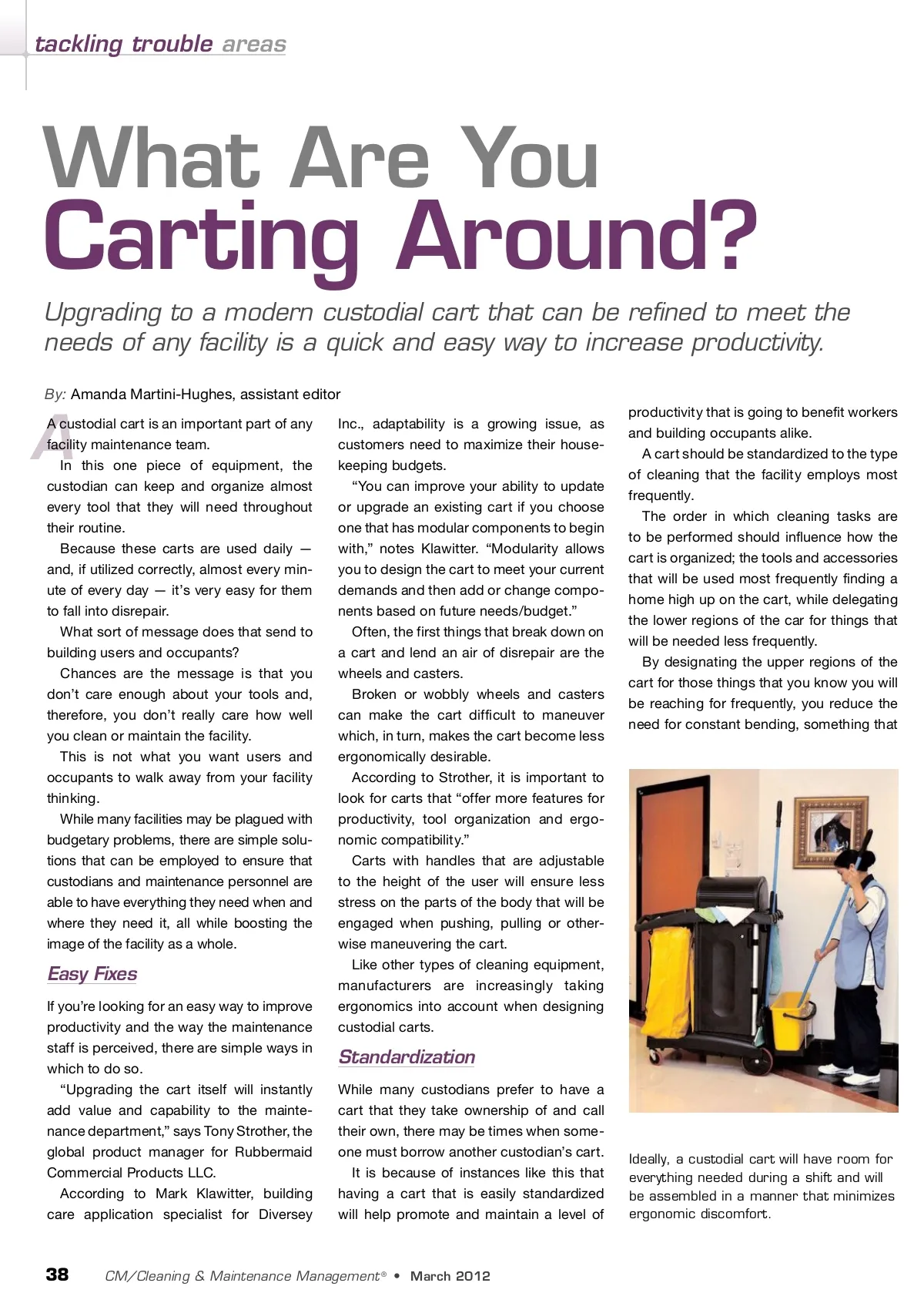 tackling trouble areas What Are You By: Amanda Martini-Hughes, assistant editor Carting Around? Upgrading to a modern custodial cart that can be refined to meet the needs of any facility is a quick and easy way to increase productivity. A A custodial cart is an important part of any facility maintenance team. In this one piece of equipment, the custodian can keep and organize almost every tool that they will need throughout their routine. Because these carts are used daily — and, if utilized correctly, almost every min-ute of every day — it’s very easy for them to fall into disrepair. What sort of message does that send to building users and occupants? Chances are the message is that you don’t care enough about your tools and, therefore, you don’t really care how well you clean or maintain the facility. This is not what you want users and occupants to walk away from your facility thinking. While many facilities may be plagued with budgetary problems, there are simple solu-tions that can be employed to ensure that custodians and maintenance personnel are able to have everything they need when and where they need it, all while boosting the image of the facility as a whole. Easy Fixes If you’re looking for an easy way to improve productivity and the way the maintenance staff is perceived, there are simple ways in which to do so. “Upgrading the cart itself will instantly add value and capability to the mainte-nance department,” says Tony Strother, the global product manager for Rubbermaid Commercial Products LLC. According to Mark Klawitter, building care application specialist for Diversey Inc., adaptability is a growing issue, as customers need to maximize their house-keeping budgets. “You can improve your ability to update or upgrade an existing cart if you choose one that has modular components to begin with,” notes Klawitter. “Modularity allows you to design the cart to meet your current demands and then add or change compo-nents based on future needs/budget.” Often, the first things that break down on a cart and lend an air of disrepair are the wheels and casters. Broken or wobbly wheels and casters can make the cart difficult to maneuver which, in turn, makes the cart become less ergonomically desirable. According to Strother, it is important to look for carts that “offer more features for productivity, tool organization and ergo-nomic compatibility.” Carts with handles that are adjustable to the height of the user will ensure less stress on the parts of the body that will be engaged when pushing, pulling or other-wise maneuvering the cart. Like other types of cleaning equipment, manufacturers are increasingly taking ergonomics into account when designing custodial carts. productivity that is going to benefit workers and building occupants alike. A cart should be standardized to the type of cleaning that the facility employs most frequently. The order in which cleaning tasks are to be performed should influence how the cart is organized; the tools and accessories that will be used most frequently finding a home high up on the cart, while delegating the lower regions of the car for things that will be needed less frequently. By designating the upper regions of the cart for those things that you know you will be reaching for frequently, you reduce the need for constant bending, something that Standardization While many custodians prefer to have a cart that they take ownership of and call their own, there may be times when some-one must borrow another custodian’s cart. It is because of instances like this that having a cart that is easily standardized will help promote and maintain a level of Ideally, a custodial cart will have room for everything needed during a shift and will be assembled in a manner that minimizes ergonomic discomfort. 38 CM/Cleaning & Maintenance Management ® • March 2012
