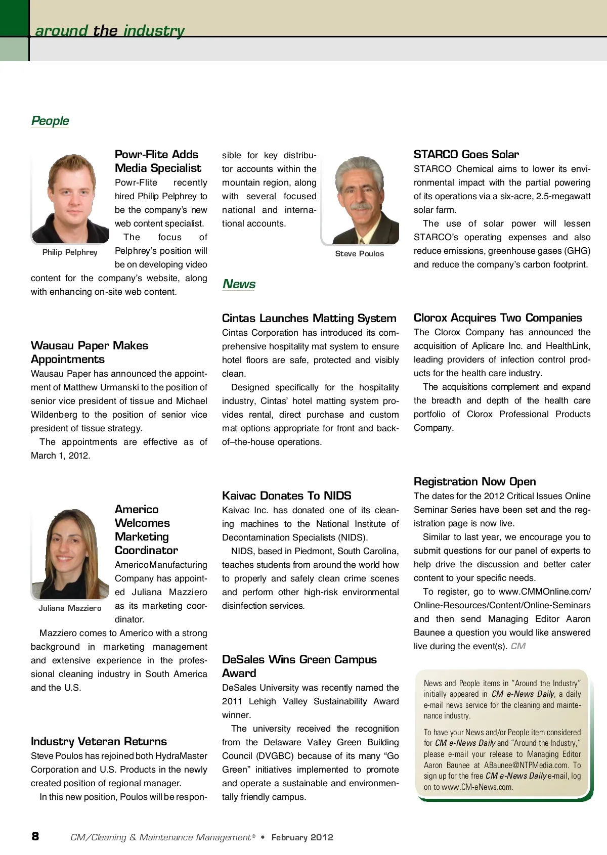 around the industry People Powr-Flite Adds Media Specialist Powr-Flite recently hired Philip Pelphrey to be the company’s new web content specialist. The focus of Pelphrey’s position will Philip Pelphrey be on developing video content for the company’s website, along with enhancing on-site web content. sible for key distribu-tor accounts within the mountain region, along with several focused national and interna-tional accounts. Steve Poulos STARCO Goes Solar STARCO Chemical aims to lower its envi-ronmental impact with the partial powering of its operations via a six-acre, 2.5-megawatt solar farm. The use of solar power will lessen STARCO’s operating expenses and also reduce emissions, greenhouse gases (GHG) and reduce the company’s carbon footprint. News Cintas Launches Matting System Clorox Acquires Two Companies The Clorox Company has announced the acquisition of Aplicare Inc. and HealthLink, leading providers of infection control prod-ucts for the health care industry. The acquisitions complement and expand the breadth and depth of the health care portfolio of Clorox Professional Products Company. Wausau Paper Makes Appointments Wausau Paper has announced the appoint-ment of Matthew Urmanski to the position of senior vice president of tissue and Michael Wildenberg to the position of senior vice president of tissue strategy. The appointments are effective as of March 1, 2012. Cintas Corporation has introduced its com-prehensive hospitality mat system to ensure hotel floors are safe, protected and visibly clean. Designed specifically for the hospitality industry, Cintas’ hotel matting system pro-vides rental, direct purchase and custom mat options appropriate for front and back-of–the-house operations. Registration Now Open Kaivac Donates To NIDS Americo Welcomes Marketing Coordinator Americo Manufacturing Company has appoint-ed Juliana Mazziero as its marketing coor-Juliana Mazziero dinator. Mazziero comes to Americo with a strong background in marketing management and extensive experience in the profes-sional cleaning industry in South America and the U.S. Kaivac Inc. has donated one of its clean-ing machines to the National Institute of Decontamination Specialists (NIDS). NIDS, based in Piedmont, South Carolina, teaches students from around the world how to properly and safely clean crime scenes and perform other high-risk environmental disinfection services. The dates for the 2012 Critical Issues Online Seminar Series have been set and the reg-istration page is now live. Similar to last year, we encourage you to submit questions for our panel of experts to help drive the discussion and better cater content to your specific needs. To register, go to www.CMMOnline.com/ Online-Resources/Content/Online-Seminars and then send Managing Editor Aaron Baunee a question you would like answered live during the event(s). CM DeSales Wins Green Campus Award DeSales University was recently named the 2011 Lehigh Valley Sustainability Award winner. The university received the recognition from the Delaware Valley Green Building Council (DVGBC) because of its many “Go Green” initiatives implemented to promote and operate a sustainable and environmen-tally friendly campus. News and People items in “Around the Industry” initially appeared in CM e-News Daily , a daily e-mail news service for the cleaning and mainte-nance industry. To have your News and/or People item considered for CM e-News Daily and “Around the Industry,” please e-mail your release to Managing Editor Aaron Baunee at [email protected]. To sign up for the free CM e-News Daily e-mail, log on to www.CM-eNews.com. Industry Veteran Returns Steve Poulos has rejoined both HydraMaster Corporation and U.S. Products in the newly created position of regional manager. In this new position, Poulos will be respon-8 CM/Cleaning & Maintenance Management ® • February 2012