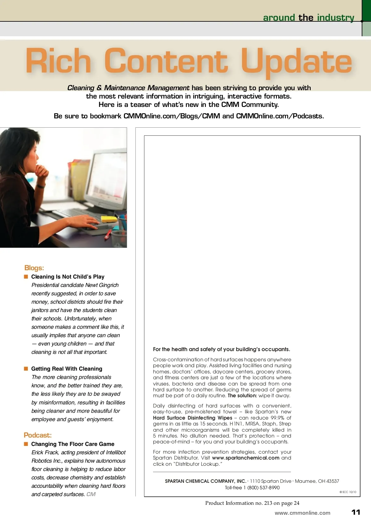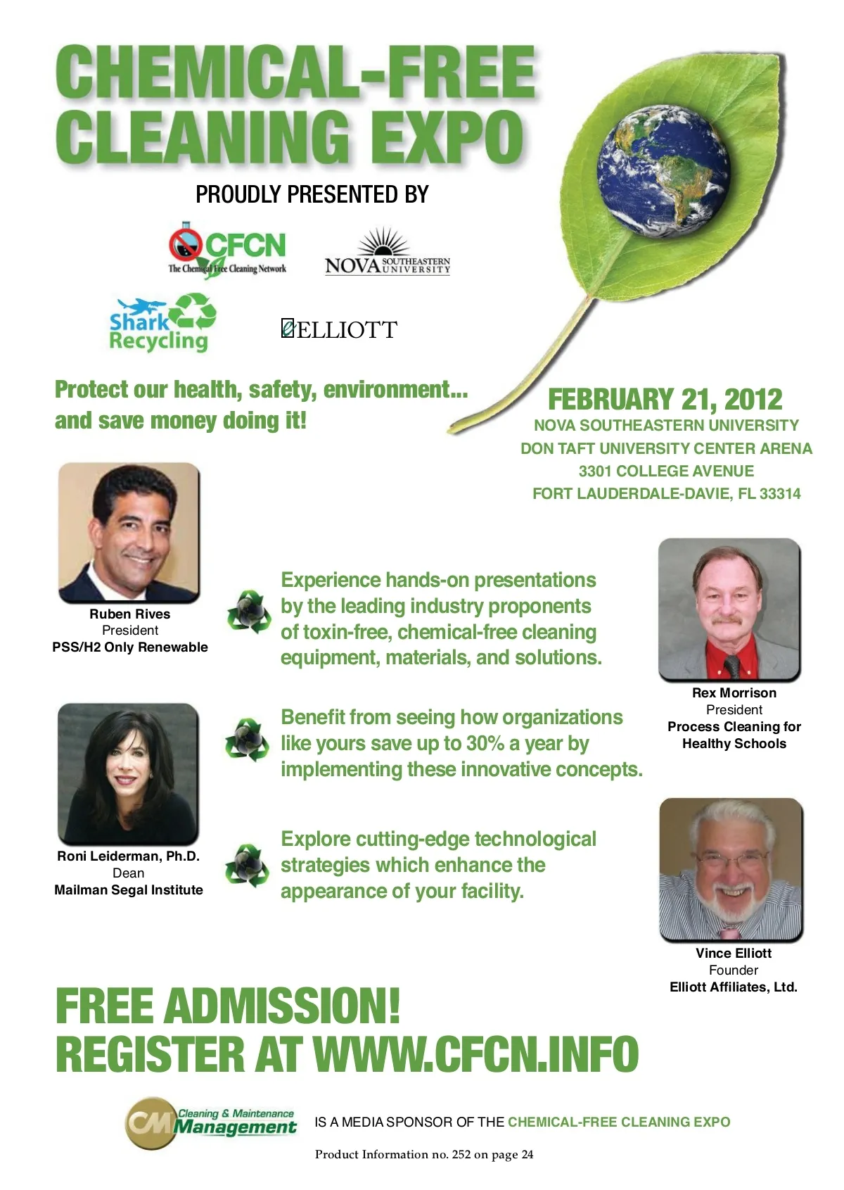 PROUDLY PRESENTED BY ELLIOTT Protect our health, safety, environment... and save money doing it! -EBRUARY 21, 2012 NOVA SOUTHEASTERN UNIVERSITY DON TAFT UNIVERSITY CENTER ARENA 3301 COLLEGE AVENUE FORT LAUDERDALE-DAVIE, FL 33314 Ruben Rives President PSS/H2 Only Renewable Experience hands-on presentations by the leading industry proponents of toxin-free, chemical-free cleaning equipment, materials, and solutions. Benefi t from seeing how organizations like yours save up to 30% a year by implementing these innovative concepts. Explore cutting-edge technological strategies which enhance the appearance of your facility. Vince Elliott Founder Elliott Affi liates, Ltd. Rex Morrison President Process Cleaning for Healthy Schools Roni Leiderman, Ph.D. Dean Mailman Segal Institute -REE ADMISSION! REGISTER AT WWW.C-CN.IN-O Product Information no. 252 on page 24 IS A MEDIA SPONSOR OF THE CHEMICAL-FREE CLEANING EXPO