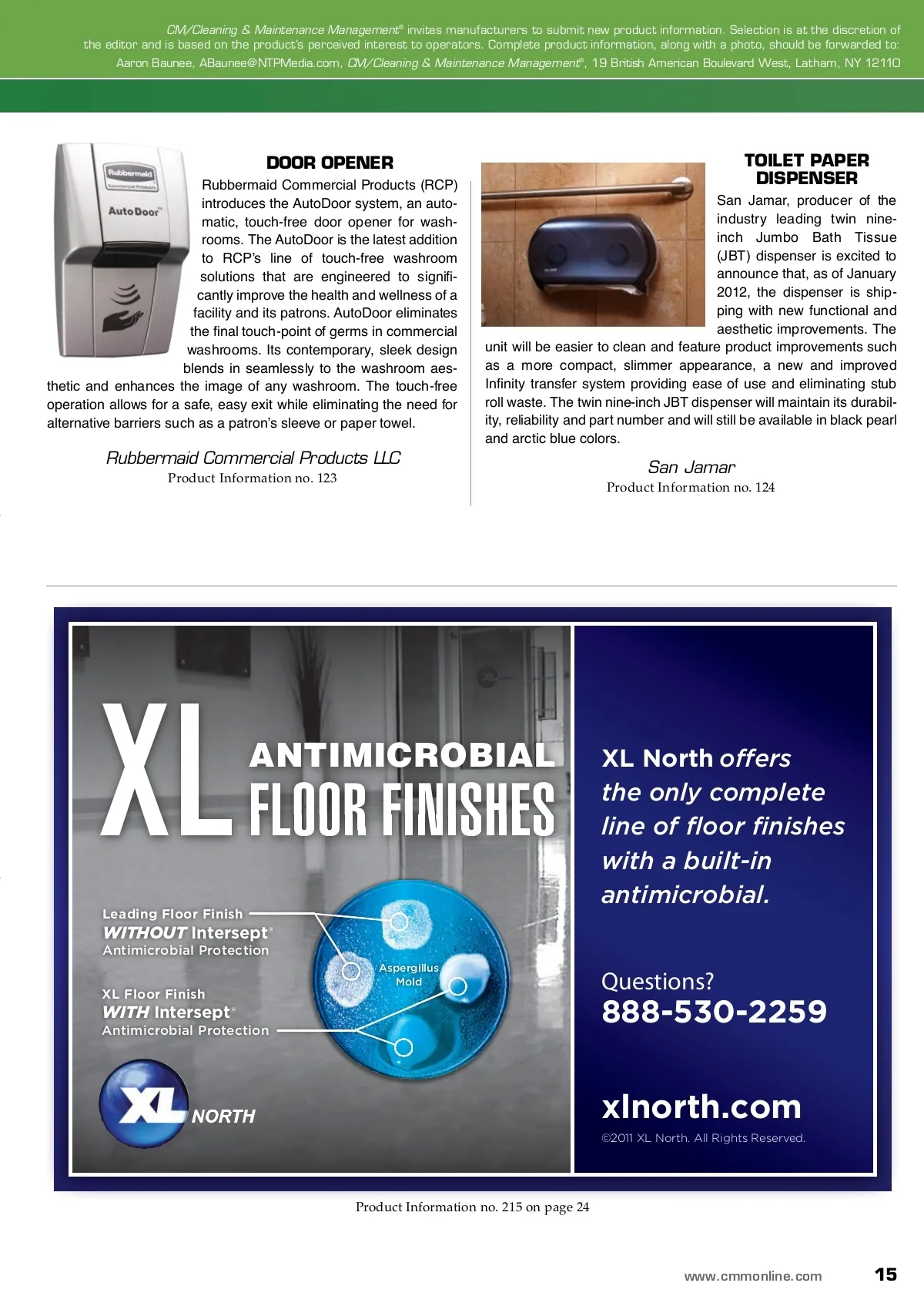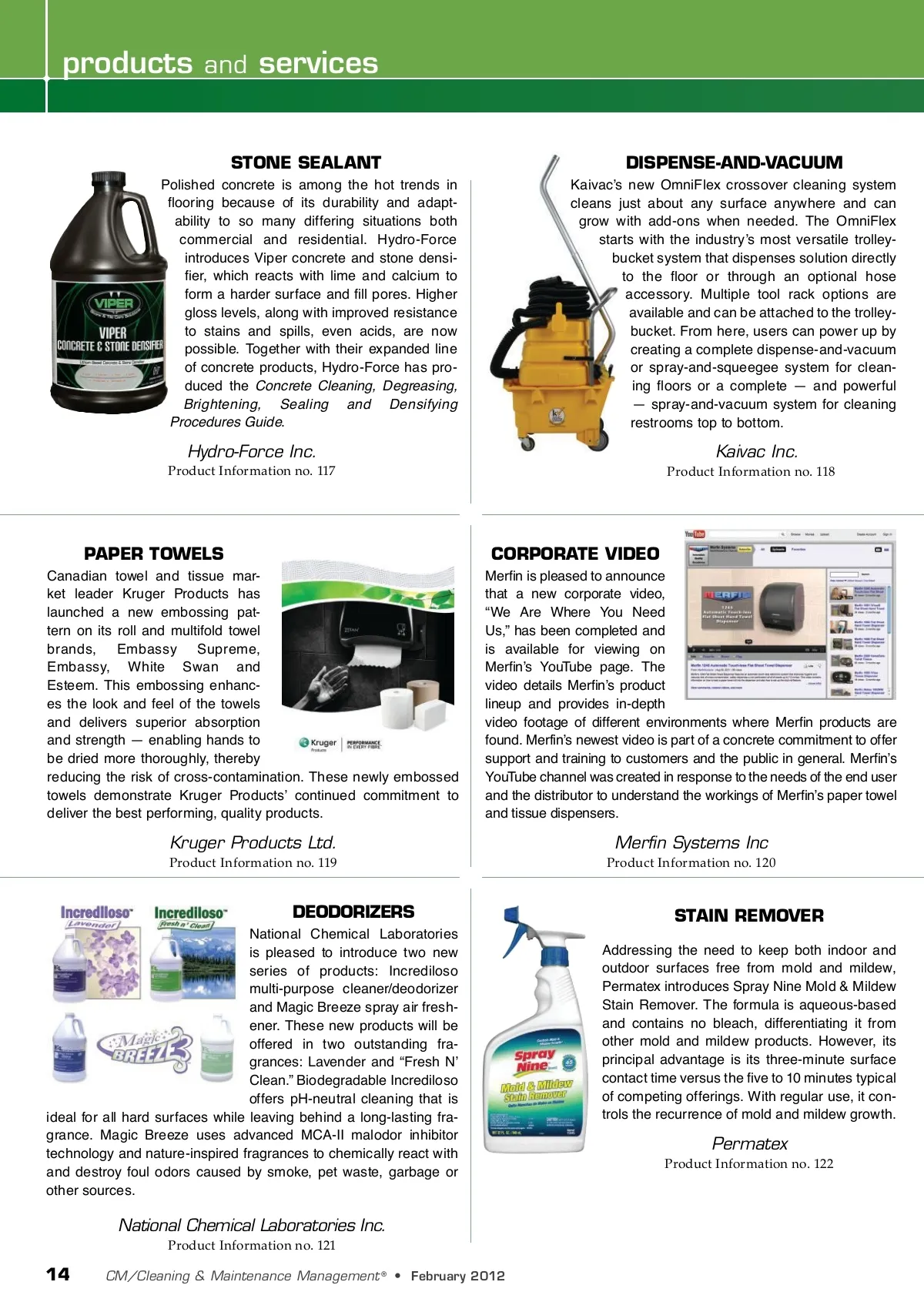 products and services STONE SEALANT Polished concrete is among the hot trends in flooring because of its durability and adapt-ability to so many differing situations both commercial and residential. Hydro-Force introduces Viper concrete and stone densi-fier, which reacts with lime and calcium to form a harder surface and fill pores. Higher gloss levels, along with improved resistance to stains and spills, even acids, are now possible. Together with their expanded line of concrete products, Hydro-Force has pro-duced the Concrete Cleaning, Degreasing, Brightening, Sealing and Densifying Procedures Guide . DISPENSE-AND-VACUUM Kaivac’s new OmniFlex crossover cleaning system cleans just about any surface anywhere and can grow with add-ons when needed. The OmniFlex starts with the industry’s most versatile trolley-bucket system that dispenses solution directly to the floor or through an optional hose accessory. Multiple tool rack options are available and can be attached to the trolley-bucket. From here, users can power up by creating a complete dispense-and-vacuum or spray-and-squeegee system for clean-ing floors or a complete — and powerful — spray-and-vacuum system for cleaning restrooms top to bottom. Hydro-Force Inc. Product Information no. 117 Kaivac Inc. Product Information no. 118 PAPER TOWELS Canadian towel and tissue mar-ket leader Kruger Products has launched a new embossing pat-tern on its roll and multifold towel brands, Embassy Supreme, Embassy, White Swan and Esteem. This embossing enhanc-es the look and feel of the towels and delivers superior absorption and strength — enabling hands to be dried more thoroughly, thereby reducing the risk of cross-contamination. These newly embossed towels demonstrate Kruger Products’ continued commitment to deliver the best performing, quality products. CORPORATE VIDEO Merfin is pleased to announce that a new corporate video, “We Are Where You Need Us,” has been completed and is available for viewing on Merfin’s YouTube page. The video details Merfin’s product lineup and provides in-depth video footage of different environments where Merfin products are found. Merfin’s newest video is part of a concrete commitment to offer support and training to customers and the public in general. Merfin’s YouTube channel was created in response to the needs of the end user and the distributor to understand the workings of Merfin’s paper towel and tissue dispensers. Kruger Products Ltd. Product Information no. 119 Merfin Systems Inc Product Information no. 120 DEODORIZERS National Chemical Laboratories is pleased to introduce two new series of products: Incrediloso multi-purpose cleaner/deodorizer and Magic Breeze spray air fresh-ener. These new products will be offered in two outstanding fra-grances: Lavender and “Fresh N’ Clean.” Biodegradable Incrediloso offers pH-neutral cleaning that is ideal for all hard surfaces while leaving behind a long-lasting fra-grance. Magic Breeze uses advanced MCA-II malodor inhibitor technology and nature-inspired fragrances to chemically react with and destroy foul odors caused by smoke, pet waste, garbage or other sources. STAIN REMOVER Addressing the need to keep both indoor and outdoor surfaces free from mold and mildew, Permatex introduces Spray Nine Mold & Mildew Stain Remover. The formula is aqueous-based and contains no bleach, differentiating it from other mold and mildew products. However, its principal advantage is its three-minute surface contact time versus the five to 10 minutes typical of competing offerings. With regular use, it con-trols the recurrence of mold and mildew growth. Permatex Product Information no. 122 National Chemical Laboratories Inc. Product Information no. 121 14 CM/Cleaning & Maintenance Management ® • February 2012
