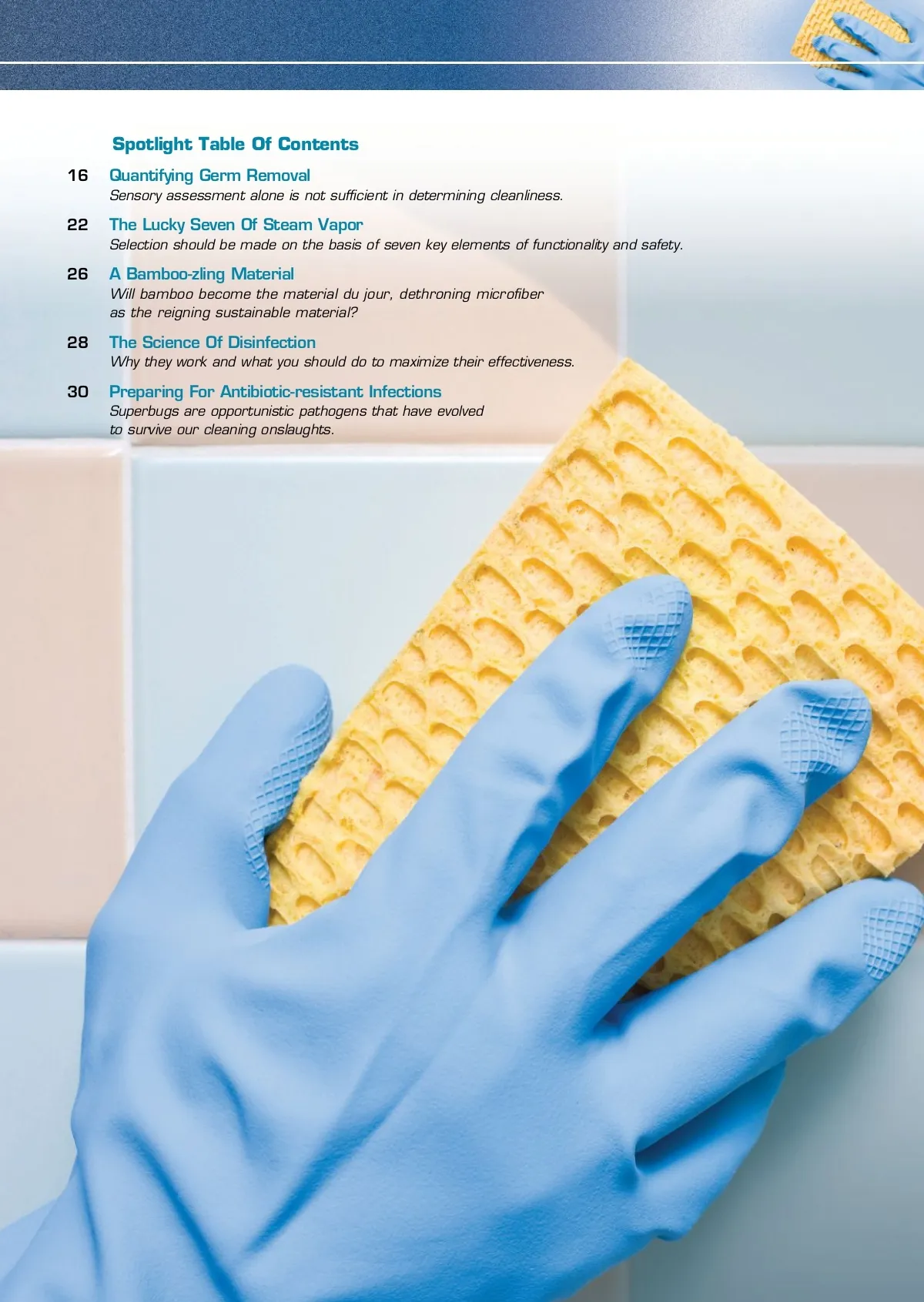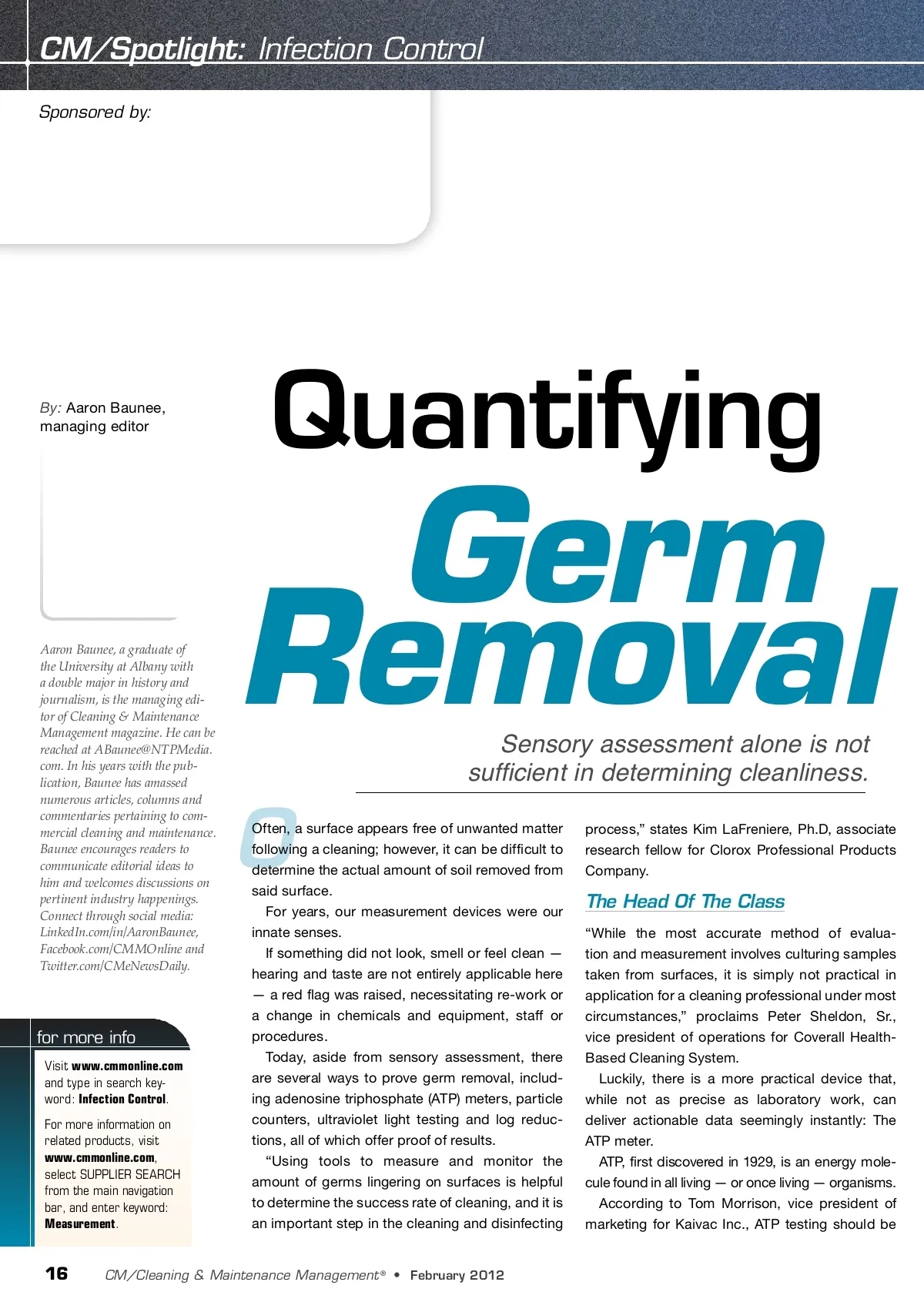CM/Spotlight: Infection Control Sponsored by: By: Aaron Baunee, managing editor Quantifying Aaron Baunee, a graduate of the University at Albany with a double major in history and journalism, is the managing edi-tor of Cleaning & Maintenance Management magazine. He can be reached at ABaunee@NTPMedia. com. In his years with the pub-lication, Baunee has amassed numerous articles, columns and commentaries pertaining to com-mercial cleaning and maintenance. Baunee encourages readers to communicate editorial ideas to him and welcomes discussions on pertinent industry happenings. Connect through social media: LinkedIn.com/in/AaronBaunee, Facebook.com/CMMOnline and Twitter.com/CMeNewsDaily. Germ Removal Sensory assessment alone is not sufficient in determining cleanliness. O for more info Visit www.cmmonline.com and type in search key-word: Infection Control . For more information on related products, visit www.cmmonline.com , select SUPPLIER SEARCH from the main navigation bar, and enter keyword: Measurement . Often, a surface appears free of unwanted matter following a cleaning; however, it can be difficult to determine the actual amount of soil removed from said surface. For years, our measurement devices were our innate senses. If something did not look, smell or feel clean — hearing and taste are not entirely applicable here — a red flag was raised, necessitating re-work or a change in chemicals and equipment, staff or procedures. Today, aside from sensory assessment, there are several ways to prove germ removal, includ-ing adenosine triphosphate (ATP) meters, particle counters, ultraviolet light testing and log reduc-tions, all of which offer proof of results. “Using tools to measure and monitor the amount of germs lingering on surfaces is helpful to determine the success rate of cleaning, and it is an important step in the cleaning and disinfecting process,” states Kim LaFreniere, Ph.D, associate research fellow for Clorox Professional Products Company. The Head Of The Class “While the most accurate method of evalua-tion and measurement involves culturing samples taken from surfaces, it is simply not practical in application for a cleaning professional under most circumstances,” proclaims Peter Sheldon, Sr., vice president of operations for Coverall Health-Based Cleaning System. Luckily, there is a more practical device that, while not as precise as laboratory work, can deliver actionable data seemingly instantly: The ATP meter. ATP, first discovered in 1929, is an energy mole-cule found in all living — or once living — organisms. According to Tom Morrison, vice president of marketing for Kaivac Inc., ATP testing should be 16 CM/Cleaning & Maintenance Management ® • February 2012