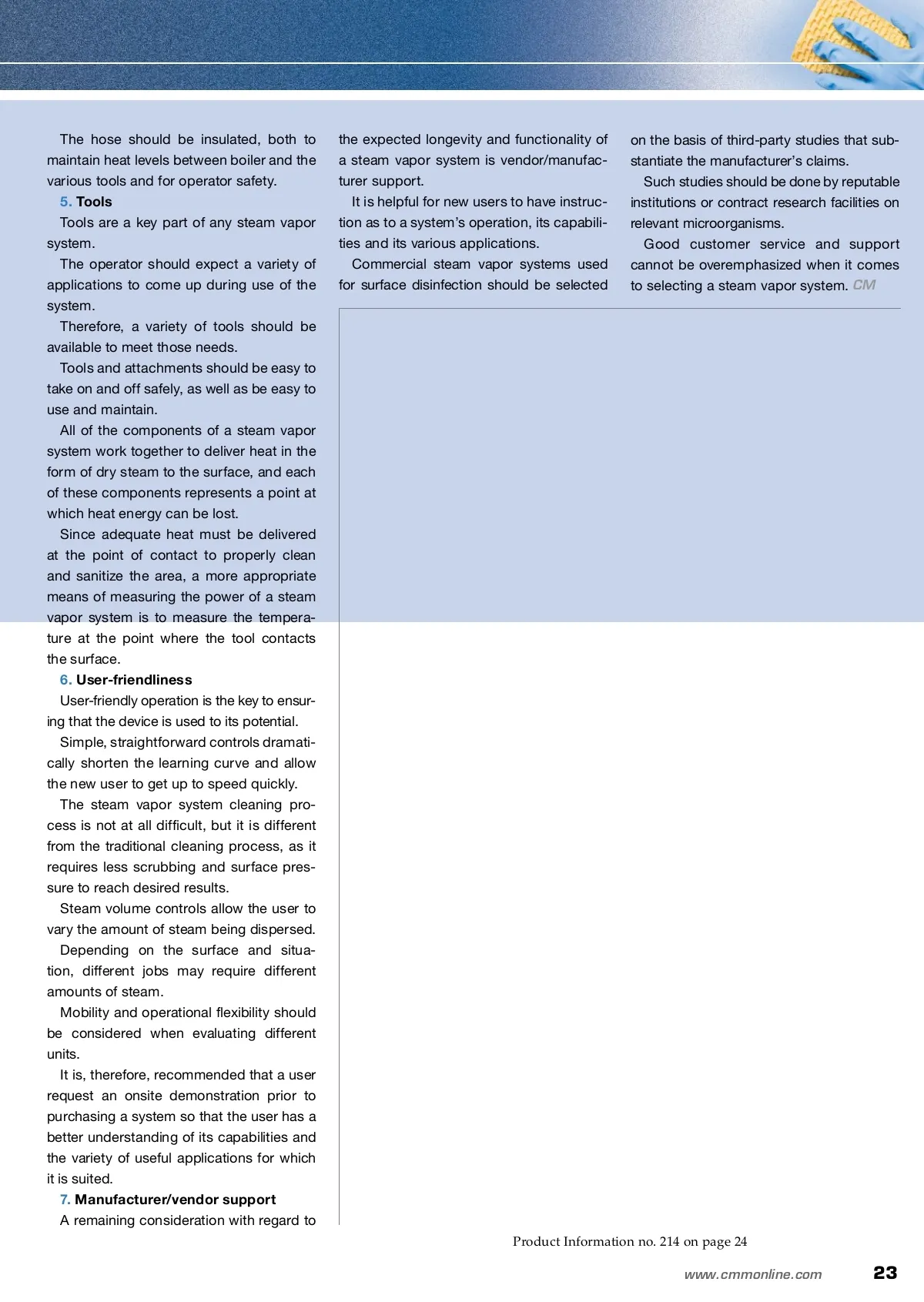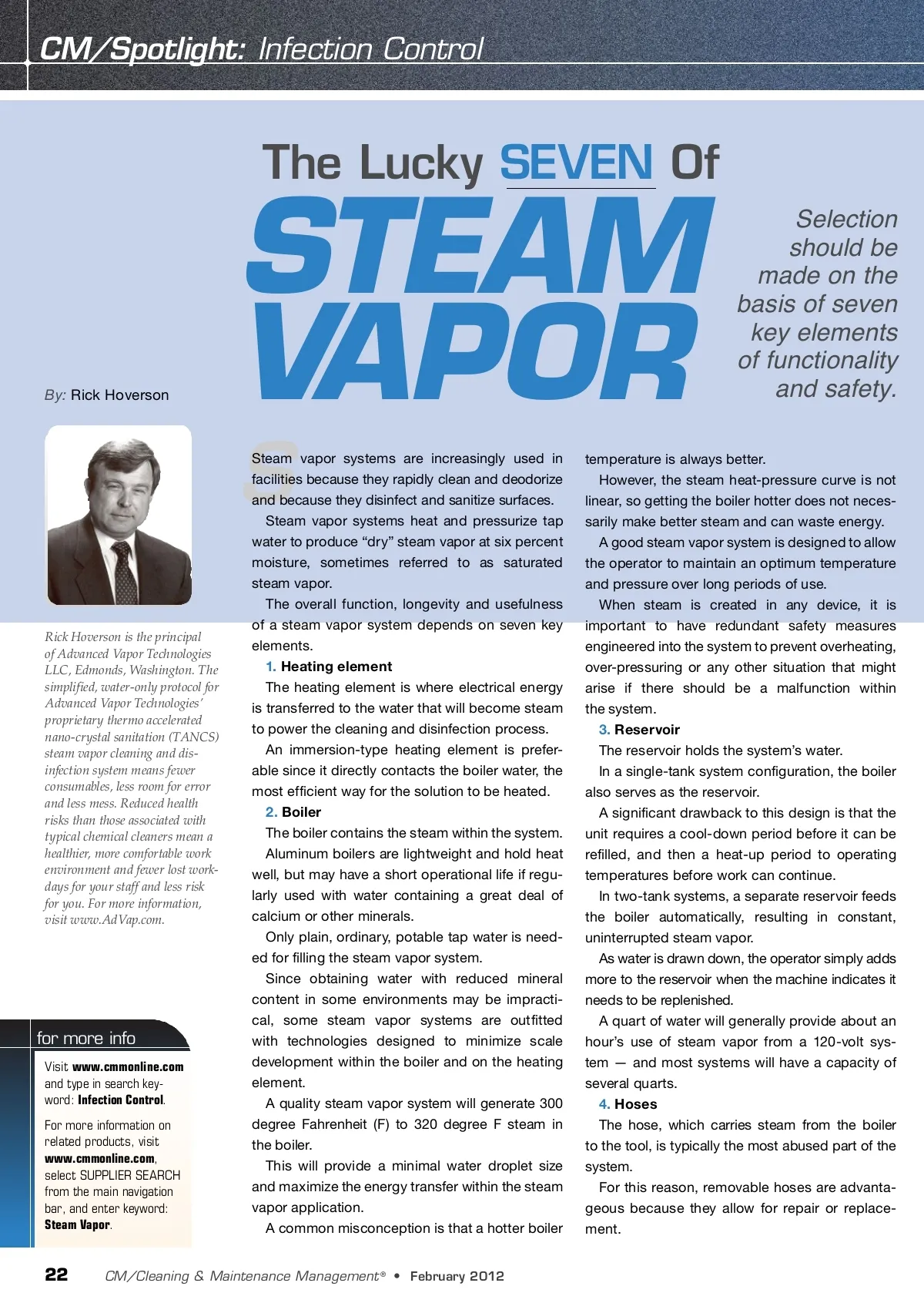 CM/Spotlight: Infection Control The Lucky SEVEN Of By: Rick Hoverson STEAM VAPOR S Steam vapor systems are increasingly used in facilities because they rapidly clean and deodorize and because they disinfect and sanitize surfaces. Steam vapor systems heat and pressurize tap water to produce “dry” steam vapor at six percent moisture, sometimes referred to as saturated steam vapor. The overall function, longevity and usefulness of a steam vapor system depends on seven key elements. 1. Heating element The heating element is where electrical energy is transferred to the water that will become steam to power the cleaning and disinfection process. An immersion-type heating element is prefer-able since it directly contacts the boiler water, the most efficient way for the solution to be heated. 2. Boiler The boiler contains the steam within the system. Aluminum boilers are lightweight and hold heat well, but may have a short operational life if regu-larly used with water containing a great deal of calcium or other minerals. Only plain, ordinary, potable tap water is need-ed for filling the steam vapor system. Since obtaining water with reduced mineral content in some environments may be impracti-cal, some steam vapor systems are outfitted with technologies designed to minimize scale development within the boiler and on the heating element. A quality steam vapor system will generate 300 degree Fahrenheit (F) to 320 degree F steam in the boiler. This will provide a minimal water droplet size and maximize the energy transfer within the steam vapor application. A common misconception is that a hotter boiler Selection should be made on the basis of seven key elements of functionality and safety. Rick Hoverson is the principal of Advanced Vapor Technologies LLC, Edmonds, Washington. The simplified, water-only protocol for Advanced Vapor Technologies’ proprietary thermo accelerated nano-crystal sanitation (TANCS) steam vapor cleaning and dis-infection system means fewer consumables, less room for error and less mess. Reduced health risks than those associated with typical chemical cleaners mean a healthier, more comfortable work environment and fewer lost work-days for your staff and less risk for you. For more information, visit www.AdVap.com. for more info Visit www.cmmonline.com and type in search key-word: Infection Control . For more information on related products, visit www.cmmonline.com , select SUPPLIER SEARCH from the main navigation bar, and enter keyword: Steam Vapor . temperature is always better. However, the steam heat-pressure curve is not linear, so getting the boiler hotter does not neces-sarily make better steam and can waste energy. A good steam vapor system is designed to allow the operator to maintain an optimum temperature and pressure over long periods of use. When steam is created in any device, it is important to have redundant safety measures engineered into the system to prevent overheating, over-pressuring or any other situation that might arise if there should be a malfunction within the system. 3. Reservoir The reservoir holds the system’s water. In a single-tank system configuration, the boiler also serves as the reservoir. A significant drawback to this design is that the unit requires a cool-down period before it can be refilled, and then a heat-up period to operating temperatures before work can continue. In two-tank systems, a separate reservoir feeds the boiler automatically, resulting in constant, uninterrupted steam vapor. As water is drawn down, the operator simply adds more to the reservoir when the machine indicates it needs to be replenished. A quart of water will generally provide about an hour’s use of steam vapor from a 120-volt sys-tem — and most systems will have a capacity of several quarts. 4. Hoses The hose, which carries steam from the boiler to the tool, is typically the most abused part of the system. For this reason, removable hoses are advanta-geous because they allow for repair or replace-ment. 22 CM/Cleaning & Maintenance Management ® • February 2012