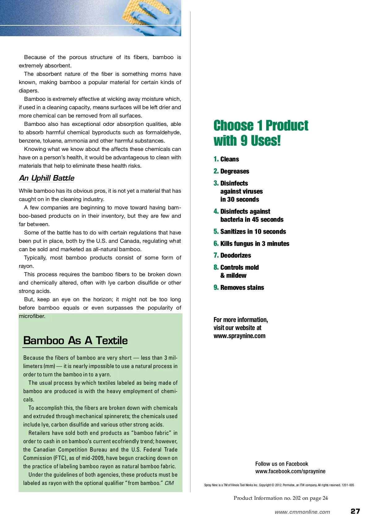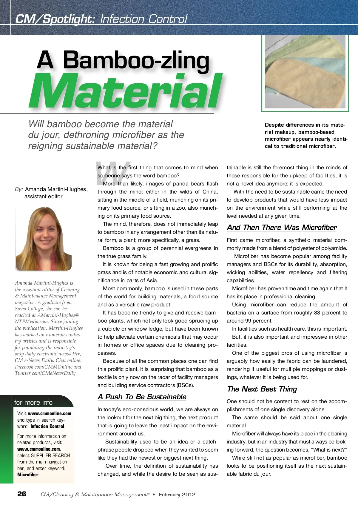CM/Spotlight: Infection Control Material Will bamboo become the material du jour, dethroning microfiber as the reigning sustainable material? Despite differences in its mate-rial makeup, bamboo-based microfiber appears nearly identi-cal to traditional microfiber. A Bamboo-zling By: Amanda Martini-Hughes, assistant editor W Amanda Martini-Hughes is the assistant editor of Cleaning & Maintenance Management magazine. A graduate from Siena College, she can be reached at AMartini-Hughes@ NTPMedia.com. Since joining the publication, Martini-Hughes has worked on numerous indus-try articles and is responsible for populating the industry’s only daily electronic newsletter, CM e-News Daily. Chat online: Facebook.com/CMMOnline and Twitter.com/CMeNewsDaily. What is the first thing that comes to mind when someone says the word bamboo? More than likely, images of panda bears flash through the mind; either in the wilds of China, sitting in the middle of a field, munching on its pri-mary food source, or sitting in a zoo, also munch-ing on its primary food source. The mind, therefore, does not immediately leap to bamboo in any arrangement other than its natu-ral form, a plant; more specifically, a grass. Bamboo is a group of perennial evergreens in the true grass family. It is known for being a fast growing and prolific grass and is of notable economic and cultural sig-nificance in parts of Asia. Most commonly, bamboo is used in these parts of the world for building materials, a food source and as a versatile raw product. It has become trendy to give and receive bam-boo plants, which not only look good sprucing up a cubicle or window ledge, but have been known to help alleviate certain chemicals that may occur in homes or office spaces due to cleaning pro-cesses. Because of all the common places one can find this prolific plant, it is surprising that bamboo as a textile is only now on the radar of facility managers and building service contractors (BSCs). tainable is still the foremost thing in the minds of those responsible for the upkeep of facilities, it is not a novel idea anymore; it is expected. With the need to be sustainable came the need to develop products that would have less impact on the environment while still performing at the level needed at any given time. And Then There Was Microfiber First came microfiber, a synthetic material com-monly made from a blend of polyester of polyamide. Microfiber has become popular among facility managers and BSCs for its durability, absorption, wicking abilities, water repellency and filtering capabilities. Microfiber has proven time and time again that it has its place in professional cleaning. Using microfiber can reduce the amount of bacteria on a surface from roughly 33 percent to around 99 percent. In facilities such as health care, this is important. But, it is also important and impressive in other facilities. One of the biggest pros of using microfiber is arguably how easily the fabric can be laundered, rendering it useful for multiple moppings or dust-ings, whatever it is being used for. The Next Best Thing One should not be content to rest on the accom-plishments of one single discovery alone. The same should be said about one single material. Microfiber will always have its place in the cleaning industry, but in an industry that must always be look-ing forward, the question becomes, “What is next?” While still not as popular as microfiber, bamboo looks to be positioning itself as the next sustain-able fabric du jour. A Push To Be Sustainable for more info Visit www.cmmonline.com and type in search key-word: Infection Control . For more information on related products, visit www.cmmonline.com , select SUPPLIER SEARCH from the main navigation bar, and enter keyword: Microfiber . In today’s eco-conscious world, we are always on the lookout for the next big thing, the next product that is going to leave the least impact on the envi-ronment around us. Sustainability used to be an idea or a catch-phrase people dropped when they wanted to seem like they had the newest or biggest next thing. Over time, the definition of sustainability has changed, and while the desire to be seen as sus-26 CM/Cleaning & Maintenance Management ® • February 2012