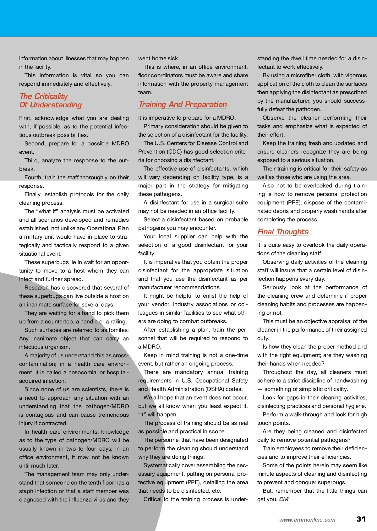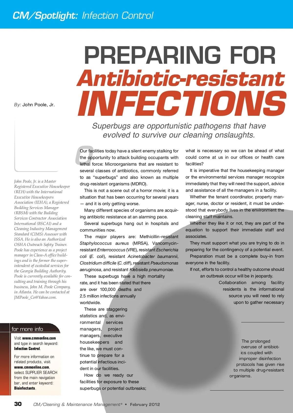 CM/Spotlight: Infection Control PREPARING FOR Antibiotic-resistant By: John Poole, Jr. INFECTIONS Superbugs are opportunistic pathogens that have evolved to survive our cleaning onslaughts. O John Poole, Jr. is a Master Registered Executive Housekeeper (REH) with the International Executive Housekeepers Association (IEHA), a Registered Building Services Manager (RBSM) with the Building Services Contractor Association International (BSCAI) and a Cleaning Industry Management Standard (CIMS) Assessor with ISSA. He is also an Authorized OSHA Outreach Safety Trainer. Poole has experience as a project manager in Class-A office build-ings and is the former the super-intendent of custodial services for the Georgia Building Authority. Poole is currently available for con-sulting and training through his business, John M. Poole Company, in Atlanta. He can be contacted at [email protected]. for more info Visit www.cmmonline.com and type in search keyword: Infection Control . For more information on related products, visit www.cmmonline.com , select SUPPLIER SEARCH from the main navigation bar, and enter keyword: Disinfectants . Our facilities today have a silent enemy stalking for the opportunity to attack building occupants with lethal force: Microorganisms that are resistant to several classes of antibiotics, commonly referred to as “superbugs” and also known as multiple drug-resistant organisms (MDRO). This is not a scene out of a horror movie; it is a situation that has been occurring for several years — and it is only getting worse. Many different species of organisms are acquir-ing antibiotic resistance at an alarming pace. Several superbugs hang out in hospitals and communities now. The major players are: Methicillin-resistant Staphylococcus aureus (MRSA), Vancomycin-resistant Enterrococcus (VRE), resistant Escherichia coli ( E. coli ), resistant Acinetobacter baumannii , Clostridium difficile ( C. diff ), resistant Pseudomonas aeruginosa , and resistant Klebsiella pneumoniae . These superbugs have a high mortality rate, and it has been stated that there are over 100,000 deaths and 2.5 million infections annually worldwide. These are staggering statistics and, as envi-ronmental services managers, project managers, executive housekeepers and the like, we must con-tinue to prepare for a potential infectious inci-dent in our facilities. How do we ready our facilities for exposure to these superbugs or potential outbreaks; what is necessary so we can be ahead of what could come at us in our offices or health care facilities? It is imperative that the housekeeping manager or the environmental services manager recognize immediately that they will need the support, advice and assistance of all the managers in a facility. Whether the tenant coordinator, property man-ager, nurse, doctor or resident, it must be under-stood that everybody lives in the environment the cleaning staff maintains. Whether they like it or not, they are part of the equation to support their immediate staff and associates. They must support what you are trying to do in preparing for the contingency of a potential event. Preparation must be a complete buy-in from everyone in the facility. If not, efforts to control a healthy outcome should an outbreak occur will be in jeopardy. Collaboration among facility residents is the informational source you will need to rely upon to gather necessary The prolonged overuse of antibiot-ics coupled with improper disinfection protocols has given rise to multiple drug-resistant organisms. 30 CM/Cleaning & Maintenance Management ® • February 2012