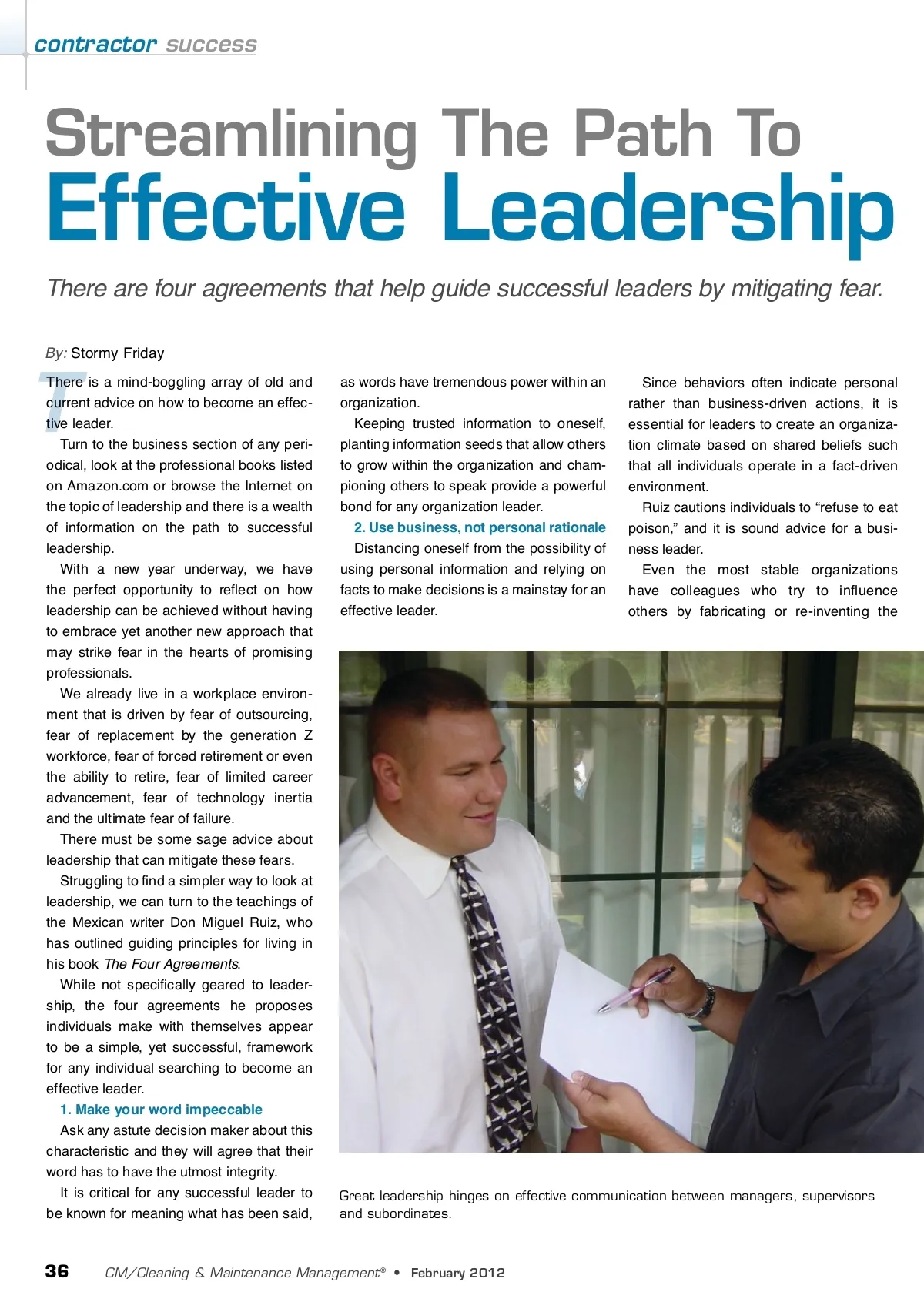 contractor success Streamlining The Path To Effective Leadership There are four agreements that help guide successful leaders by mitigating fear. By: Stormy Friday T There is a mind-boggling array of old and current advice on how to become an effec-tive leader. Turn to the business section of any peri-odical, look at the professional books listed on Amazon.com or browse the Internet on the topic of leadership and there is a wealth of information on the path to successful leadership. With a new year underway, we have the perfect opportunity to reflect on how leadership can be achieved without having to embrace yet another new approach that may strike fear in the hearts of promising professionals. We already live in a workplace environ-ment that is driven by fear of outsourcing, fear of replacement by the generation Z workforce, fear of forced retirement or even the ability to retire, fear of limited career advancement, fear of technology inertia and the ultimate fear of failure. There must be some sage advice about leadership that can mitigate these fears. Struggling to find a simpler way to look at leadership, we can turn to the teachings of the Mexican writer Don Miguel Ruiz, who has outlined guiding principles for living in his book The Four Agreements . While not specifically geared to leader-ship, the four agreements he proposes individuals make with themselves appear to be a simple, yet successful, framework for any individual searching to become an effective leader. 1. Make your word impeccable Ask any astute decision maker about this characteristic and they will agree that their word has to have the utmost integrity. It is critical for any successful leader to be known for meaning what has been said, as words have tremendous power within an organization. Keeping trusted information to oneself, planting information seeds that allow others to grow within the organization and cham-pioning others to speak provide a powerful bond for any organization leader. 2. Use business, not personal rationale Distancing oneself from the possibility of using personal information and relying on facts to make decisions is a mainstay for an effective leader. Since behaviors often indicate personal rather than business-driven actions, it is essential for leaders to create an organiza-tion climate based on shared beliefs such that all individuals operate in a fact-driven environment. Ruiz cautions individuals to “refuse to eat poison,” and it is sound advice for a busi-ness leader. Even the most stable organizations have colleagues who try to influence others by fabricating or re-inventing the Great leadership hinges on effective communication between managers, supervisors and subordinates. 36 CM/Cleaning & Maintenance Management ® • February 2012