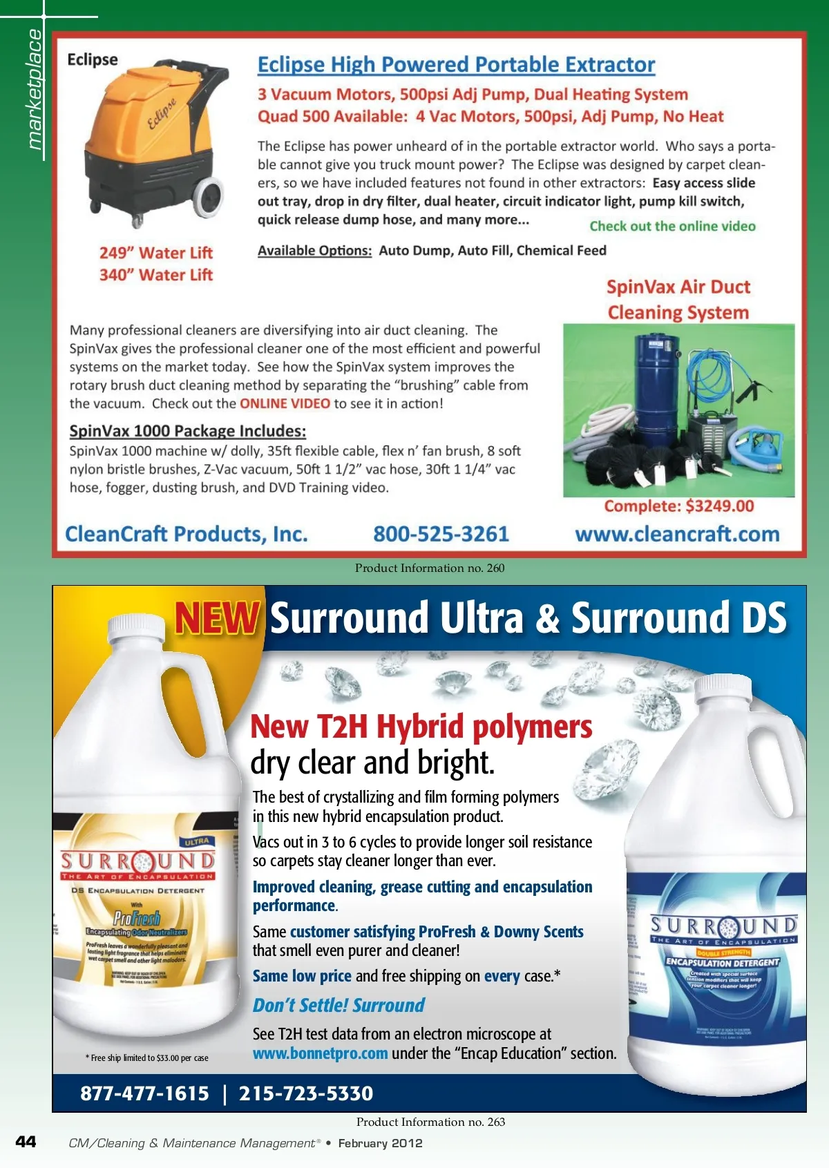 marketplace Product Information no. 260 NEW Surround Ultra & Surround DS New T2H Hybrid polymers dry clear and bright. The best of crystallizing and fi lm forming polymers in this new hybrid encapsulation product. Vacs out in 3 to 6 cycles to provide longer soil resistance so carpets stay cleaner longer than ever. Improved cleaning, grease cutting and encapsulation performance . Same customer satisfying ProFresh & Downy Scents that smell even purer and cleaner! Same low price and free shipping on every case.* Don’t Settle! Surround * Free ship limited to $33.00 per case See T2H test data from an electron microscope at www.bonnetpro.com under the “Encap Education” section. 877-477-1615 | 215-723-5330 Product Information no. 263 44 CM/Cleaning & Maintenance Management • February 2012 ®
