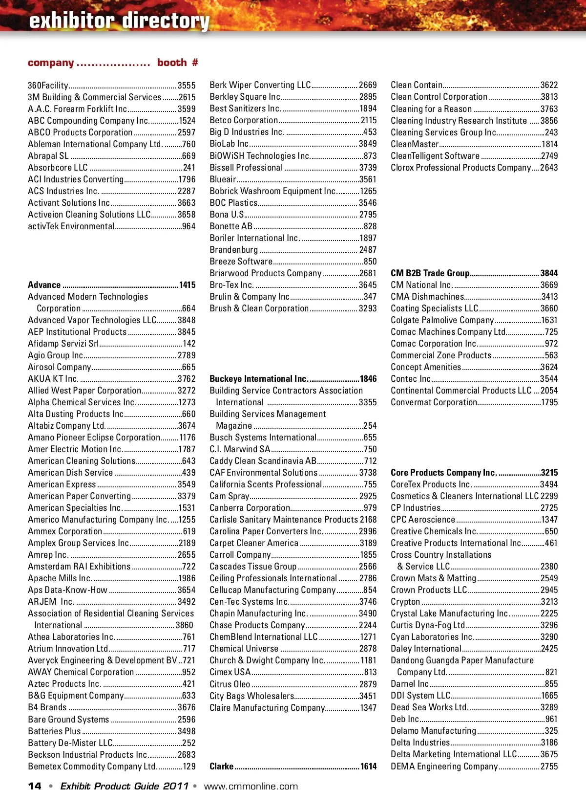exhibitor directory company .................... booth # 360Facility ........................................................ 3555 3M Building & Commercial Services ........2615 A.A.C. Forearm Forklift Inc. ........................ 3599 ABC Compounding Company Inc. ..............1524 ABCO Products Corporation ...................... 2597 Ableman International Company Ltd. .........760 Abrapal SL ..........................................................669 Absorbcore LLC ................................................ 241 ACI Industries Converting ............................1796 ACS Industries Inc. ....................................... 2287 Activant Solutions Inc. .................................3663 Activeion Cleaning Solutions LLC ............. 3658 activTek Environmental ...................................964 Berk Wiper Converting LLC ........................ 2669 Berkley Square Inc. ....................................... 2895 Best Sanitizers Inc. ........................................1894 Betco Corporation .......................................... 2115 Big D Industries Inc. ........................................453 BioLab Inc. .......................................................3849 BiOWiSH Technologies Inc. ...........................873 Bissell Professional ...................................... 3739 Blueair ................................................................3561 Bobrick Washroom Equipment Inc. ...........1265 BOC Plastics.................................................... 3546 Bona U.S........................................................... 2795 Bonette AB .........................................................828 Boriler International Inc. ..............................1897 Brandenburg ................................................... 2487 Breeze Software ...............................................850 Briarwood Products Company ...................2681 Bro-Tex Inc. ..................................................... 3645 Brulin & Company Inc. .....................................347 Brush & Clean Corporation ......................... 3293 Clean Contain .................................................. 3622 Clean Control Corporation ...........................3813 Cleaning for a Reason .................................. 3763 Cleaning Industry Research Institute ..... 3856 Cleaning Services Group Inc. ........................243 CleanMaster .....................................................1814 CleanTelligent Software ...............................2749 Clorox Professional Products Company ....2643 Advance ............................................................ 1415 Advanced Modern Technologies Corporation ....................................................664 Advanced Vapor Technologies LLC ..........3848 AEP Institutional Products ......................... 3845 Afidamp Servizi Srl ...........................................142 Agio Group Inc. ............................................... 2789 Airosol Company ...............................................665 AKUA KT Inc. ...................................................3762 Allied West Paper Corporation .................. 3272 Alpha Chemical Services Inc. .....................1273 Alta Dusting Products Inc. .............................660 Altabiz Company Ltd. .....................................3674 Amano Pioneer Eclipse Corporation ......... 1176 Amer Electric Motion Inc. ............................1787 American Cleaning Solutions ........................643 American Dish Service ...................................439 American Express ......................................... 3549 American Paper Converting ....................... 3379 American Specialties Inc. ............................1531 Americo Manufacturing Company Inc. ....1255 Ammex Corporation ......................................... 619 Amplex Group Services Inc. ........................2189 Amrep Inc. ....................................................... 2655 Amsterdam RAI Exhibitions ..........................722 Apache Mills Inc. ............................................1986 Aps Data-Know-How ................................... 3654 ARJEM Inc. .................................................... 3492 Association of Residential Cleaning Services International ...............................................3860 Athea Laboratories Inc. ..................................761 Atrium Innovation Ltd. ..................................... 717 Averyck Engineering & Development BV ..721 AWAY Chemical Corporation ........................952 Aztec Products Inc. .........................................421 B&G Equipment Company ..............................633 B4 Brands ........................................................ 3676 Bare Ground Systems .................................. 2596 Batteries Plus .................................................3498 Battery De-Mister LLC ....................................252 Beckson Industrial Products Inc............... 2683 Bemetex Commodity Company Ltd. ............129 Buckeye International Inc. ..........................1846 Building Service Contractors Association International ............................................... 3355 Building Services Management Magazine .........................................................254 Busch Systems International ........................655 C.I. Marwind SA ................................................750 Caddy Clean Scandinavia AB ........................ 712 CAF Environmental Solutions .................... 3738 California Scents Professional .....................755 Cam Spray ........................................................ 2925 Canberra Corporation ......................................979 Carlisle Sanitary Maintenance Products 2168 Carolina Paper Converters Inc. ................. 2996 Carpet Cleaner America ...............................3189 Carroll Company ..............................................1855 Casca