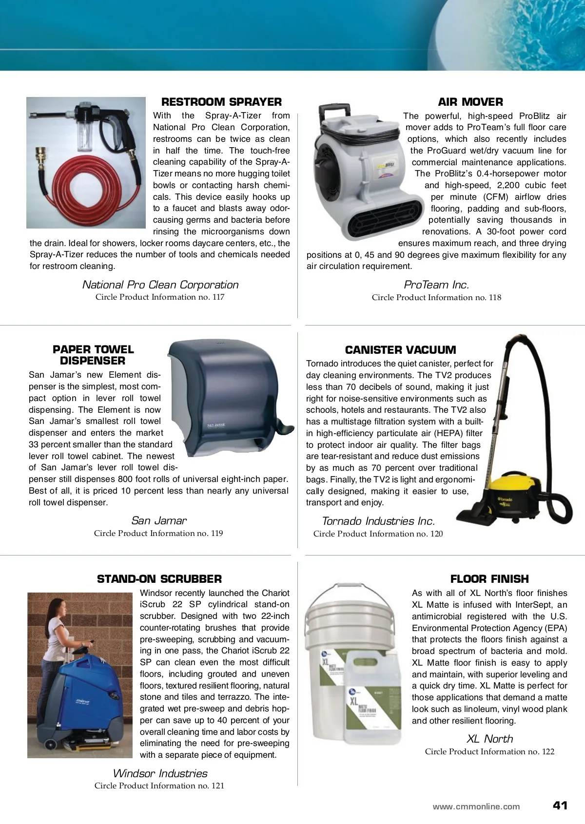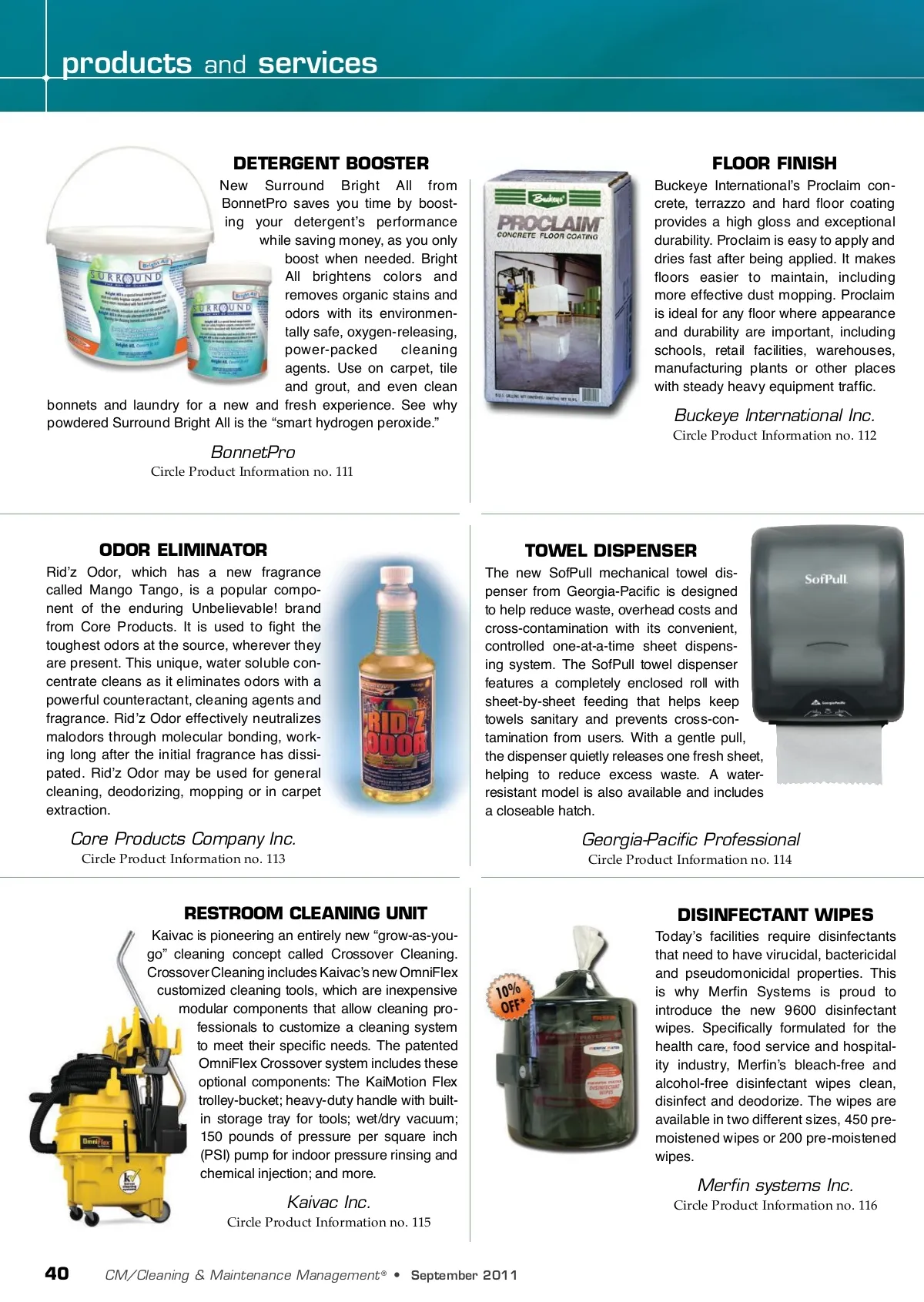 products and services DETERGENT BOOSTER New Surround Bright All from BonnetPro saves you time by boost-ing your detergent’s performance while saving money, as you only boost when needed. Bright All brightens colors and removes organic stains and odors with its environmen-tally safe, oxygen-releasing, power-packed cleaning agents. Use on carpet, tile and grout, and even clean bonnets and laundry for a new and fresh experience. See why powdered Surround Bright All is the “smart hydrogen peroxide.” FLOOR FINISH Buckeye International’s Proclaim con-crete, terrazzo and hard floor coating provides a high gloss and exceptional durability. Proclaim is easy to apply and dries fast after being applied. It makes floors easier to maintain, including more effective dust mopping. Proclaim is ideal for any floor where appearance and durability are important, including schools, retail facilities, warehouses, manufacturing plants or other places with steady heavy equipment traffic. Buckeye International Inc. Circle Product Information no. 112 BonnetPro Circle Product Information no. 111 ODOR ELIMINATOR Rid’z Odor, which has a new fragrance called Mango Tango, is a popular compo-nent of the enduring Unbelievable! brand from Core Products. It is used to fight the toughest odors at the source, wherever they are present. This unique, water soluble con-centrate cleans as it eliminates odors with a powerful counteractant, cleaning agents and fragrance. Rid’z Odor effectively neutralizes malodors through molecular bonding, work-ing long after the initial fragrance has dissi-pated. Rid’z Odor may be used for general cleaning, deodorizing, mopping or in carpet extraction. TOWEL DISPENSER The new SofPull mechanical towel dis-penser from Georgia-Pacific is designed to help reduce waste, overhead costs and cross-contamination with its convenient, controlled one-at-a-time sheet dispens-ing system. The SofPull towel dispenser features a completely enclosed roll with sheet-by-sheet feeding that helps keep towels sanitary and prevents cross-con-tamination from users. With a gentle pull, the dispenser quietly releases one fresh sheet, helping to reduce excess waste. A water-resistant model is also available and includes a closeable hatch. Core Products Company Inc. Circle Product Information no. 113 Georgia-Pacific Professional Circle Product Information no. 114 RESTROOM CLEANING UNIT Kaivac is pioneering an entirely new “grow-as-you-go” cleaning concept called Crossover Cleaning. Crossover Cleaning includes Kaivac’s new OmniFlex customized cleaning tools, which are inexpensive modular components that allow cleaning pro-fessionals to customize a cleaning system to meet their specific needs. The patented OmniFlex Crossover system includes these optional components: The KaiMotion Flex trolley-bucket; heavy-duty handle with built-in storage tray for tools; wet/dry vacuum; 150 pounds of pressure per square inch (PSI) pump for indoor pressure rinsing and chemical injection; and more. DISINFECTANT WIPES Today’s facilities require disinfectants that need to have virucidal, bactericidal and pseudomonicidal properties. This is why Merfin Systems is proud to introduce the new 9600 disinfectant wipes. Specifically formulated for the health care, food service and hospital-ity industry, Merfin’s bleach-free and alcohol-free disinfectant wipes clean, disinfect and deodorize. The wipes are available in two different sizes, 450 pre-moistened wipes or 200 pre-moistened wipes. Merfin systems Inc. Circle Product Information no. 116 Kaivac Inc. Circle Product Information no. 115 40 CM/Cleaning & Maintenance Management ® • September 2011