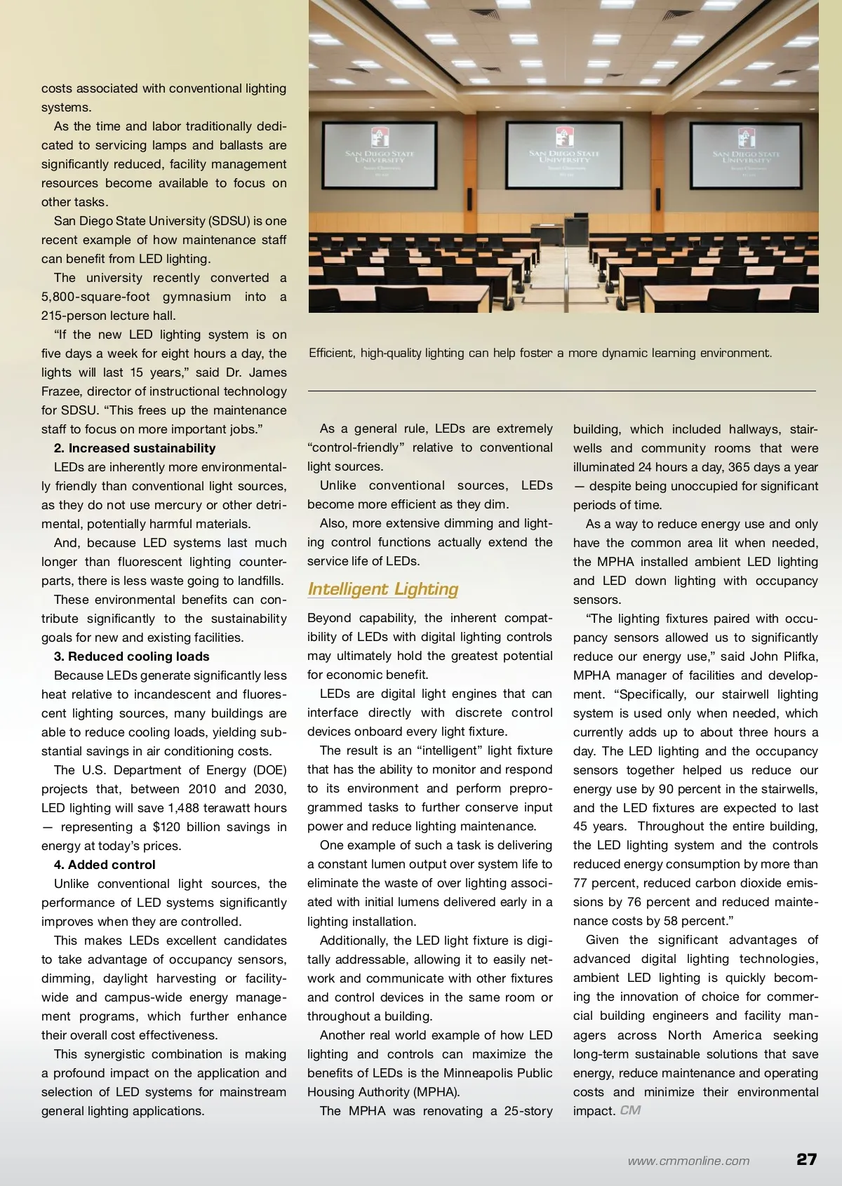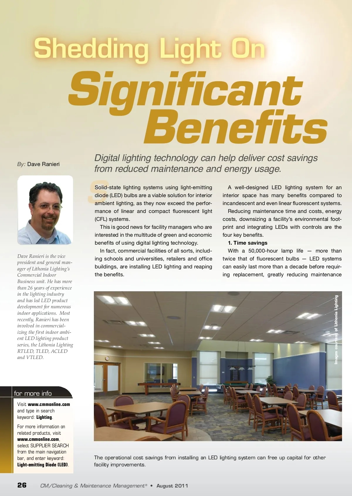 Shedding Light On Significant Benefits By: Dave Ranieri Digital lighting technology can help deliver cost savings from reduced maintenance and energy usage. S Dave Ranieri is the vice president and general man-ager of Lithonia Lighting’s Commercial Indoor Business unit. He has more than 26 years of experience in the lighting industry and has led LED product development for numerous indoor applications. Most recently, Ranieri has been involved in commercial-izing the first indoor ambi-ent LED lighting product series, the Lithonia Lighting RTLED, TLED, ACLED and VTLED. Solid-state lighting systems using light-emitting diode (LED) bulbs are a viable solution for interior ambient lighting, as they now exceed the perfor-mance of linear and compact fluorescent light (CFL) systems. This is good news for facility managers who are interested in the multitude of green and economic benefits of using digital lighting technology. In fact, commercial facilities of all sorts, includ-ing schools and universities, retailers and office buildings, are installing LED lighting and reaping the benefits. A well-designed LED lighting system for an interior space has many benefits compared to incandescent and even linear fluorescent systems. Reducing maintenance time and costs, energy costs, downsizing a facility’s environmental foot-print and integrating LEDs with controls are the four key benefits. 1. Time savings With a 50,000-hour lamp life — more than twice that of fluorescent bulbs — LED systems can easily last more than a decade before requir-ing replacement, greatly reducing maintenance for more info Visit www.cmmonline.com and type in search keyword: Lighting . For more information on related products, visit www.cmmonline.com , select SUPPLIER SEARCH from the main navigation bar, and enter keyword: Light-emitting Diode (LED) . The operational cost savings from installing an LED lighting system can free up capital for other facility improvements. 26 CM/Cleaning & Maintenance Management ® • August 2011 Images courtesy of Lithonia Lighting