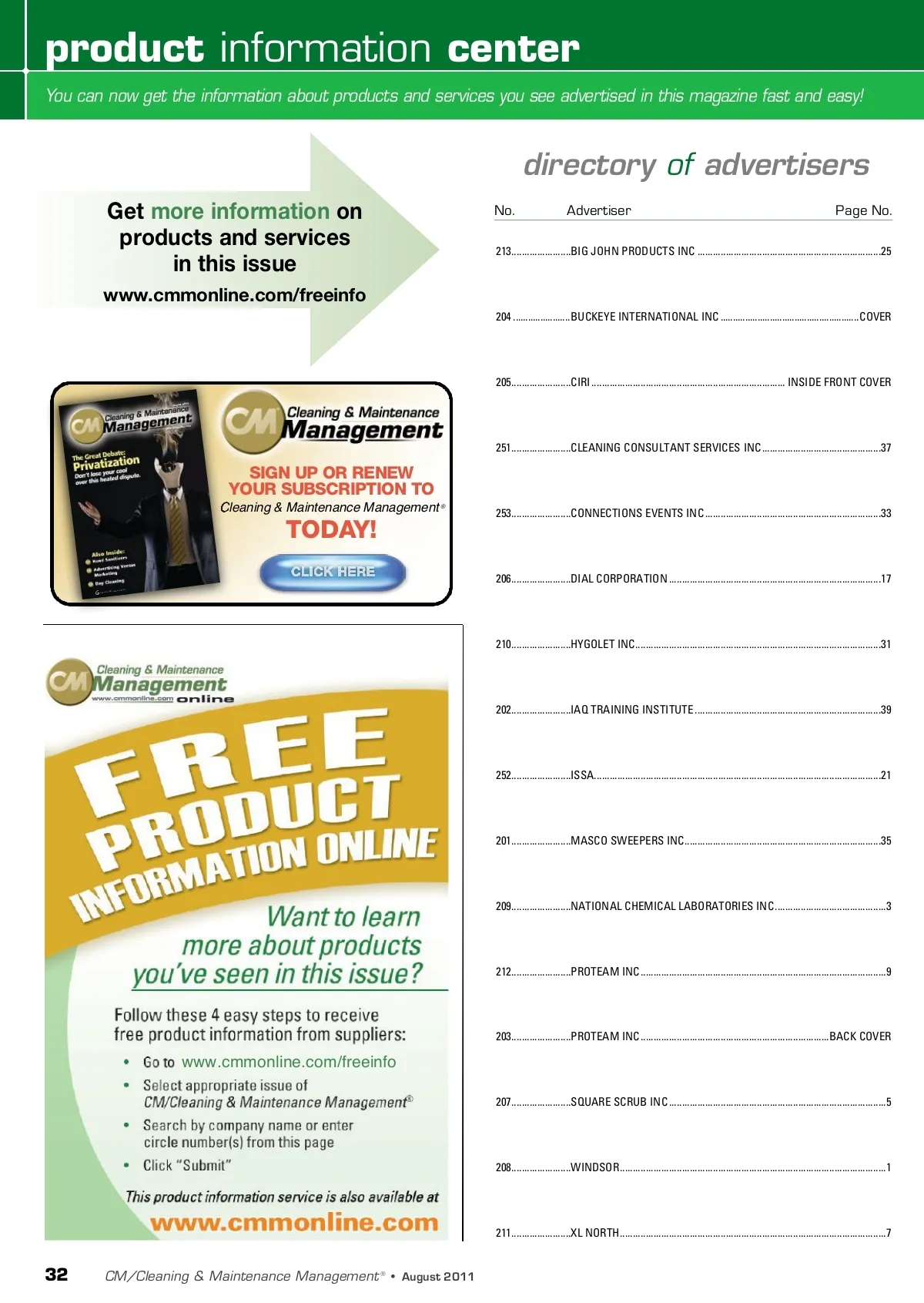 product information center You can now get the information about products and services you see advertised in this magazine fast and easy! directory of advertisers Get more information on products and services in this issue www.cmmonline.com/freeinfo 204 .......................BUCKEYE INTERNATIONAL INC ........................................................COVER No. Advertiser Page No. 213.......................BIG JOHN PRODUCTS INC .......................................................................25 205.......................CIRI ........................................................................... INSIDE FRONT COVER August 2011 nline.com www.cmmo 251.......................CLEANING CONSULTANT SERVICES INC ..............................................37 SIGN UP OR RENEW YOUR SUBSCRIPTION TO Cleaning & Maintenance Management ® 253.......................CONNECTIONS EVENTS INC ....................................................................33 TODAY! 206.......................DIAL CORPORATION ..................................................................................17 V G GRAND EDIA VIEW M GROUP 210.......................HYGOLET INC ...............................................................................................31 202.......................IAQ TRAINING INSTITUTE ........................................................................39 252.......................ISSA ...............................................................................................................21 201.......................MASCO SWEEPERS INC ............................................................................35 209.......................NATIONAL CHEMICAL LABORATORIES INC ...........................................3 212.......................PROTEAM INC ...............................................................................................9 203.......................PROTEAM INC .........................................................................BACK COVER www.cmmonline.com/freeinfo 207.......................SQUARE SCRUB INC ....................................................................................5 208.......................WINDSOR .......................................................................................................1 211.......................XL NORTH .......................................................................................................7 32 CM/Cleaning & Maintenance Management ® • August 2011