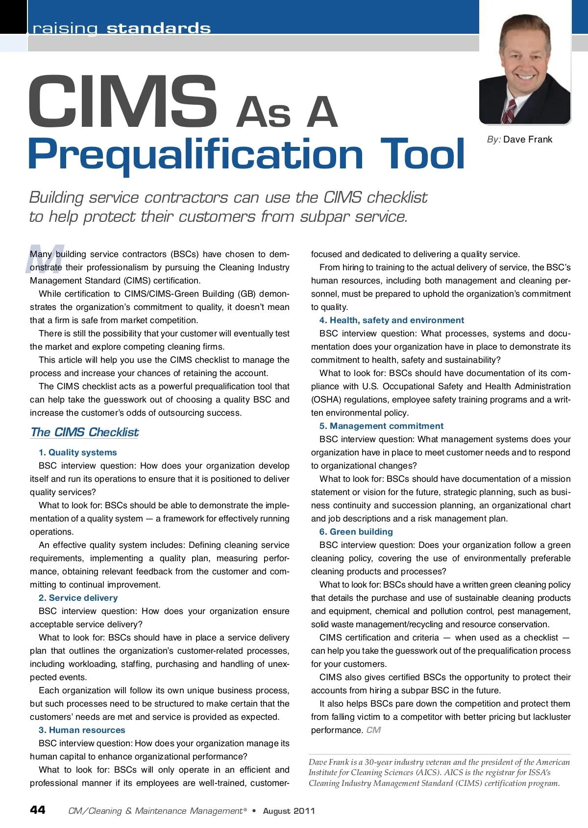 raising standards CIMS As A M Many building service contractors (BSCs) have chosen to dem-onstrate their professionalism by pursuing the Cleaning Industry Management Standard (CIMS) certification. While certification to CIMS/CIMS-Green Building (GB) demon-strates the organization’s commitment to quality, it doesn’t mean that a firm is safe from market competition. There is still the possibility that your customer will eventually test the market and explore competing cleaning firms. This article will help you use the CIMS checklist to manage the process and increase your chances of retaining the account. The CIMS checklist acts as a powerful prequalification tool that can help take the guesswork out of choosing a quality BSC and increase the customer’s odds of outsourcing success. Prequalification Tool Building service contractors can use the CIMS checklist to help protect their customers from subpar service. By: Dave Frank The CIMS Checklist 1. Quality systems BSC interview question: How does your organization develop itself and run its operations to ensure that it is positioned to deliver quality services? What to look for: BSCs should be able to demonstrate the imple-mentation of a quality system — a framework for effectively running operations. An effective quality system includes: Defining cleaning service requirements, implementing a quality plan, measuring perfor-mance, obtaining relevant feedback from the customer and com-mitting to continual improvement. 2. Service delivery BSC interview question: How does your organization ensure acceptable service delivery? What to look for: BSCs should have in place a service delivery plan that outlines the organization’s customer-related processes, including workloading, staffing, purchasing and handling of unex-pected events. Each organization will follow its own unique business process, but such processes need to be structured to make certain that the customers’ needs are met and service is provided as expected. 3. Human resources BSC interview question: How does your organization manage its human capital to enhance organizational performance? What to look for: BSCs will only operate in an efficient and professional manner if its employees are well-trained, customer-focused and dedicated to delivering a quality service. From hiring to training to the actual delivery of service, the BSC’s human resources, including both management and cleaning per-sonnel, must be prepared to uphold the organization’s commitment to quality. 4. Health, safety and environment BSC interview question: What processes, systems and docu-mentation does your organization have in place to demonstrate its commitment to health, safety and sustainability? What to look for: BSCs should have documentation of its com-pliance with U.S. Occupational Safety and Health Administration (OSHA) regulations, employee safety training programs and a writ-ten environmental policy. 5. Management commitment BSC interview question: What management systems does your organization have in place to meet customer needs and to respond to organizational changes? What to look for: BSCs should have documentation of a mission statement or vision for the future, strategic planning, such as busi-ness continuity and succession planning, an organizational chart and job descriptions and a risk management plan. 6. Green building BSC interview question: Does your organization follow a green cleaning policy, covering the use of environmentally preferable cleaning products and processes? What to look for: BSCs should have a written green cleaning policy that details the purchase and use of sustainable cleaning products and equipment, chemical and pollution control, pest management, solid waste management/recycling and resource conservation. CIMS certification and criteria — when used as a checklist — can help you take the guesswork out of the prequalification process for your customers. CIMS also gives certified BSCs the opportunity to protect their accounts from hiring a subpar BSC in the future. It also helps BSCs pare down the competition and protect them from falling victim to a competitor with better pricing but lackluster performance. CM Dave Frank is a 30-year industry veteran and the president of the American Institute for Cleaning Sciences (AICS). AICS is the registrar for ISSA’s Cleaning Industry Management Standard (CIMS) certification program. 44 CM/Cleaning & Maintenance Management ® • August 2011