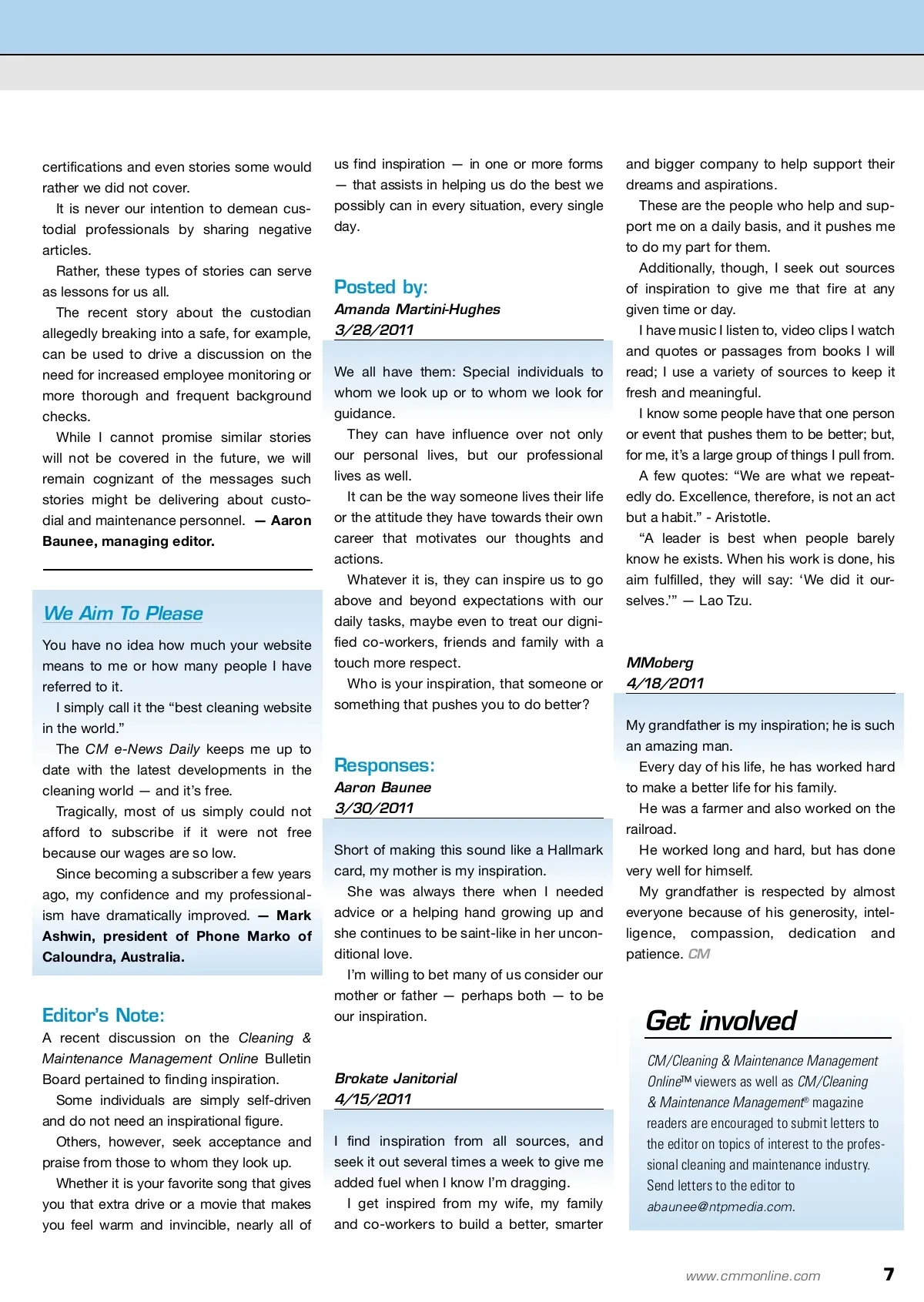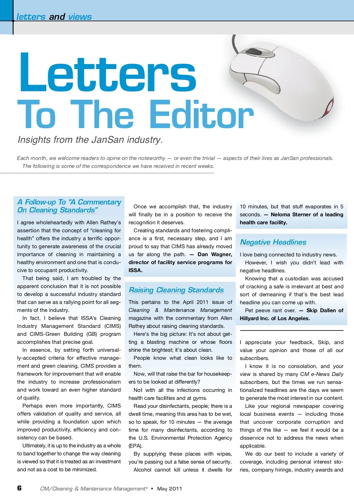 letters and views Letters Insights from the JanSan industry. A Follow-up To “A Commentary On Cleaning Standards” I agree wholeheartedly with Allen Rathey’s assertion that the concept of “cleaning for health” offers the industry a terrific oppor-tunity to generate awareness of the crucial importance of cleaning in maintaining a healthy environment and one that is condu-cive to occupant productivity. That being said, I am troubled by the apparent conclusion that it is not possible to develop a successful industry standard that can serve as a rallying point for all seg-ments of the industry. In fact, I believe that ISSA’s Cleaning Industry Management Standard (CIMS) and CIMS-Green Building (GB) program accomplishes that precise goal. In essence, by setting forth universal-ly-accepted criteria for effective manage-ment and green cleaning, CIMS provides a framework for improvement that will enable the industry to increase professionalism and work toward an even higher standard of quality. Perhaps even more importantly, CIMS offers validation of quality and service, all while providing a foundation upon which improved productivity, efficiency and con-sistency can be based. Ultimately, it is up to the industry as a whole to band together to change the way cleaning is viewed so that it is treated as an investment and not as a cost to be minimized. To The Editor Once we accomplish that, the industry will finally be in a position to receive the recognition it deserves. Creating standards and fostering compli-ance is a first, necessary step, and I am proud to say that CIMS has already moved us far along the path. — Dan Wagner, director of facility service programs for ISSA. 10 minutes, but that stuff evaporates in 5 seconds. — Neloma Sterner of a leading health care facility. Each month, we welcome readers to opine on the noteworthy — or even the trivial — aspects of their lives as JanSan professionals. The following is some of the correspondence we have received in recent weeks. Negative Headlines I love being connected to industry news. However, I wish you didn’t lead with negative headlines. Knowing that a custodian was accused of cracking a safe is irrelevant at best and sort of demeaning if that’s the best lead headline you can come up with. Pet peeve rant over. — Skip Dallen of Hillyard Inc. of Los Angeles. Raising Cleaning Standards This pertains to the April 2011 issue of Cleaning & Maintenance Management magazine with the commentary from Allen Rathey about raising cleaning standards. Here’s the big picture: It’s not about get-ting a blasting machine or whose floors shine the brightest; it’s about clean. People know what clean looks like to them. Now, will that raise the bar for housekeep-ers to be looked at differently? Not with all the infections occurring in health care facilities and at gyms. Read your disinfectants, people; there is a dwell time, meaning this area has to be wet, so to speak, for 10 minutes — the average time for many disinfectants, according to the U.S. Environmental Protection Agency (EPA). By supplying these places with wipes, you’re passing out a false sense of security. Alcohol cannot kill unless it dwells for I appreciate your feedback, Skip, and value your opinion and those of all our subscribers. I know it is no consolation, and your view is shared by many CM e-News Daily subscribers, but the times we run sensa-tionalized headlines are the days we seem to generate the most interest in our content. Like your regional newspaper covering local business events — including those that uncover corporate corruption and things of the like — we feel it would be a disservice not to address the news when applicable. We do our best to include a variety of coverage, including personal interest sto-ries, company hirings, industry awards and 6 CM/Cleaning & Maintenance Management ® • May 2011